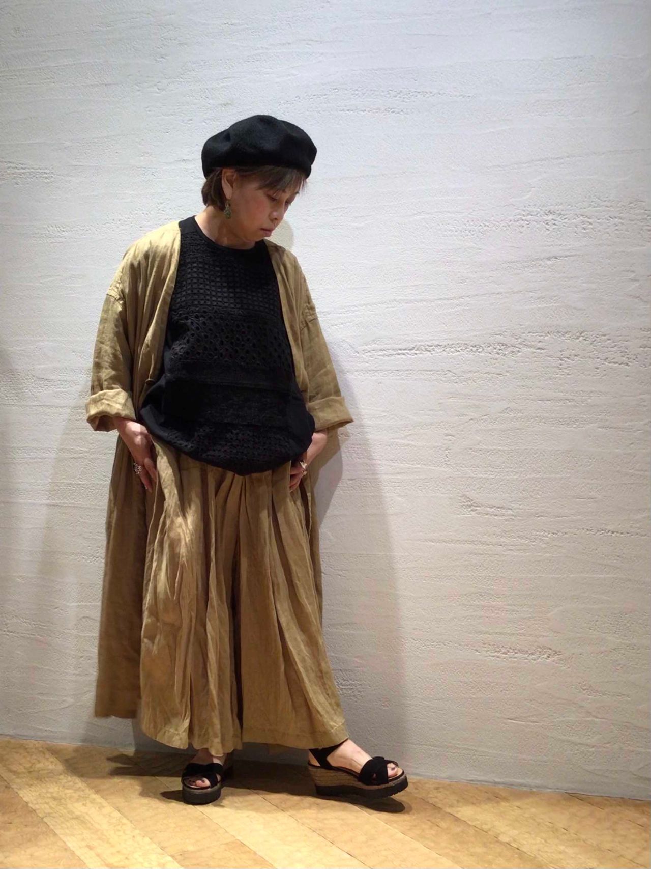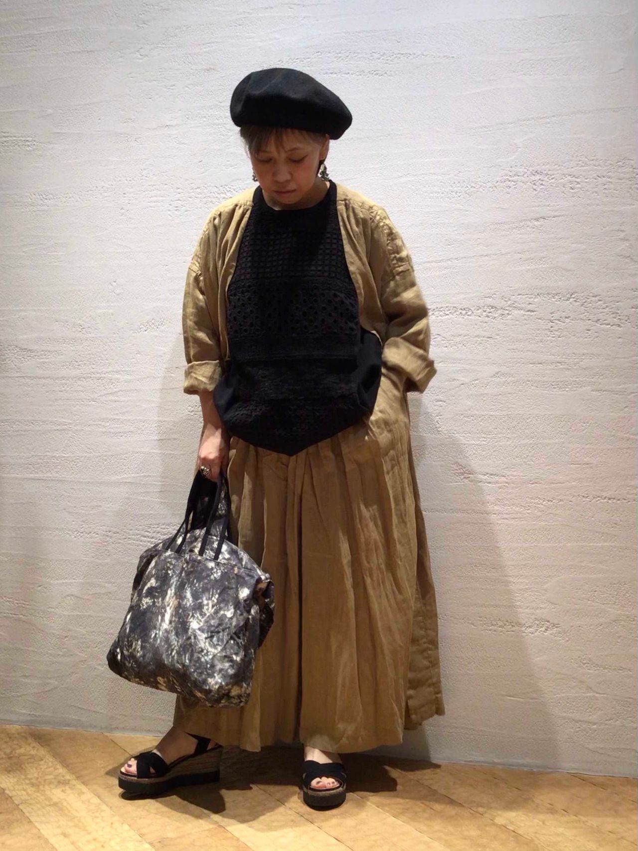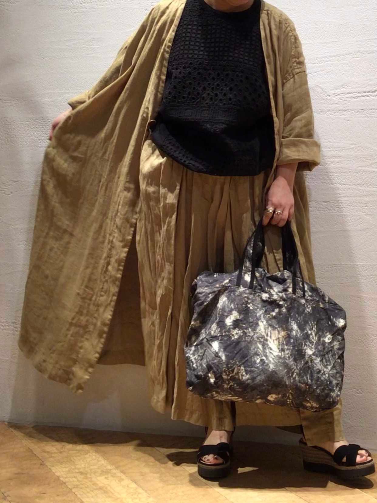 小物をブラックで統一することで、フレンチリネンの柔らかい素材感が際立ち軽やかな印象になります。