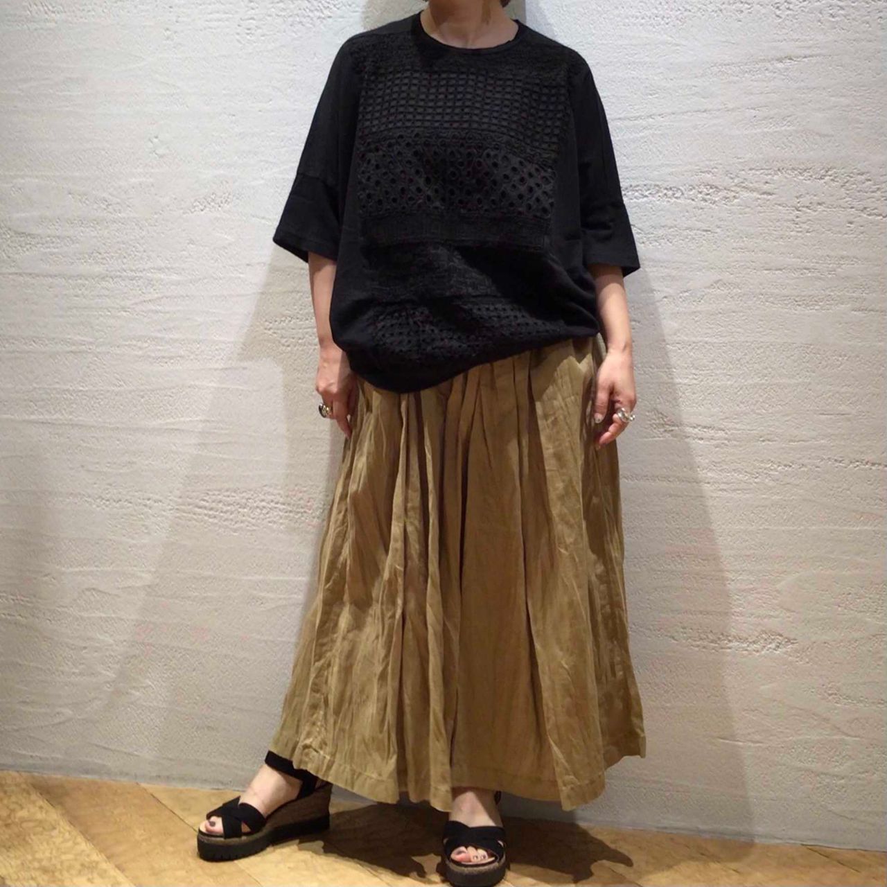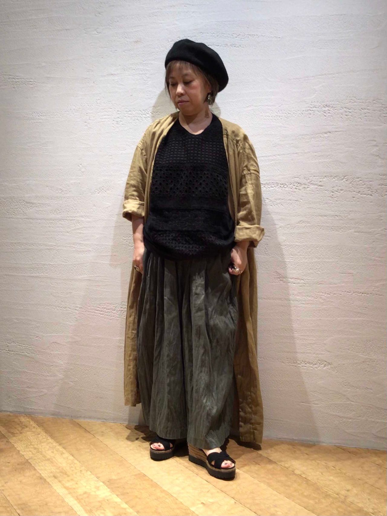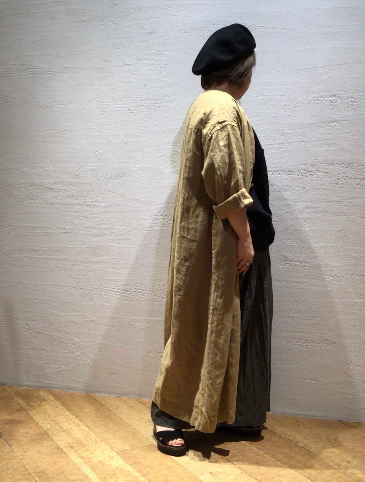 小物をブラックで統一することで、フレンチリネンの柔らかい素材感が際立ち軽やかな印象になります。