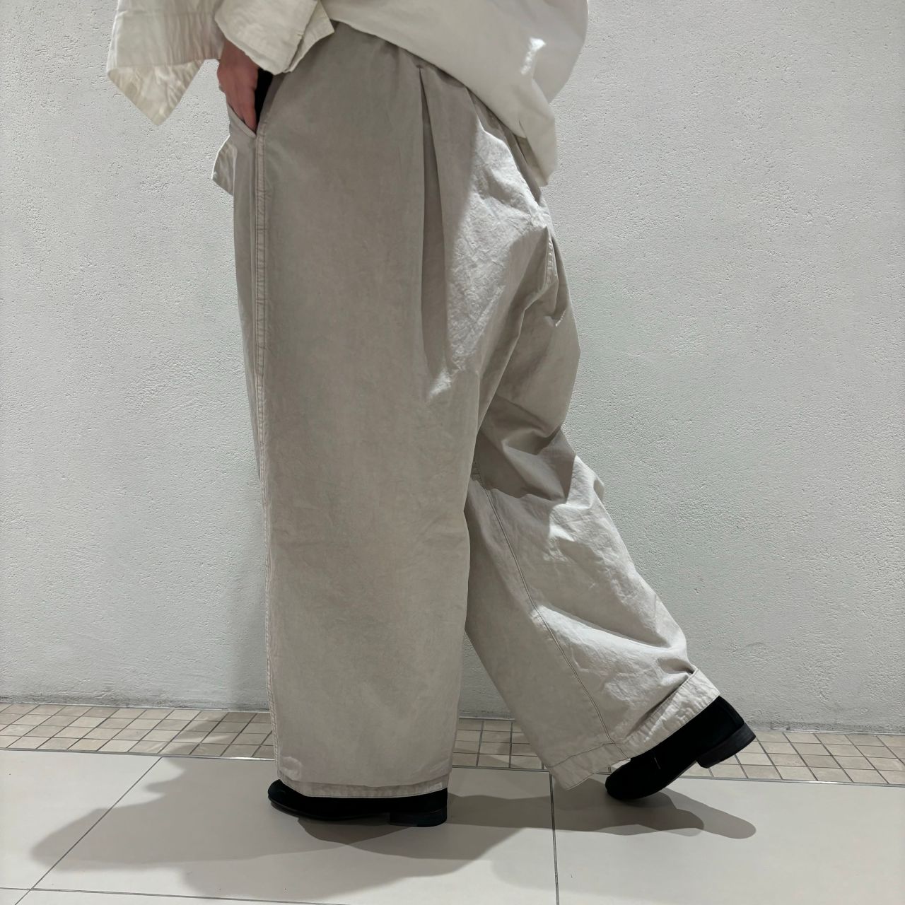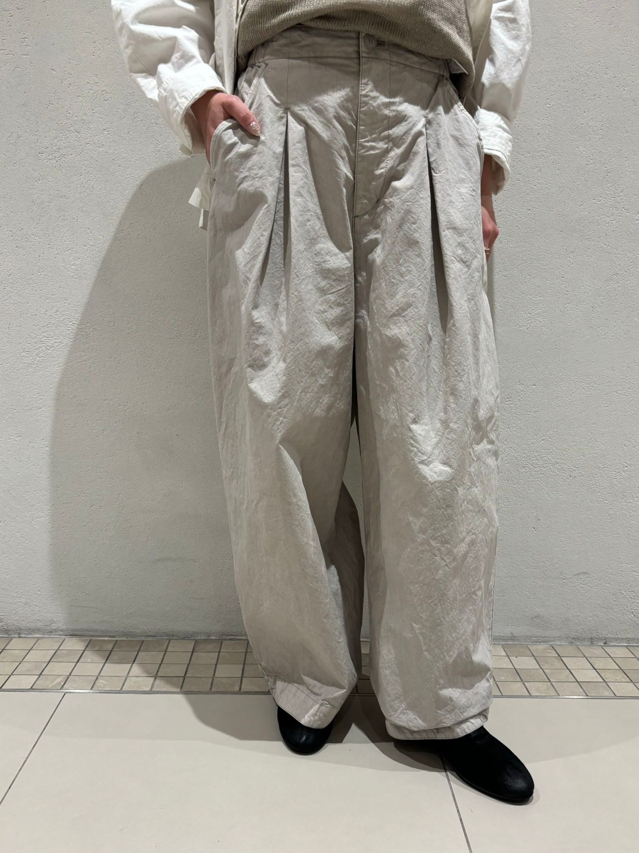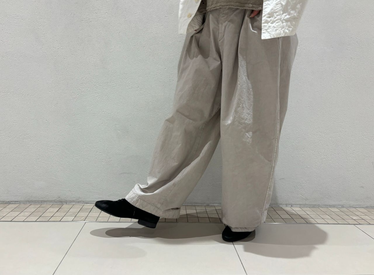 前後にインバーテッドタックの入ったボリューム感のあるワイドパンツ。
