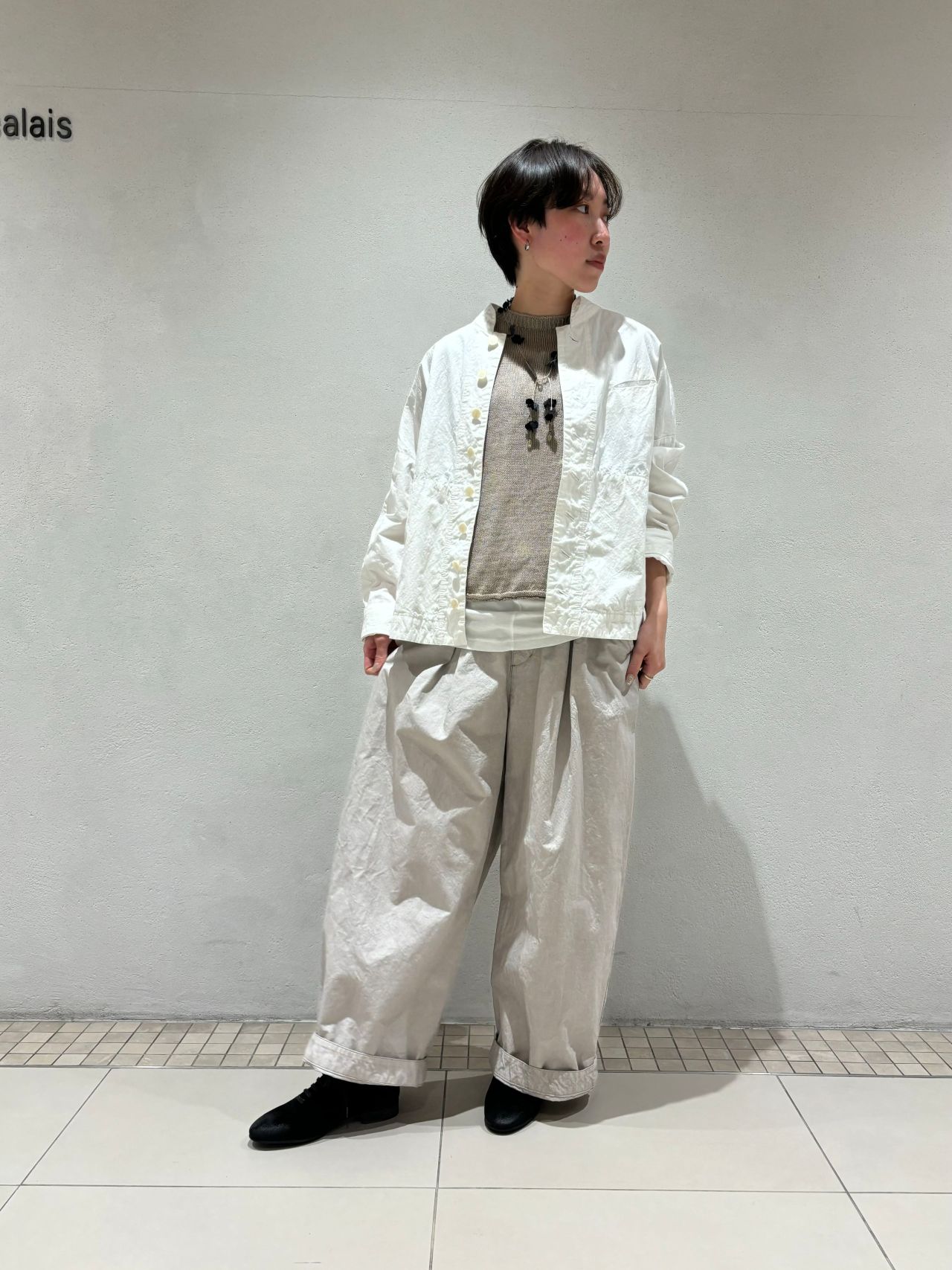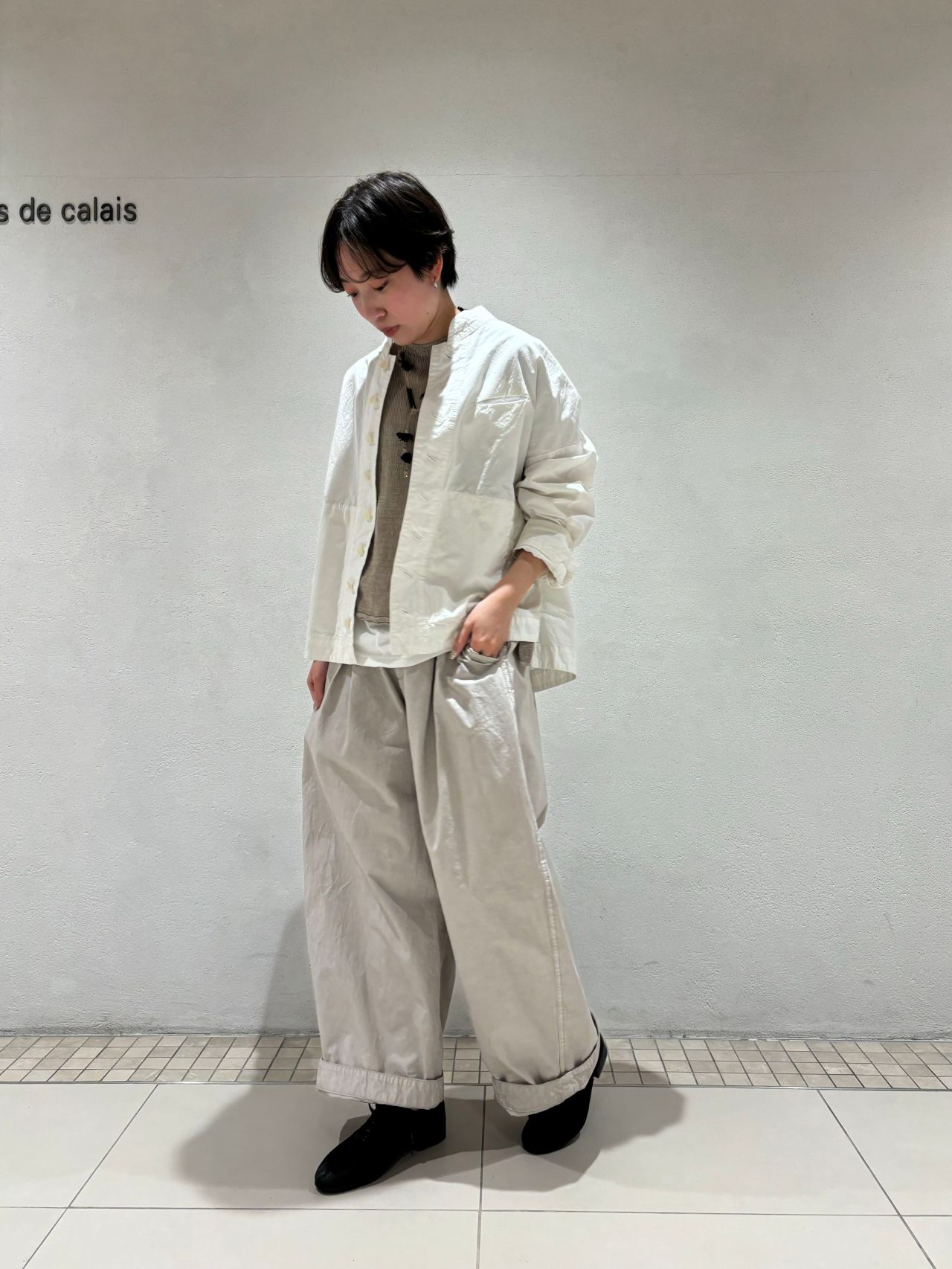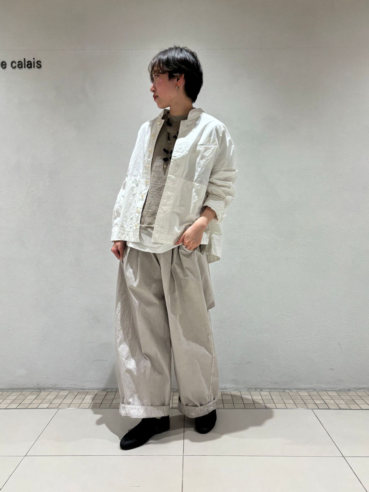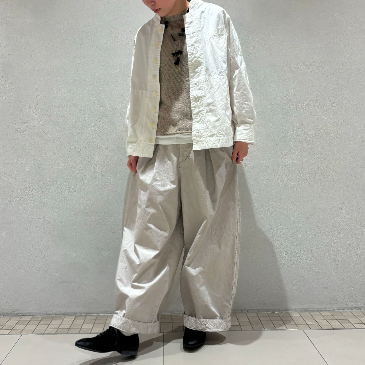 今回は春を意識して、同素材のワイドパンツ、リネンのニットと合わせました。