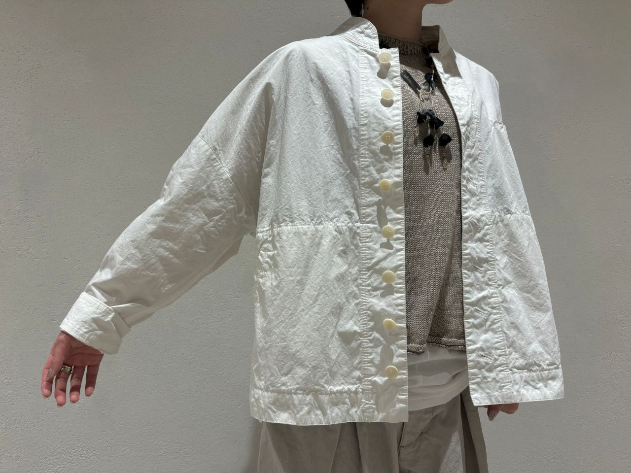 寒暖差のあるこの季節、厚手のインナーを合わせて。ボタンを閉めてブラウス感覚でも。