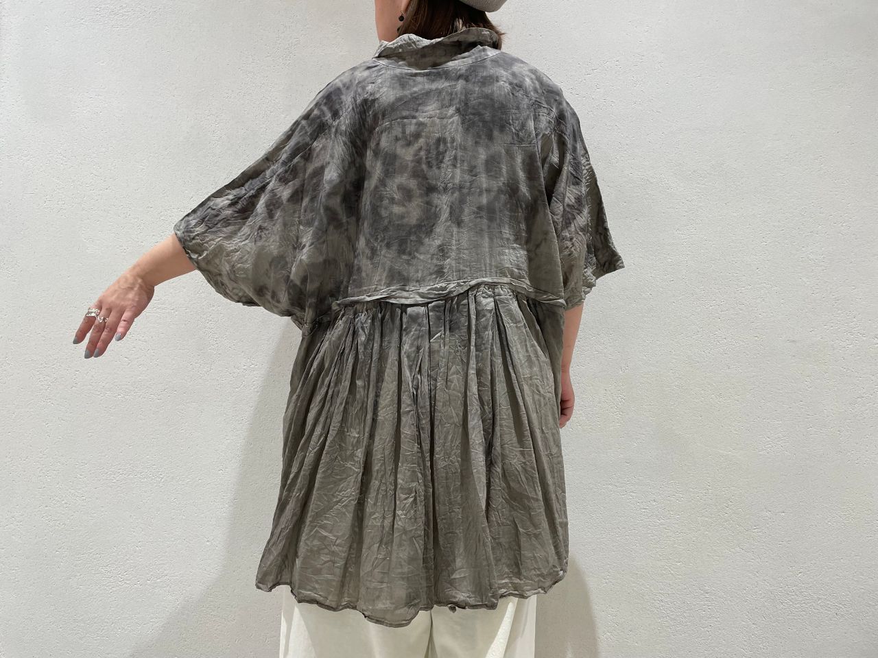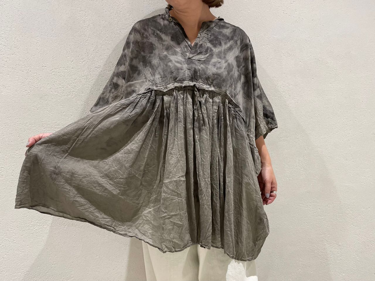 胸元に大きくギャザーを取り、フレア感が綺麗なシルエット。