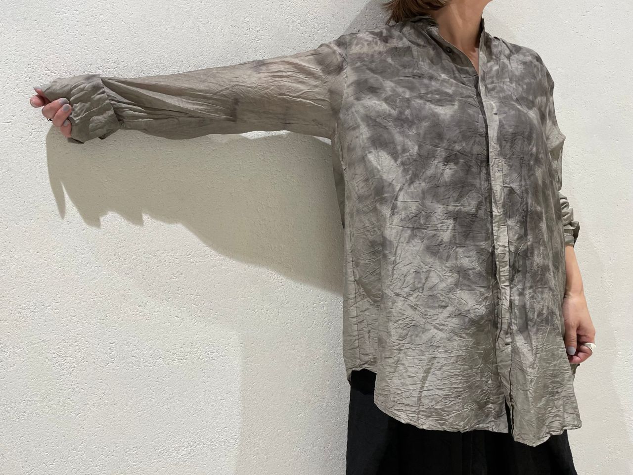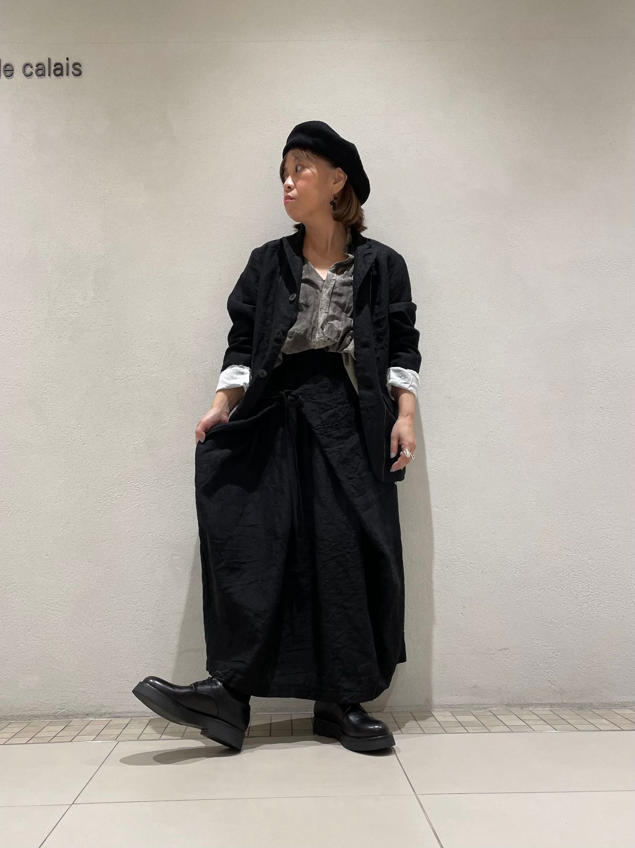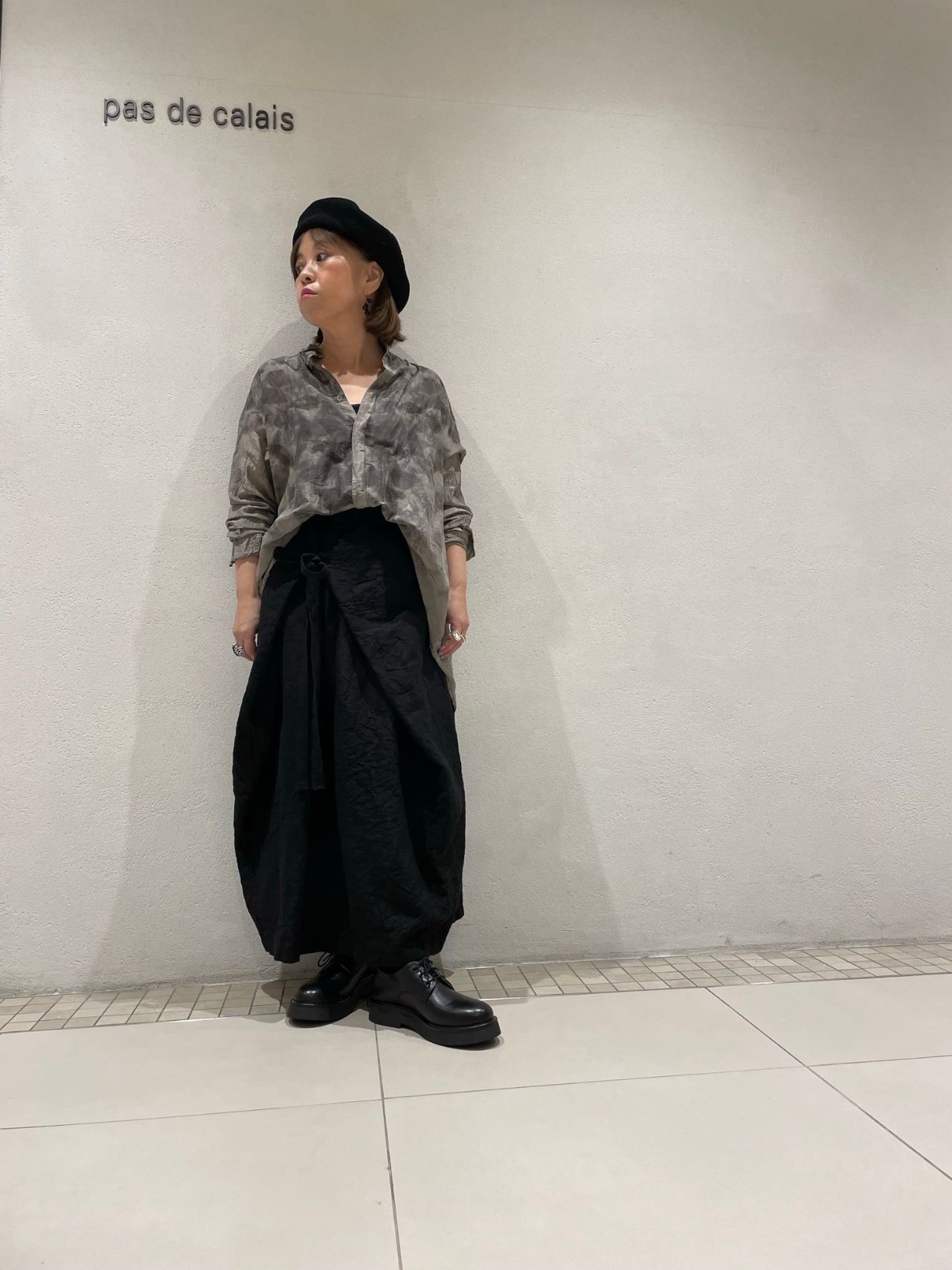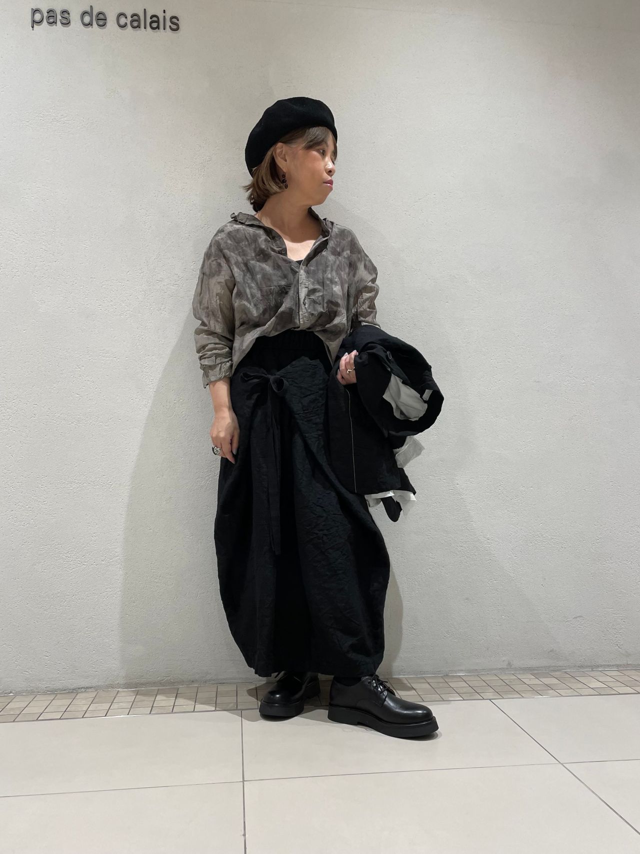 今回はリネンのラップスカートと合わせ、ブラウスの裾をインし、シックなスタイルに仕上げました。