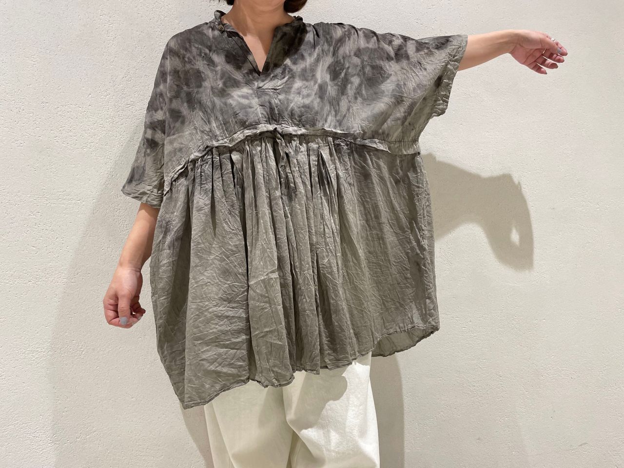 ウエスト切り替え部分に紐を通しているので、ボトムスに合わせてシルエットを変え、コーディネートを楽しめる万能なブラウスです。