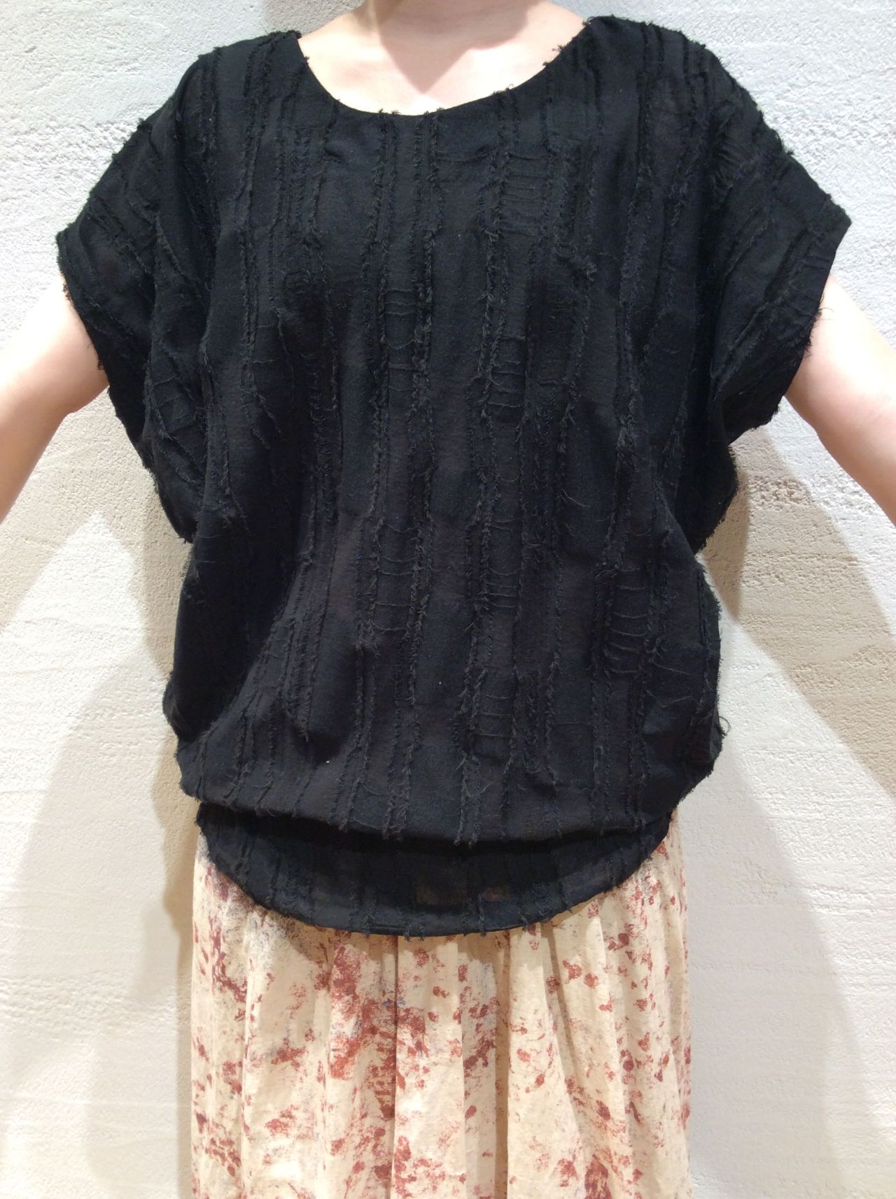 シンプルなTシャツに見えますが、よく見ると柄がフリンジ調に。