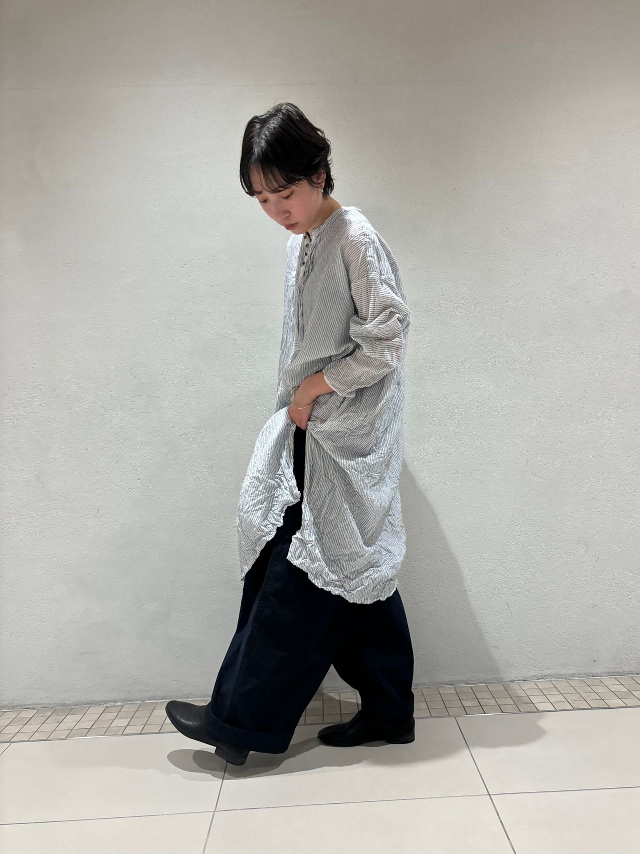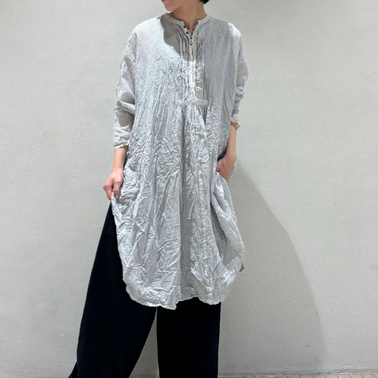 お尻が隠れるたっぷりとした丈感を活かし、リネンベストを重ね着しました。