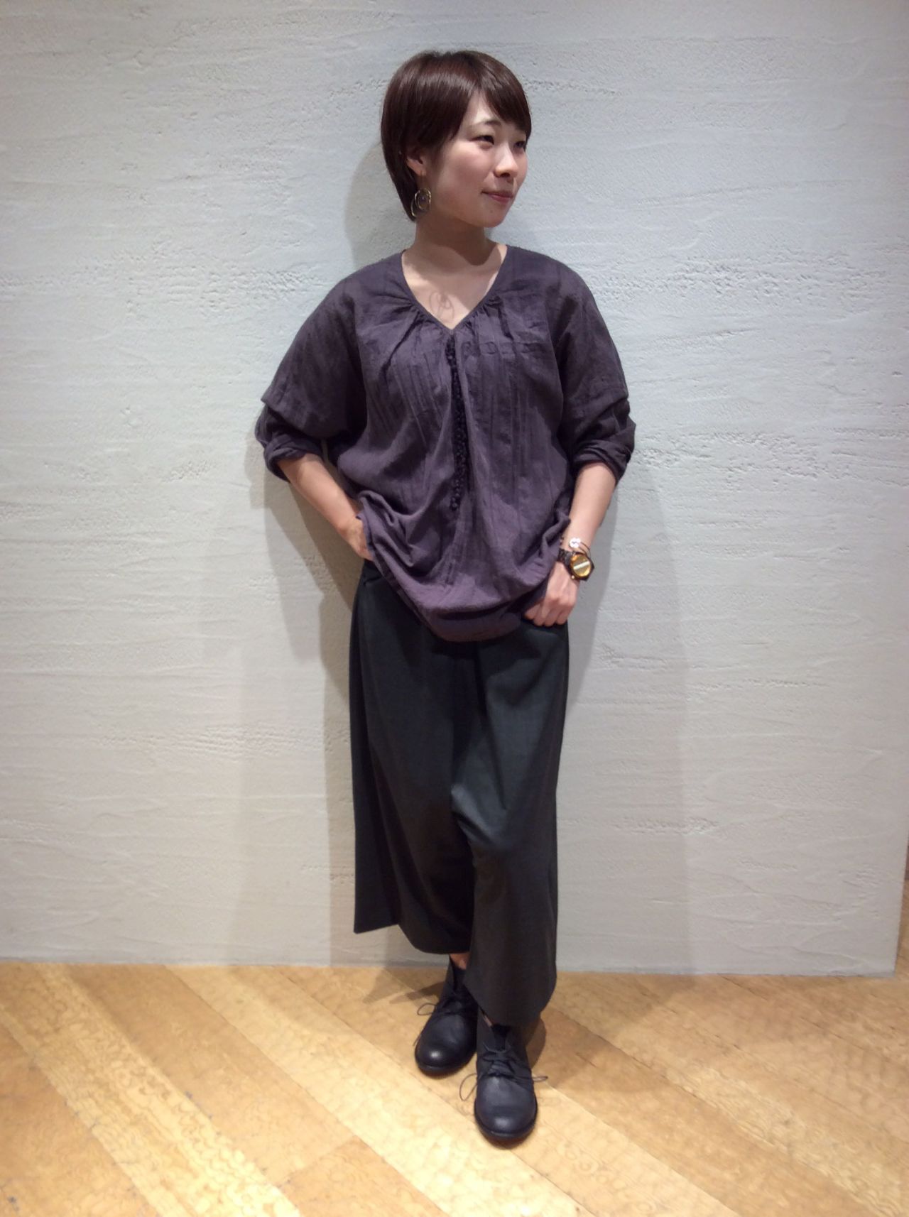 光沢あるとろみのある生地感なので、サルエルなのにカジュアル過ぎず着ていただけますよ。