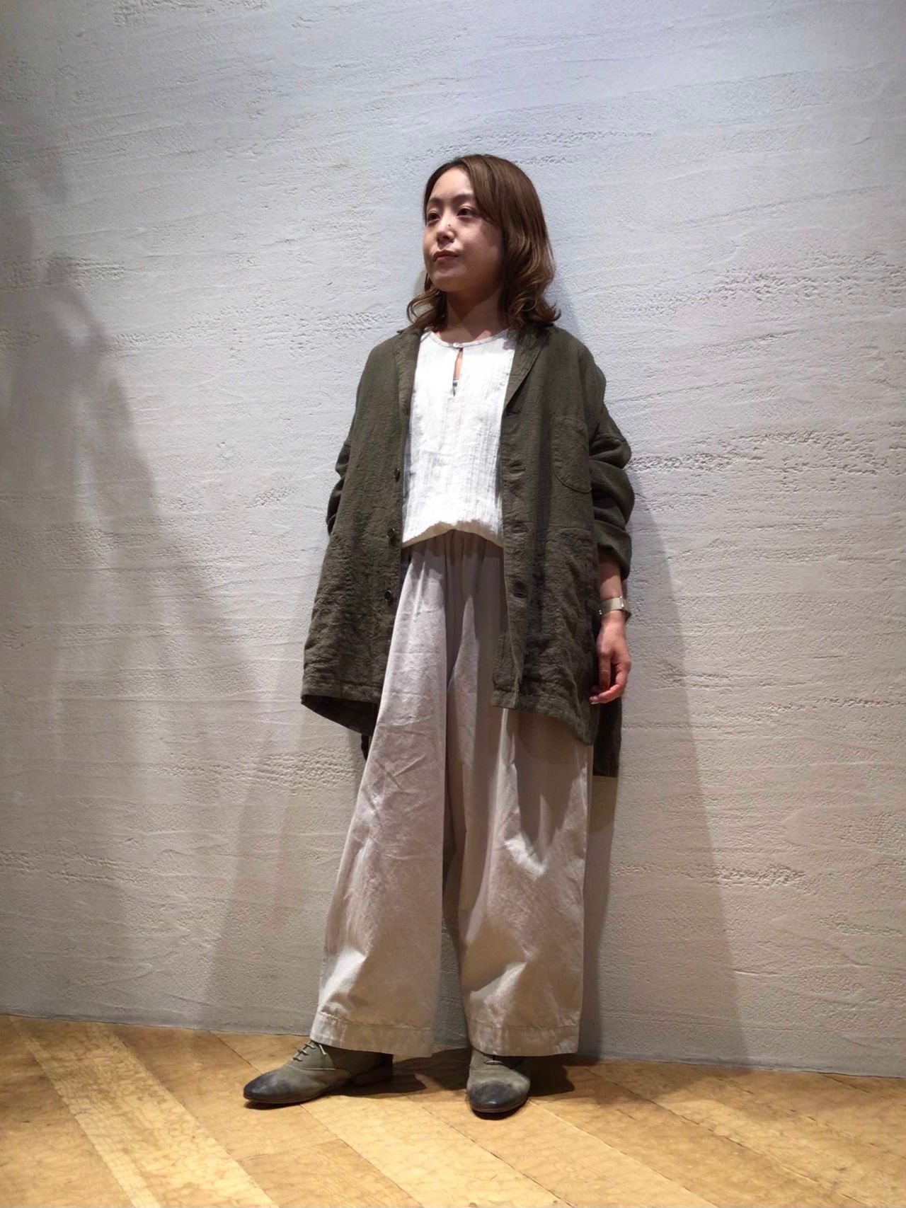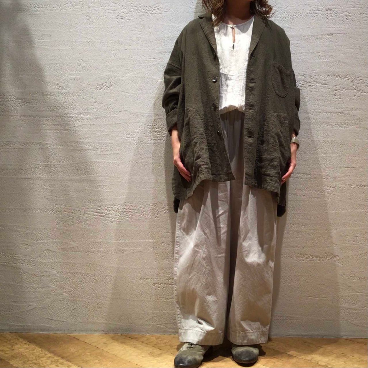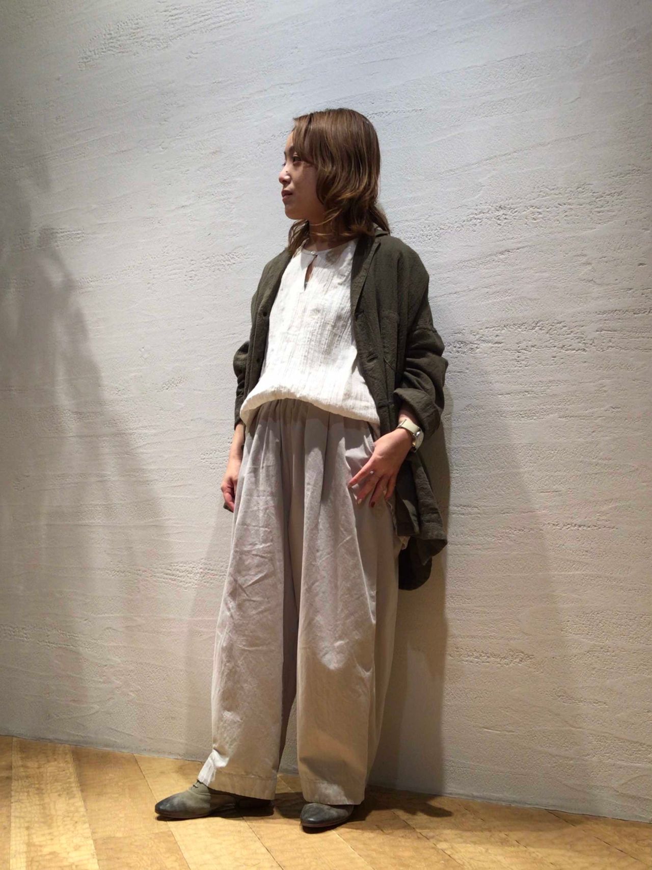 二の腕周りがゆったりなデザインになっており、これからの時期にはニットとの合わせもオススメです。