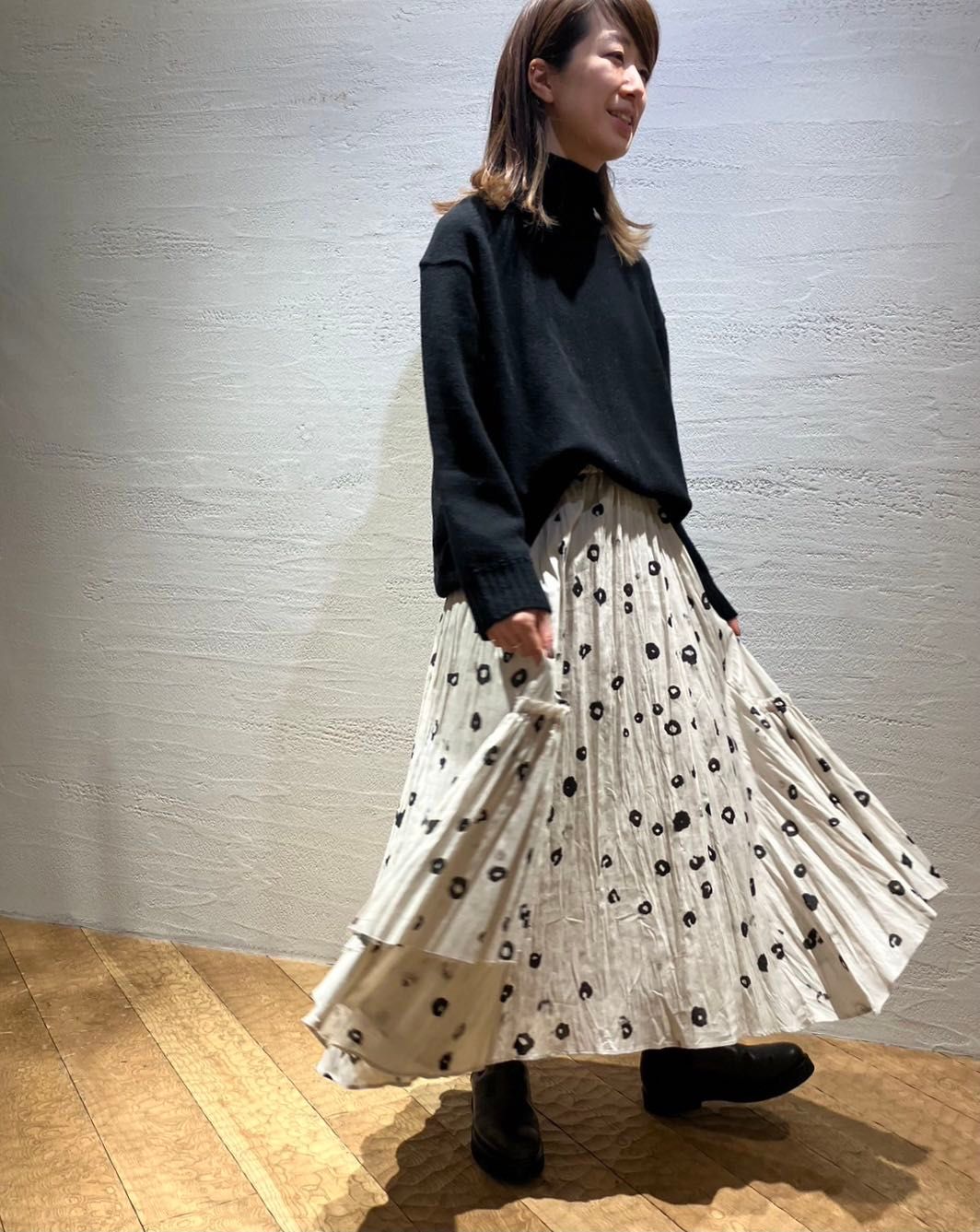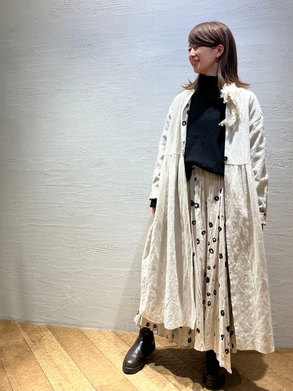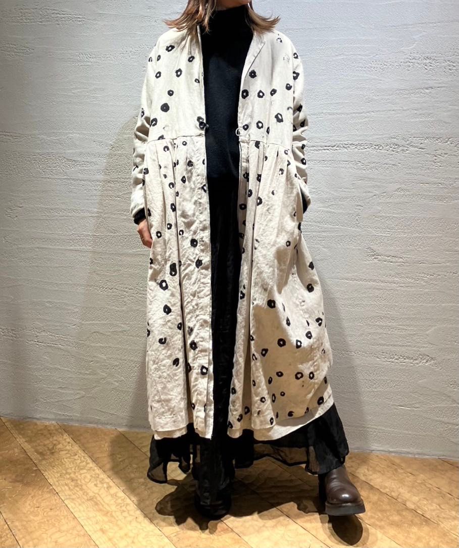 ボイルリングドットの柄が目を惹くイレギュラーヘムのフレアギャザースカートに同柄のリバーシブルコートと合わせました。