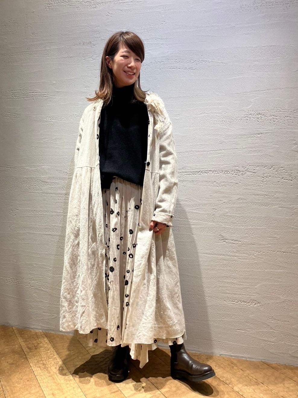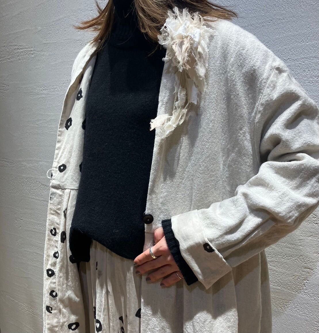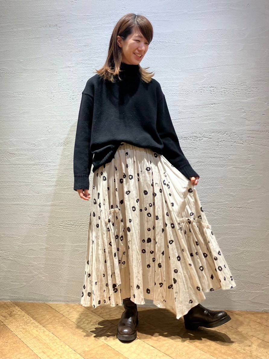 ボイルリングドットの柄が目を惹くイレギュラーヘムのフレアギャザースカートに同柄のリバーシブルコートと合わせました。