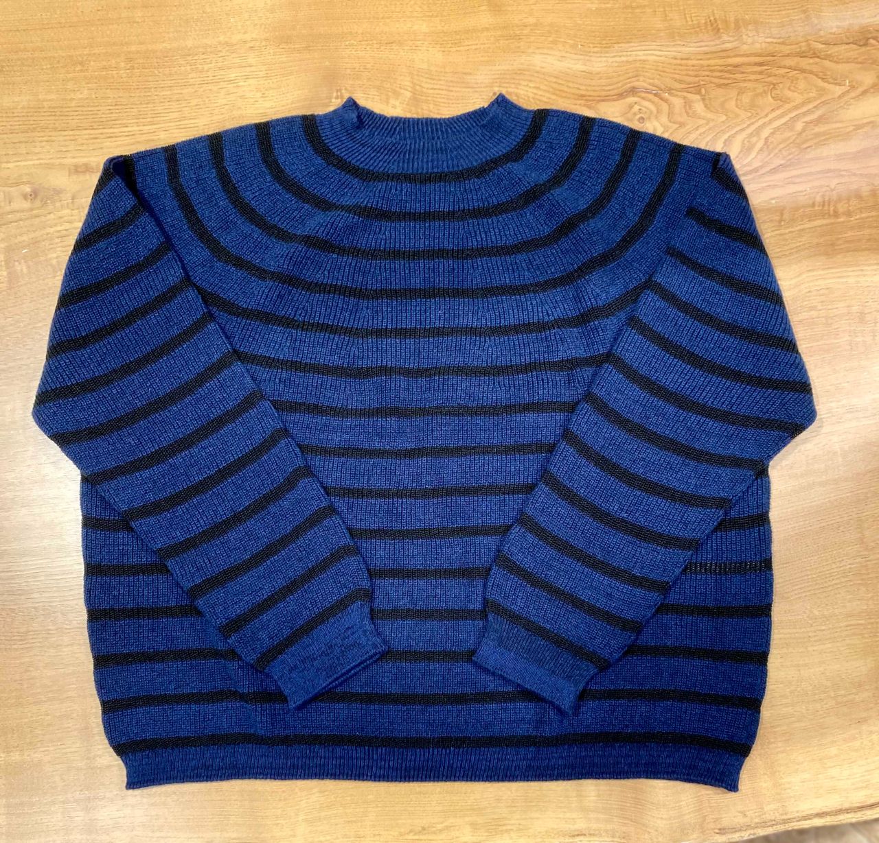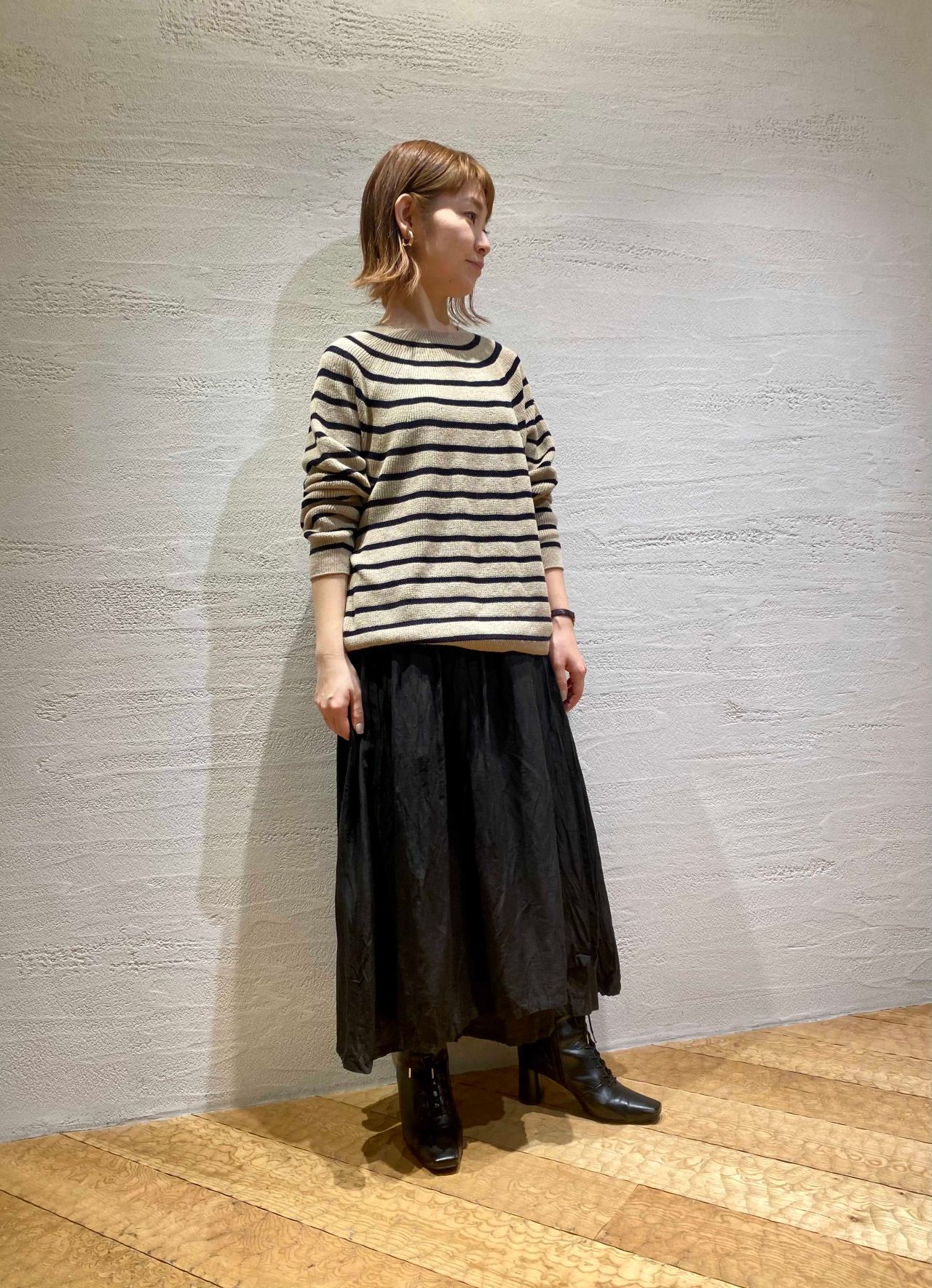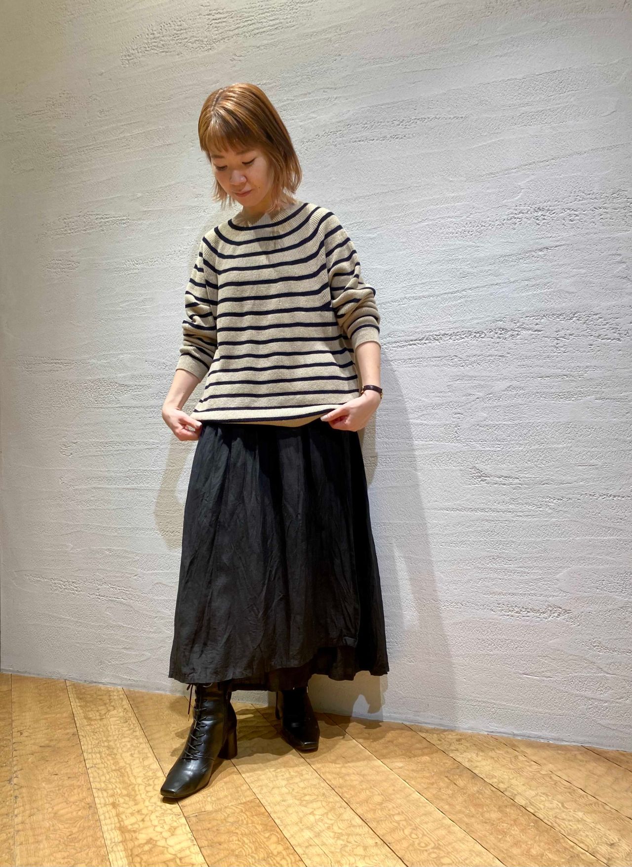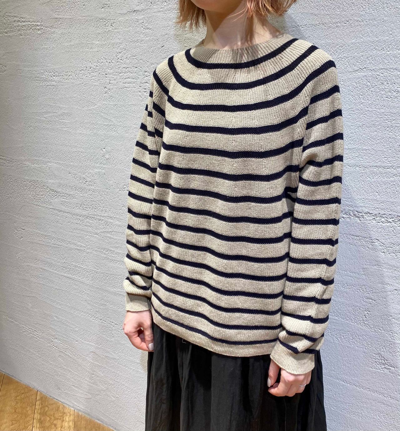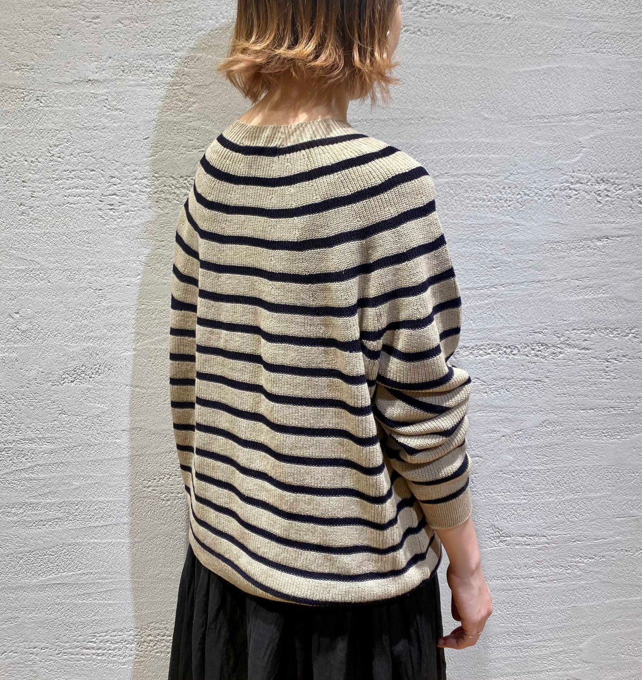 柄編みのテクニックで絶妙に歪ませたボーダーが遊び心のあるニット。