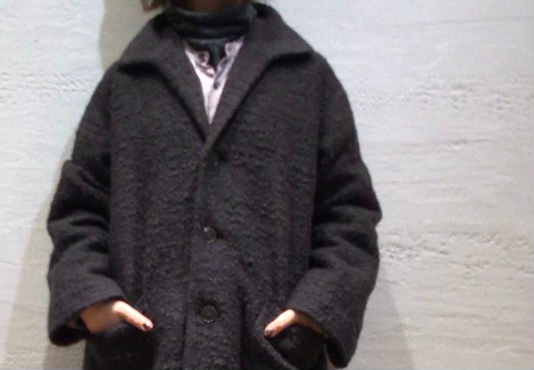 ロービング糸と、スラブ糸の形状の違いにより縮絨する事で凹凸が出来、アストラカンのようなループ状の巻き毛、玉状の表情豊かな軽いコートです。