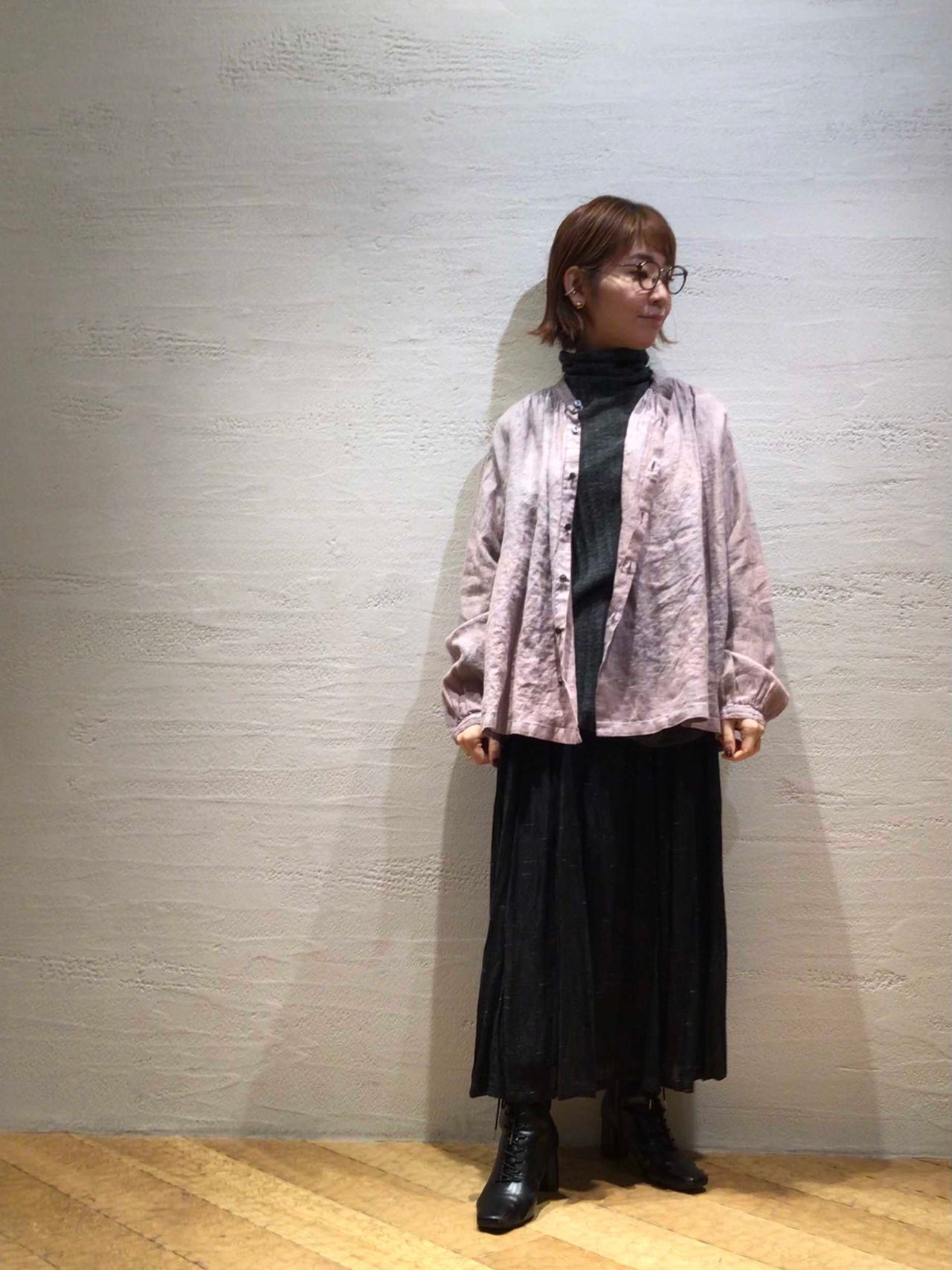 綺麗な色のスタンドカラーシャツは冬のダークなコーディネートの差し色にぴったり!