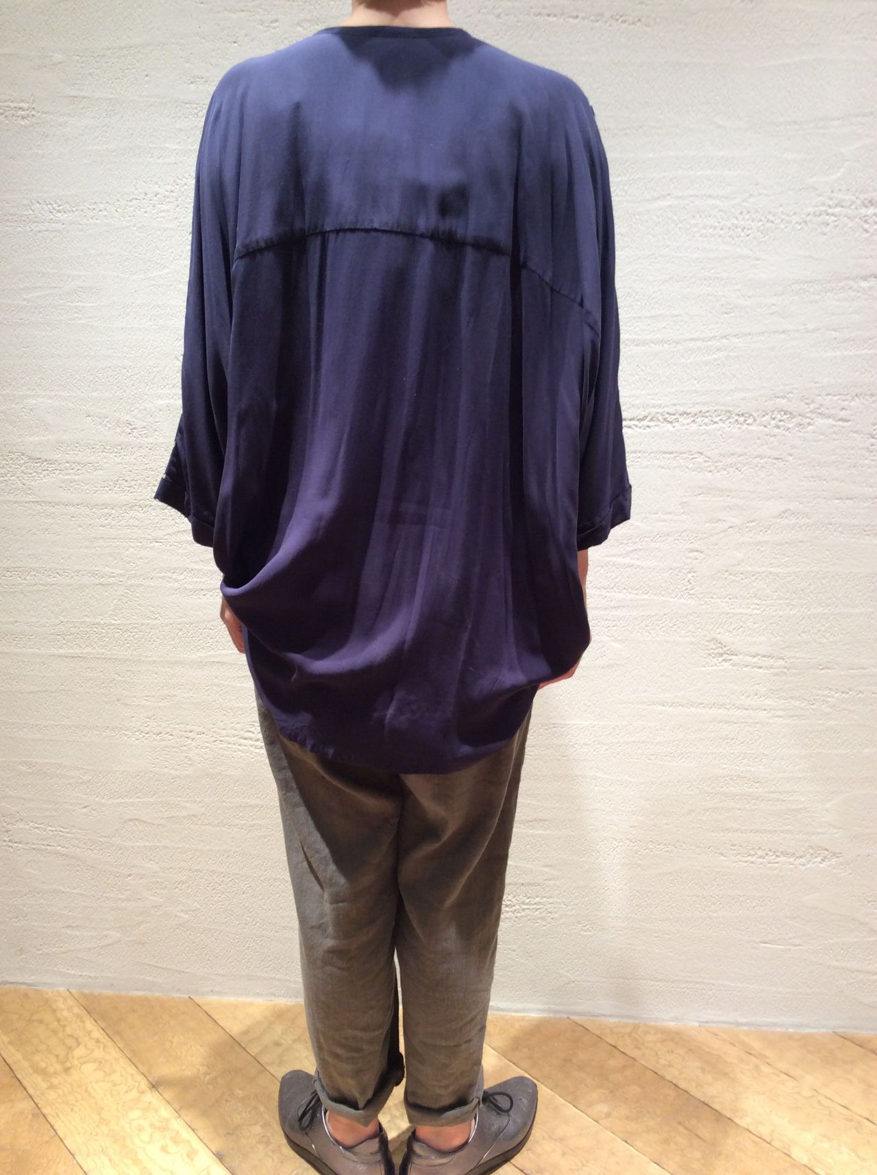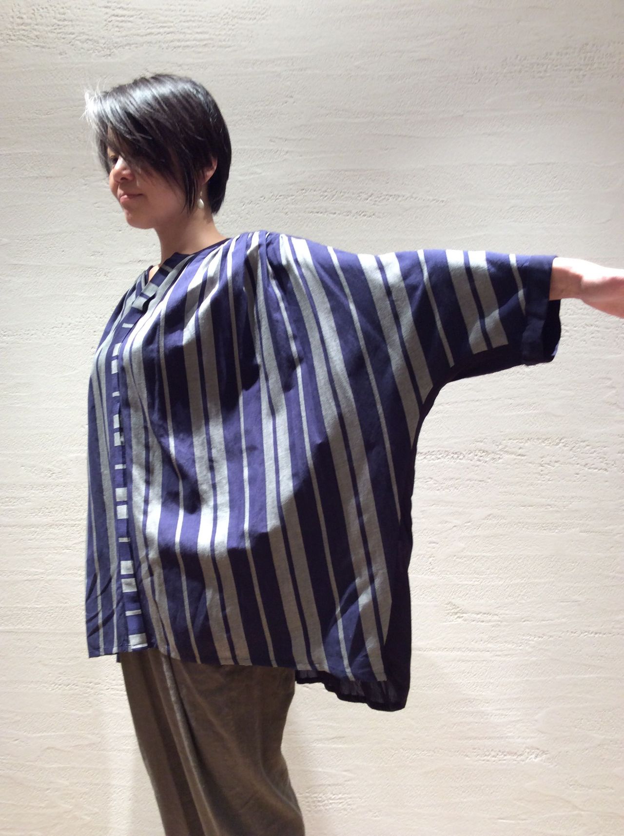 ドルマンスリーブでワイドシルエットの前開きのブラウス。