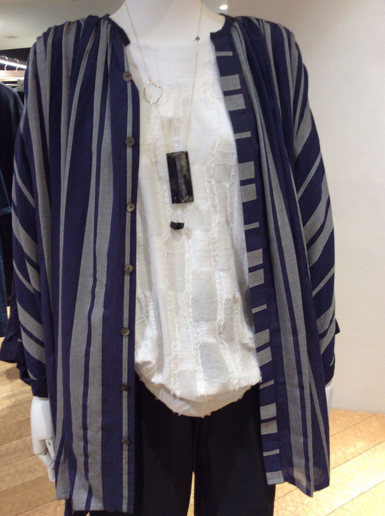 ストライプとボーダーの切り替えの柄もインパクトがあり、絵になる1枚です。