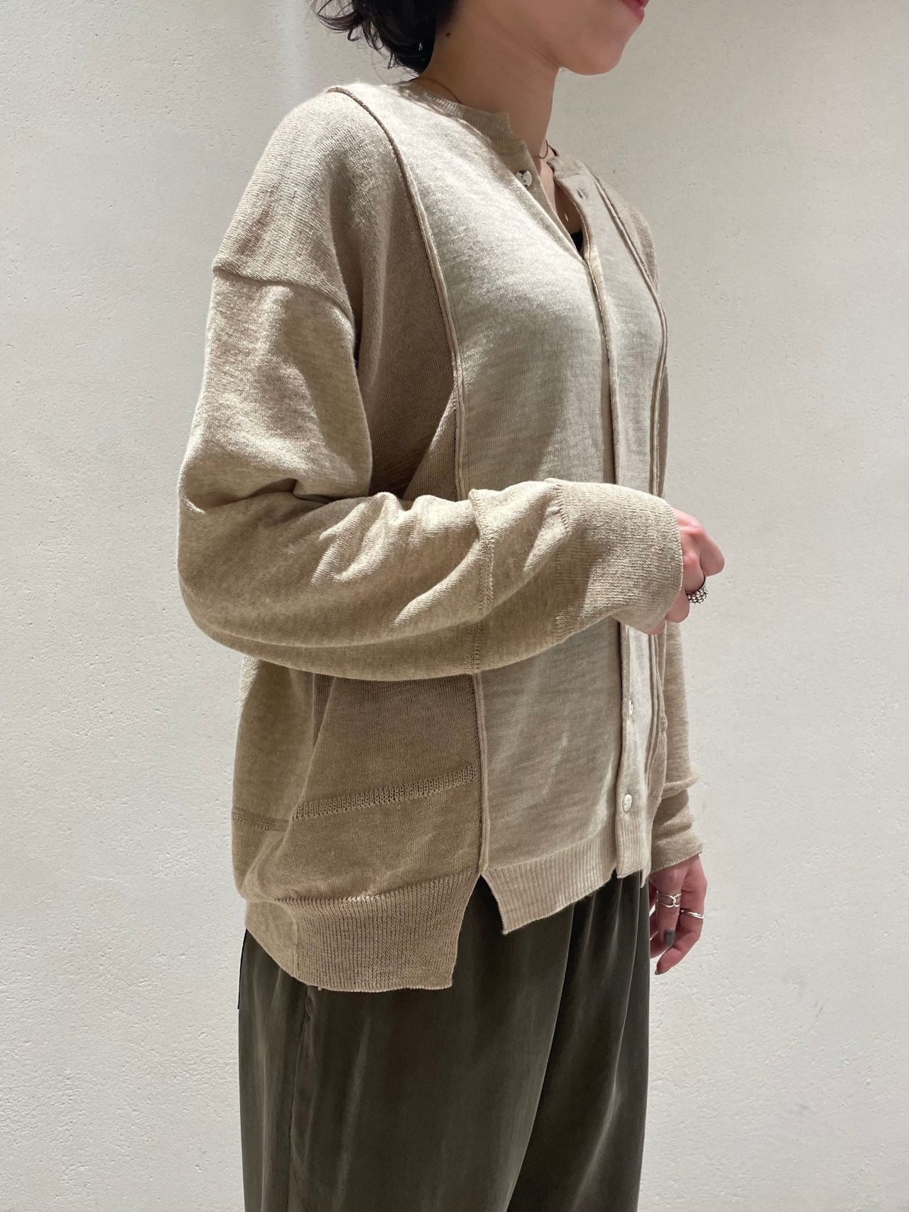 大胆なアシンメトリーのカーディガンは、絶妙なカラーの変化で主役のアイテムとしても◎