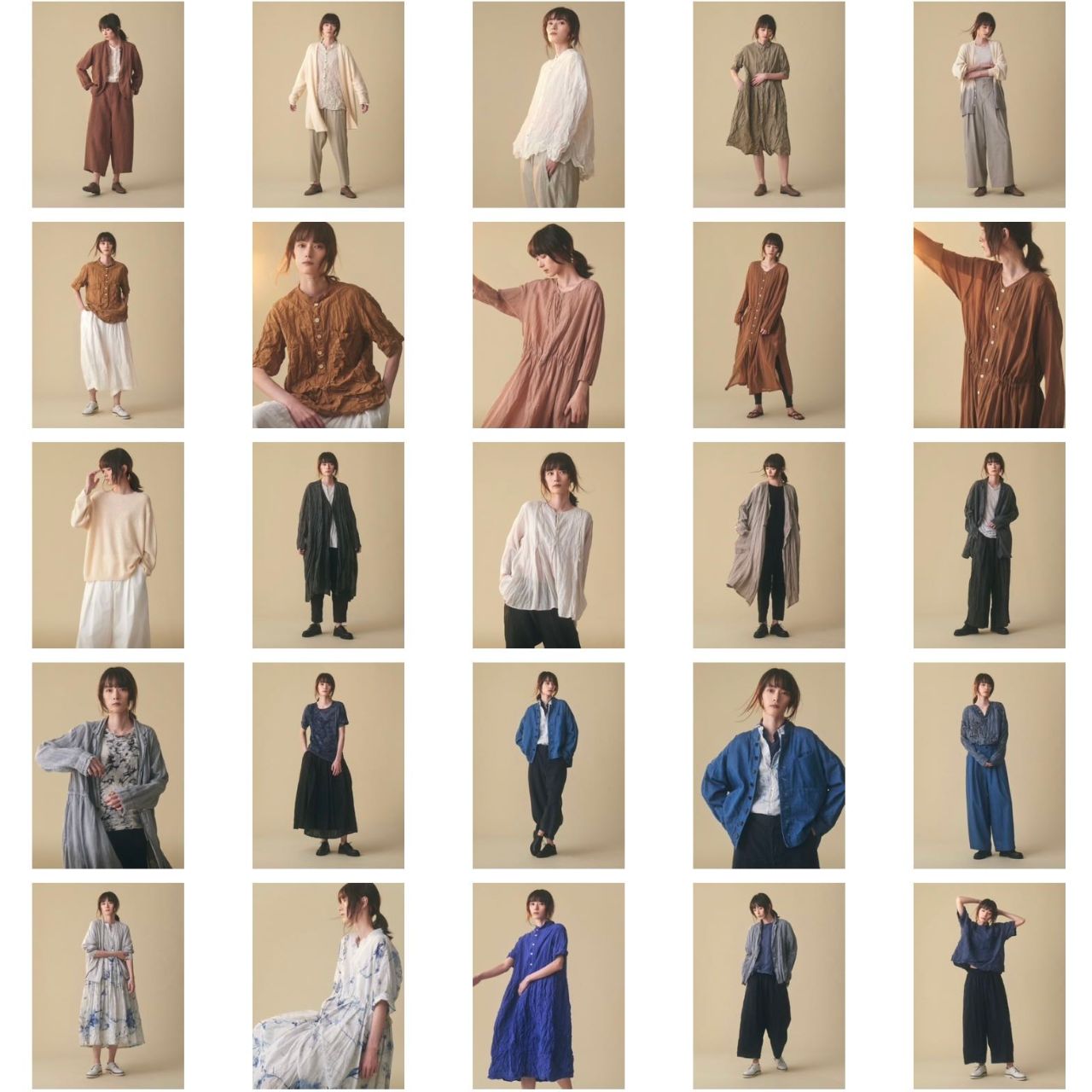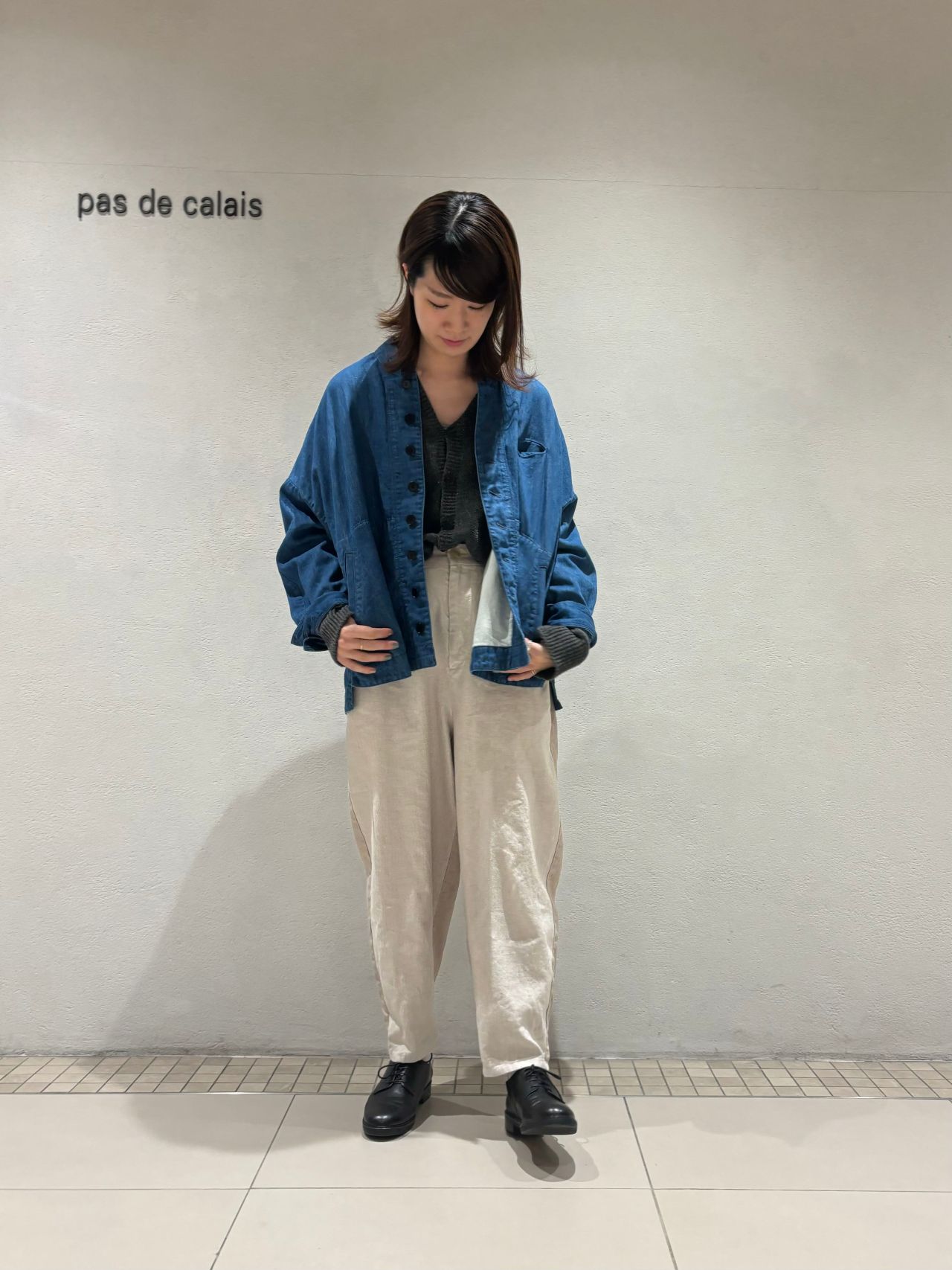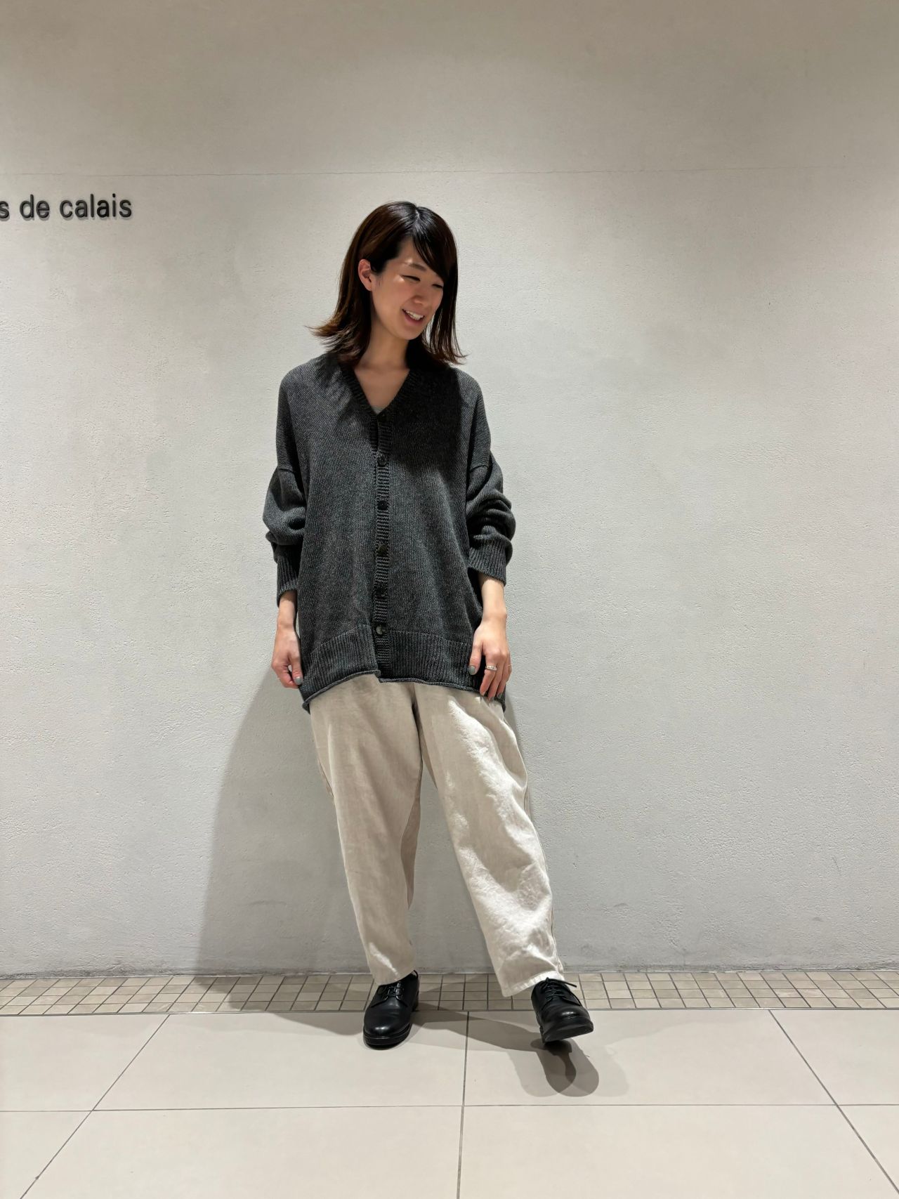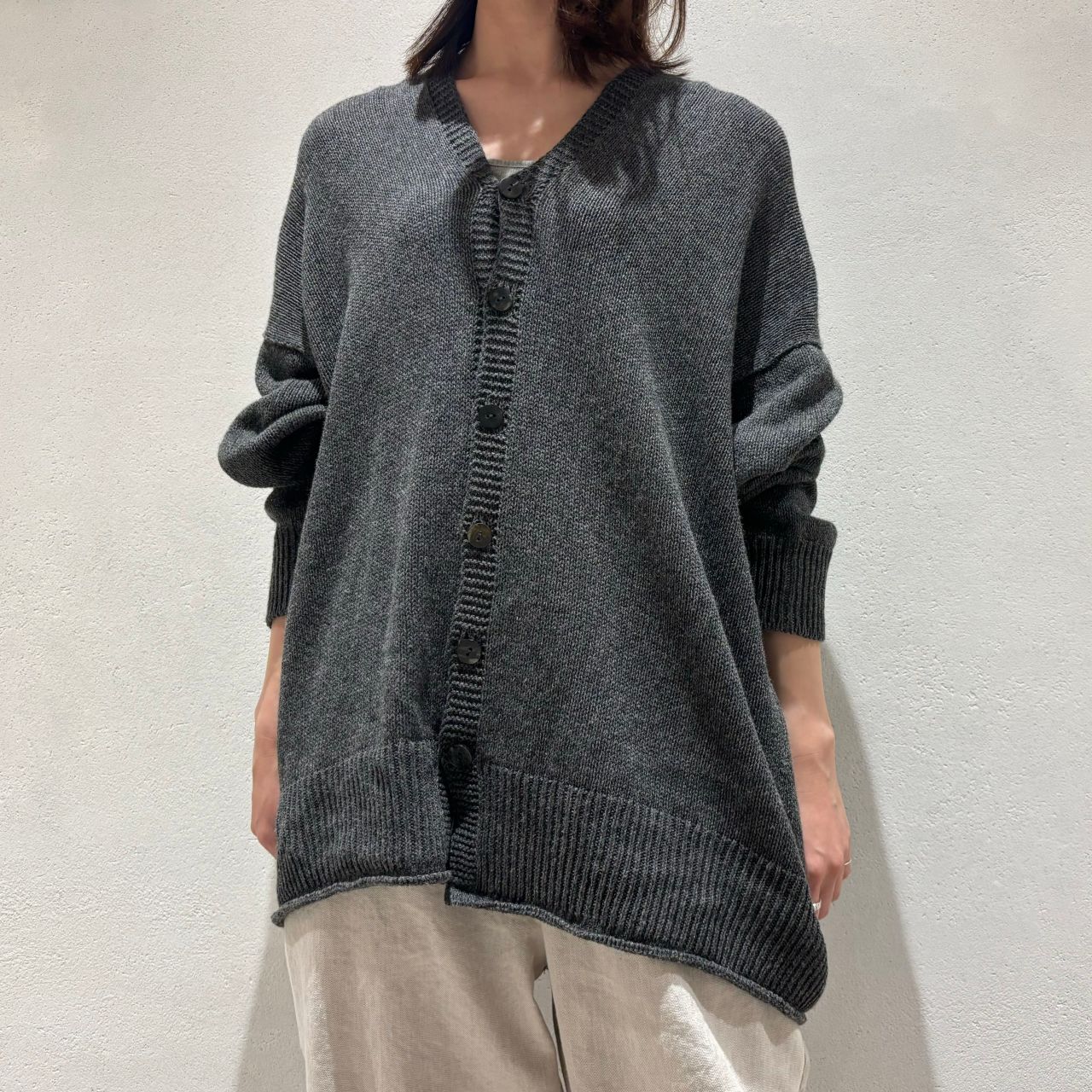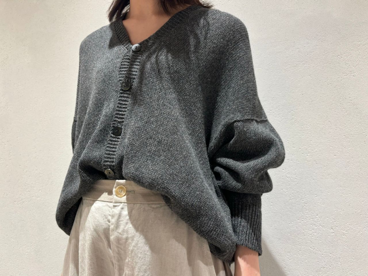 リネンウールカーディガンをワンピースに合わせたコーディネートも併せてご覧ください。