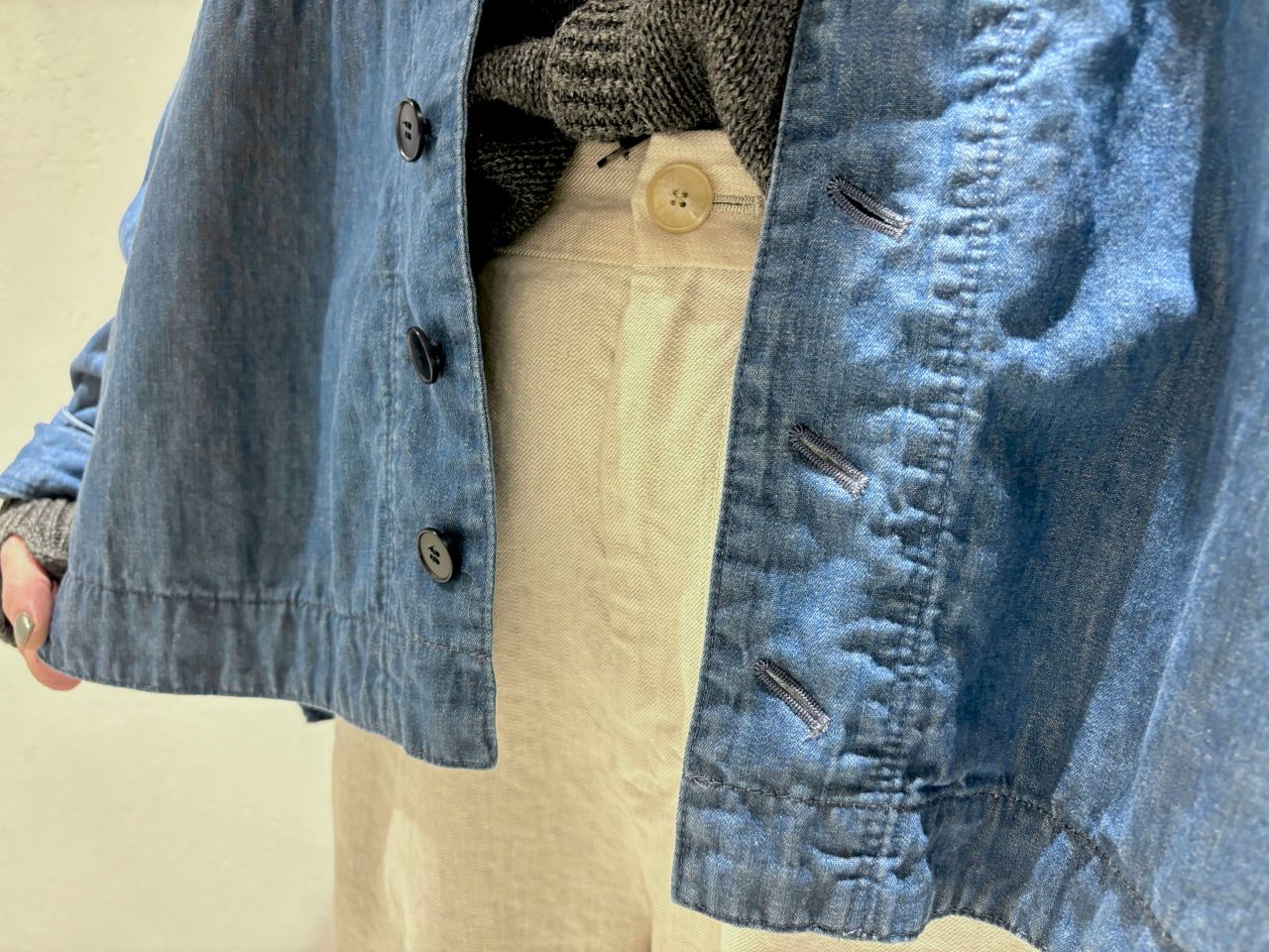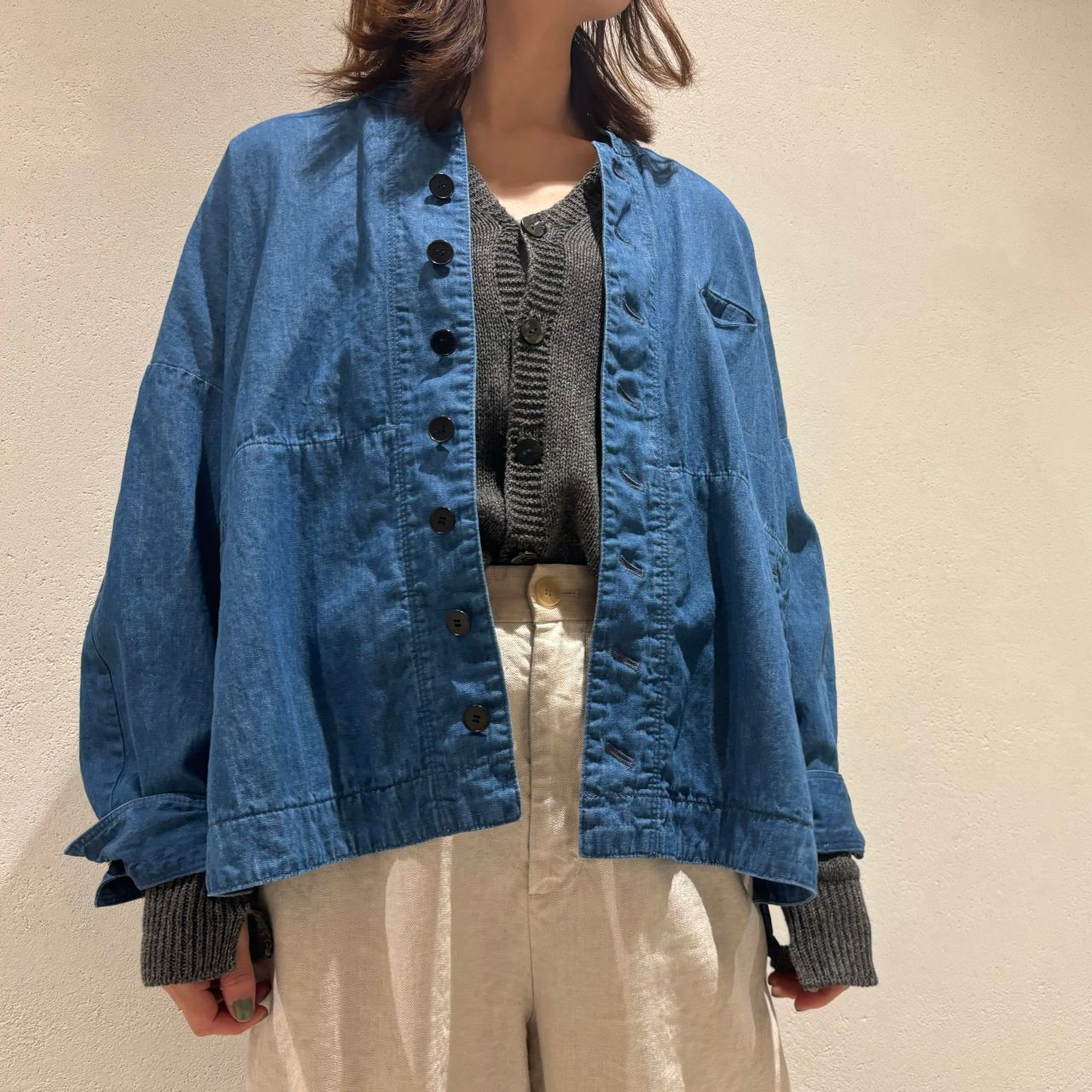 リネン×ウール素材のカーディガンをプルオーバーとして、ジャケットのインナーで着用しました。