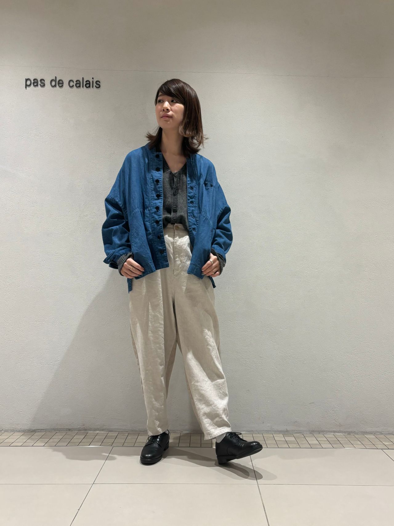 スタンドカラーとたっぷりとした身幅でメンズライクなシルエット。