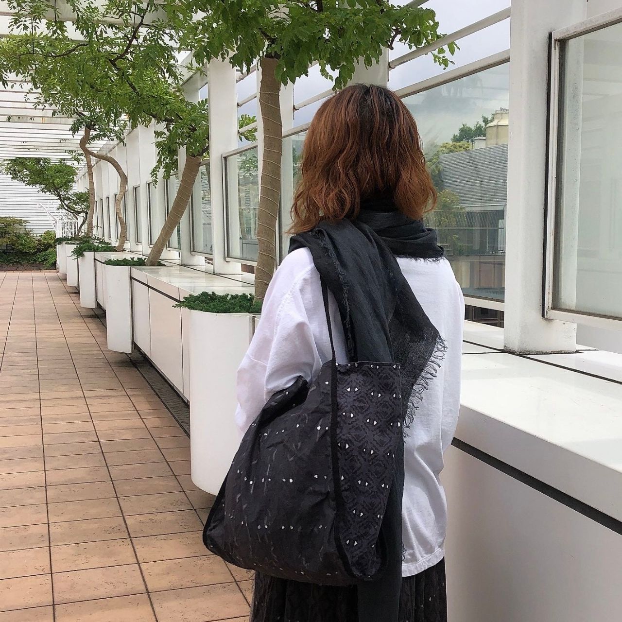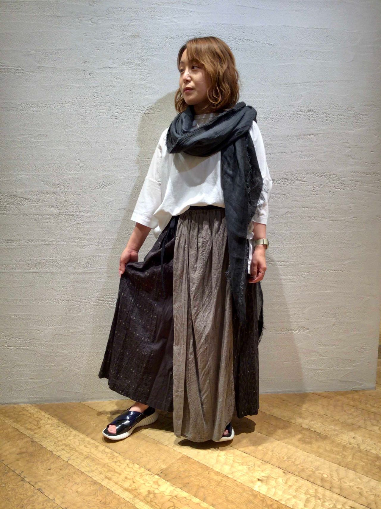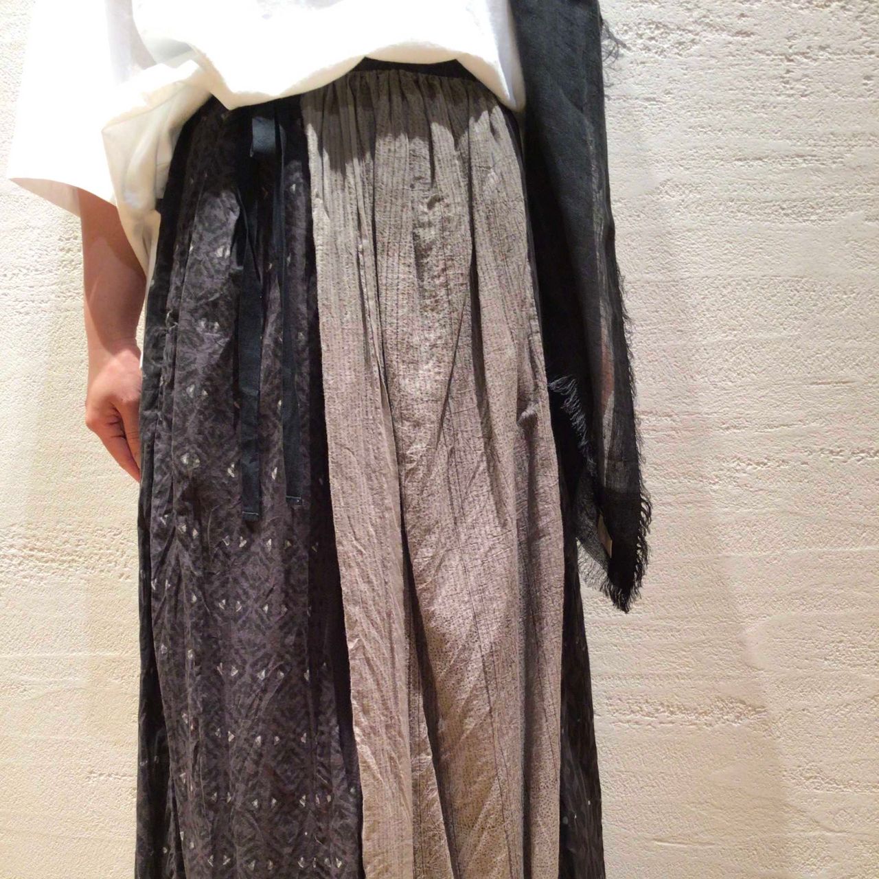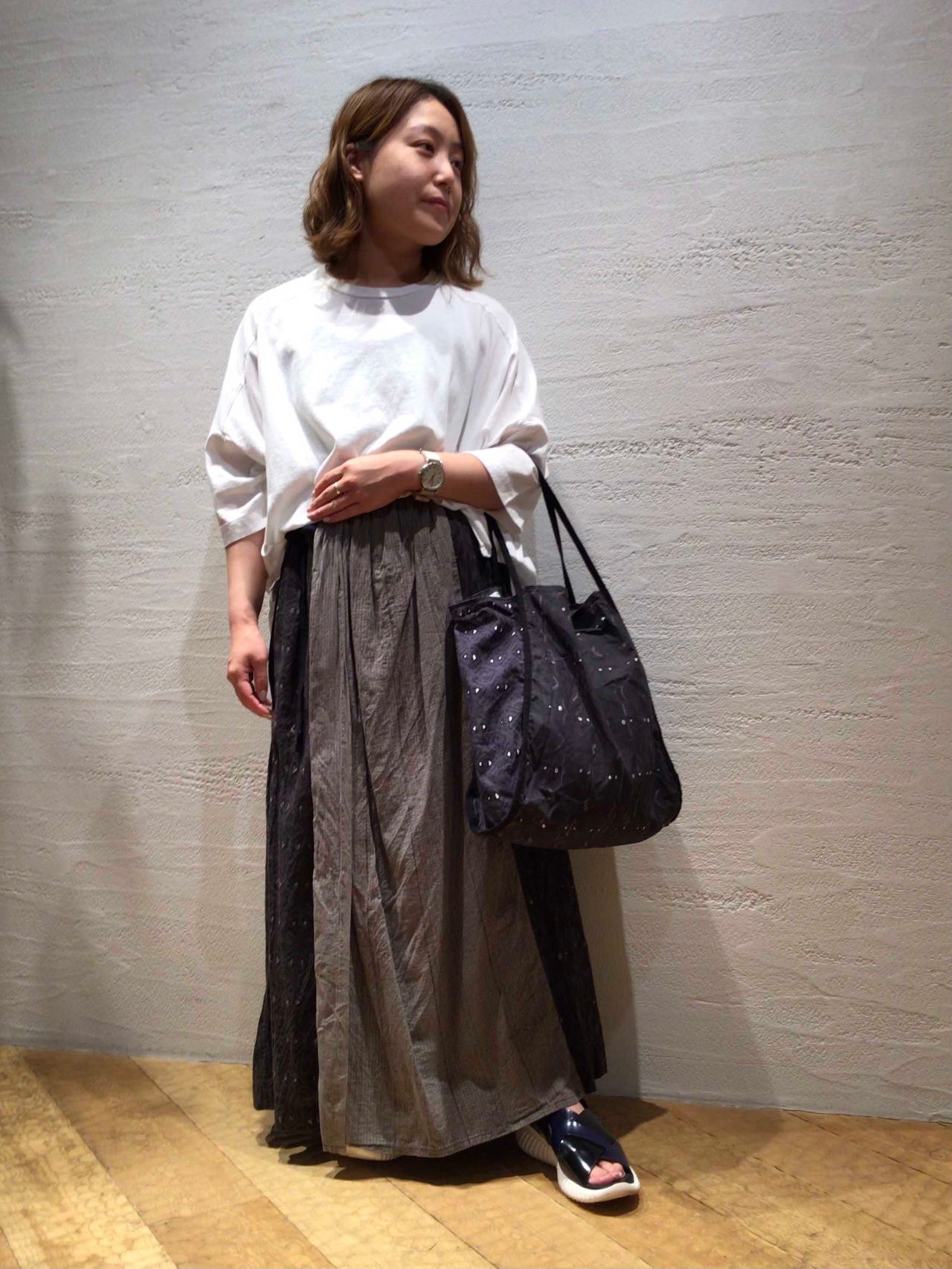センターの柄違いがアクセントになるスカートは、BAGとの柄合わせを主張しすぎずコーディネートをまとめてくれます。