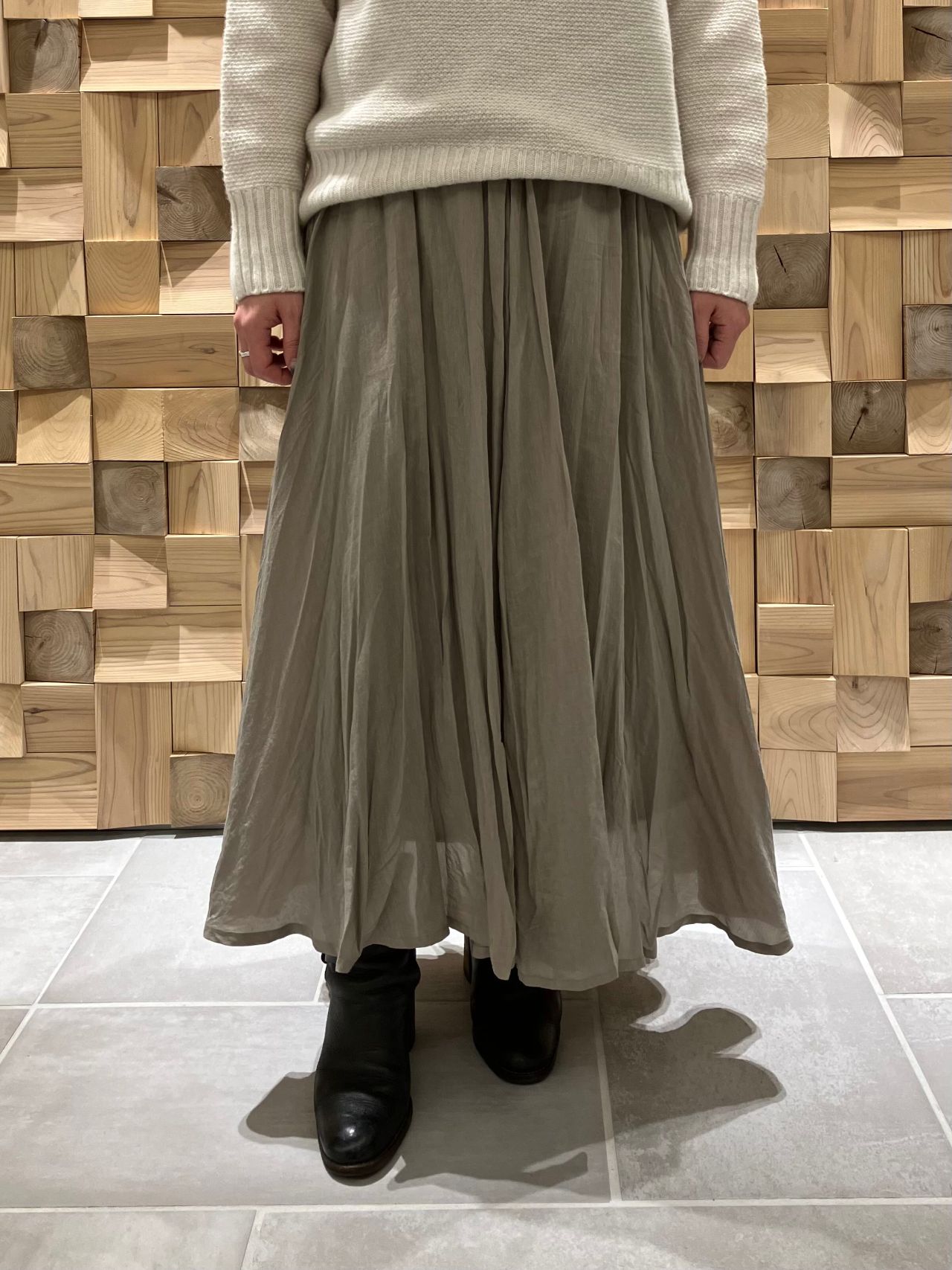 キュプラの光沢感とリネンの粗野感が合わさった、透け感の綺麗なスカート。