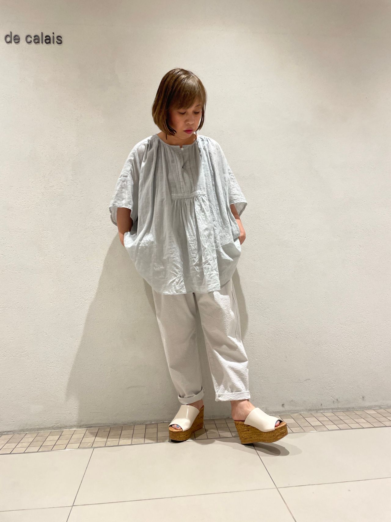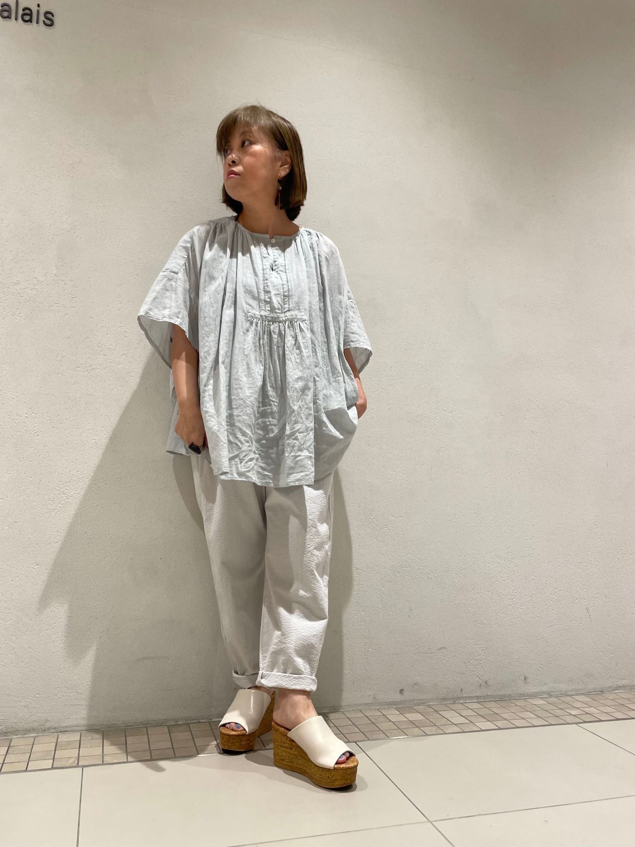 サッカー素材のパンツと合わせ、ブルーグレーのコーディネート。