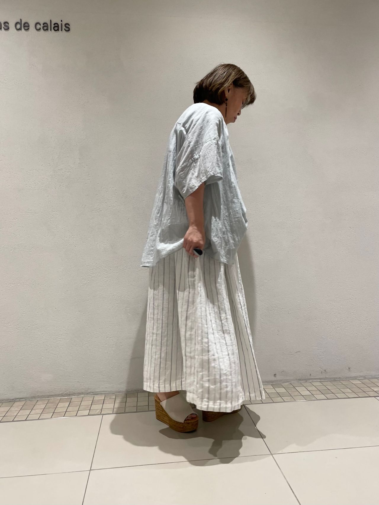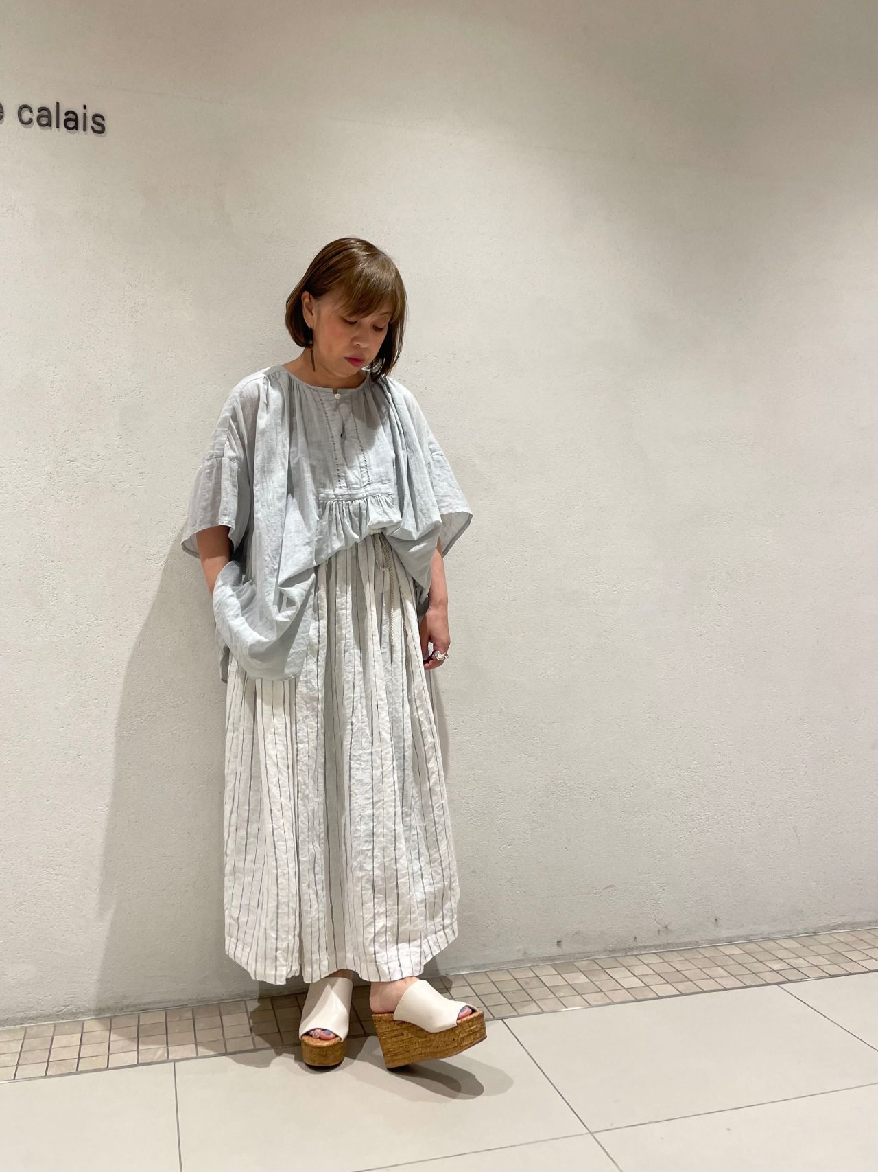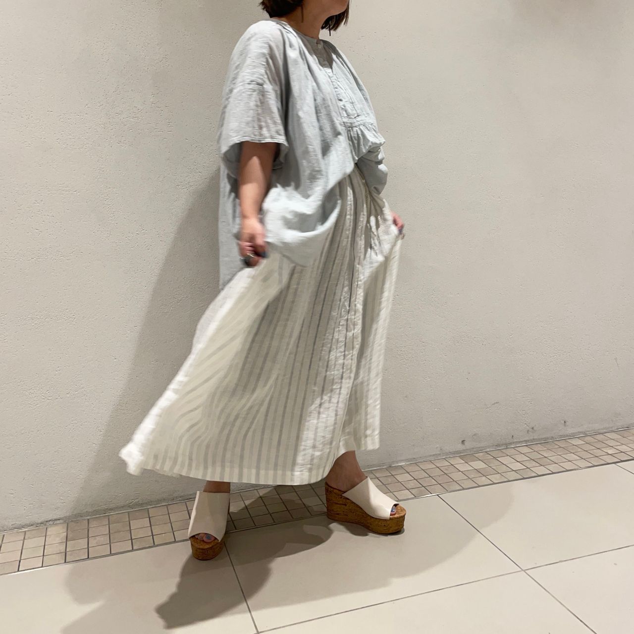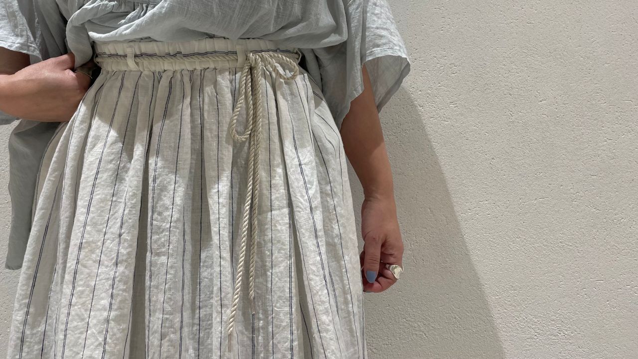 リネンストライプのスカートと合わせ、カジュアル且つ上品なコーディネートに。