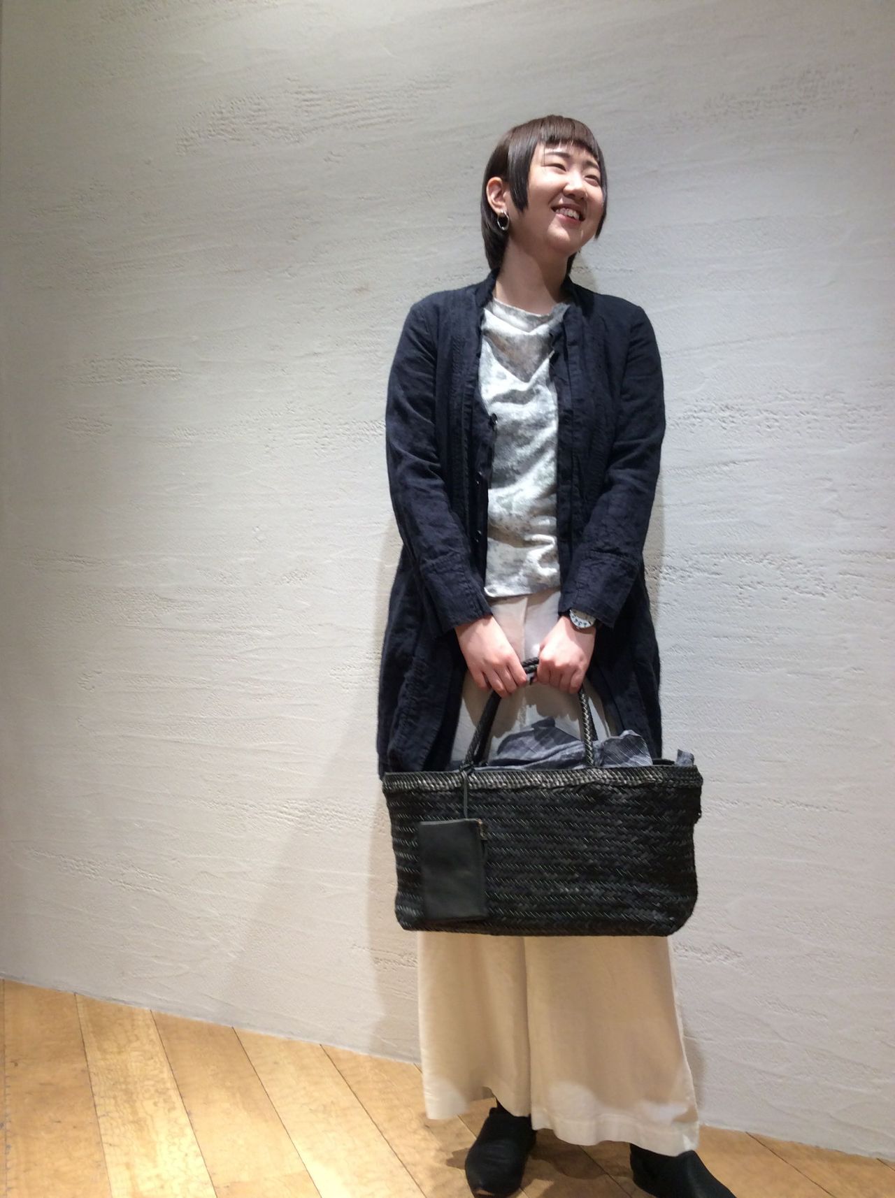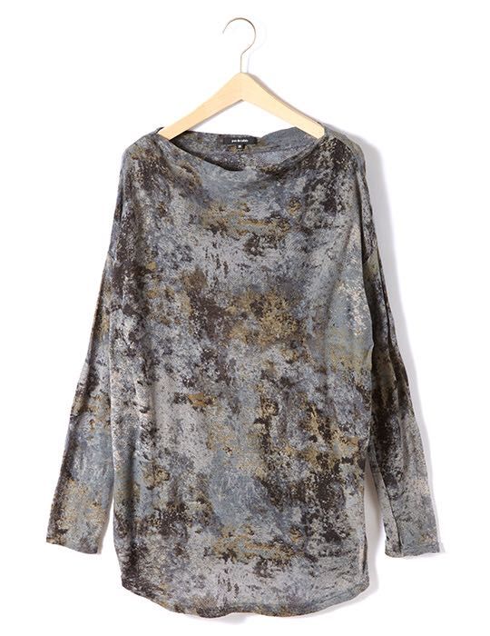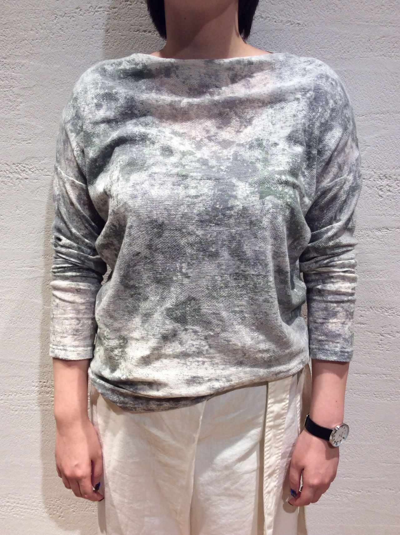 新緑、生命力を感じるグリーンをポイントにした柄をプリントしています。プリントの下生地に表情があるのでプリントにより奥行を出しています。シルエットは身頃はゆったり、裾はスッキリさせて着やすくしております。素材が軽いので重ねても着れます。