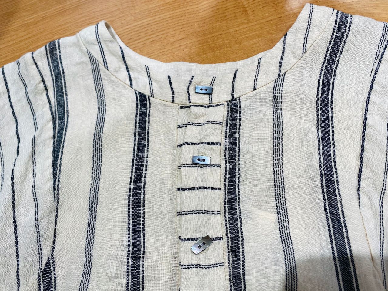 首元のスクエアの貝ボタンも雰囲気があって素敵ですね。