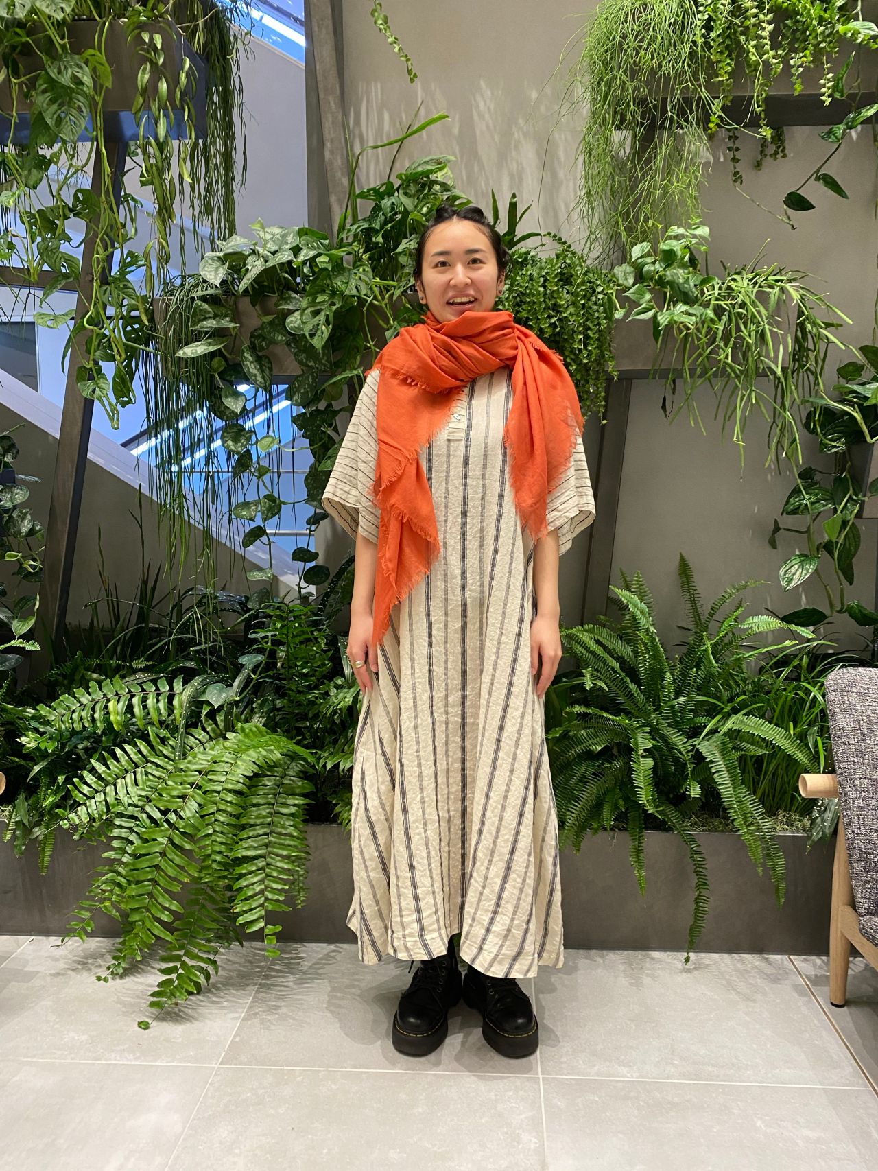 目を惹く赤のストールを合わせて初夏らしいエネルギッシュな着こなしにしました。