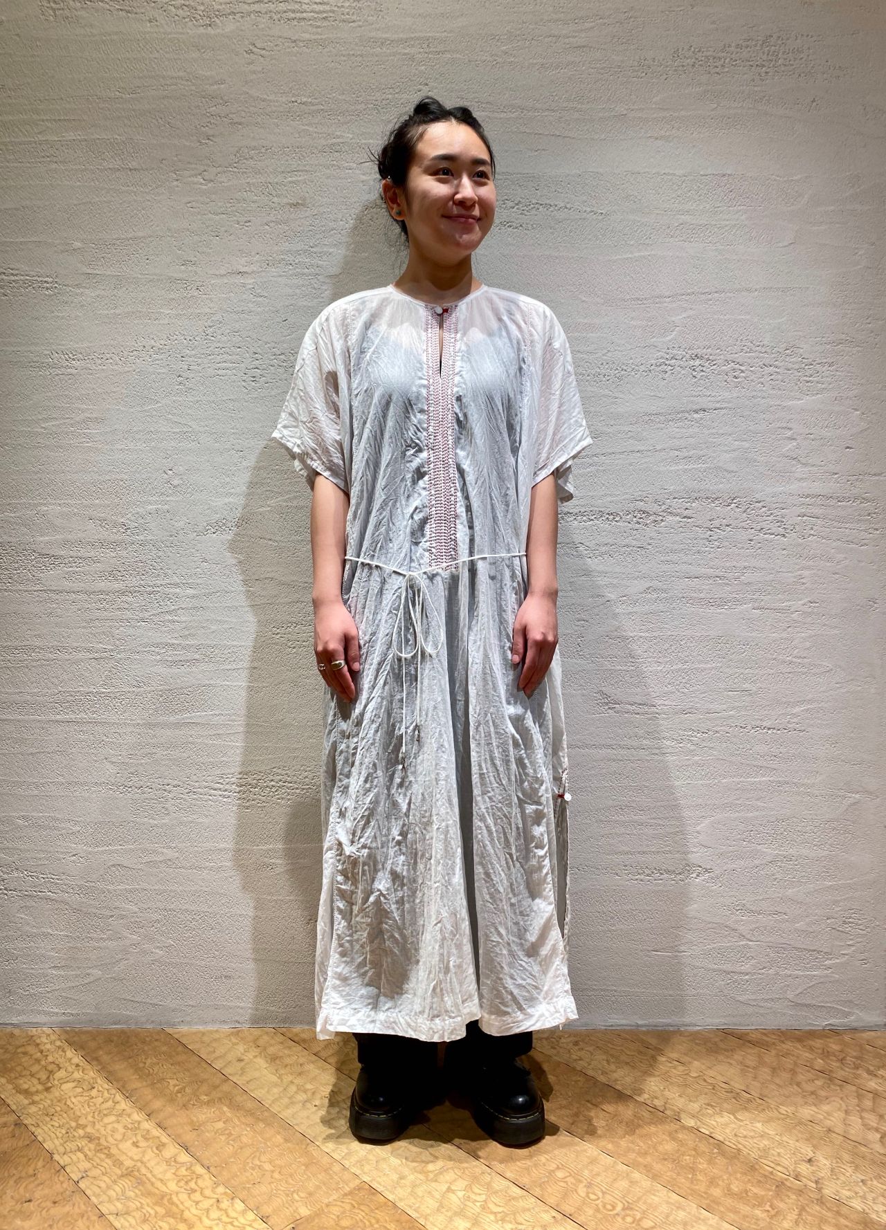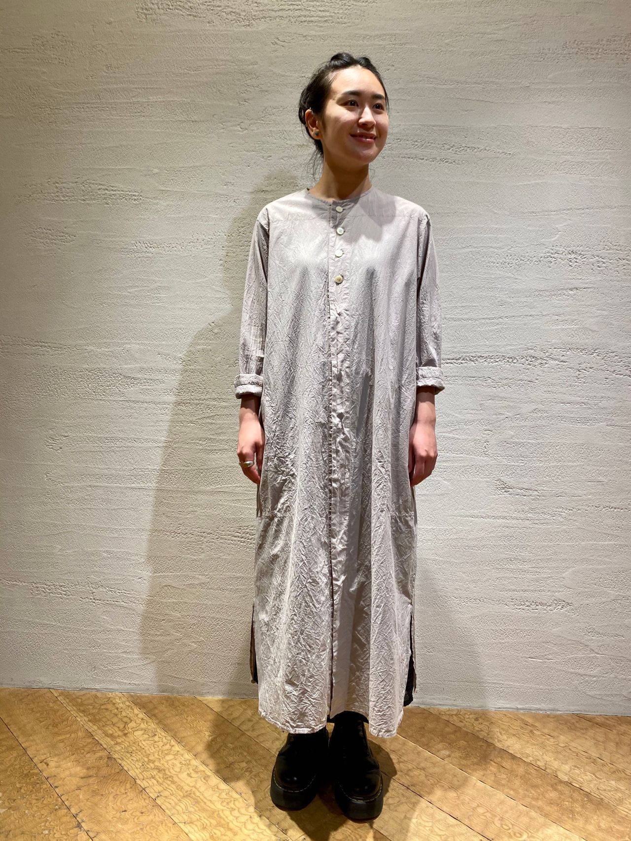 浜松の工場で作ったコットン素材の生地を製品染めした後シワ加工を施している、ナチュラルな雰囲気が楽しめるワンピースです。