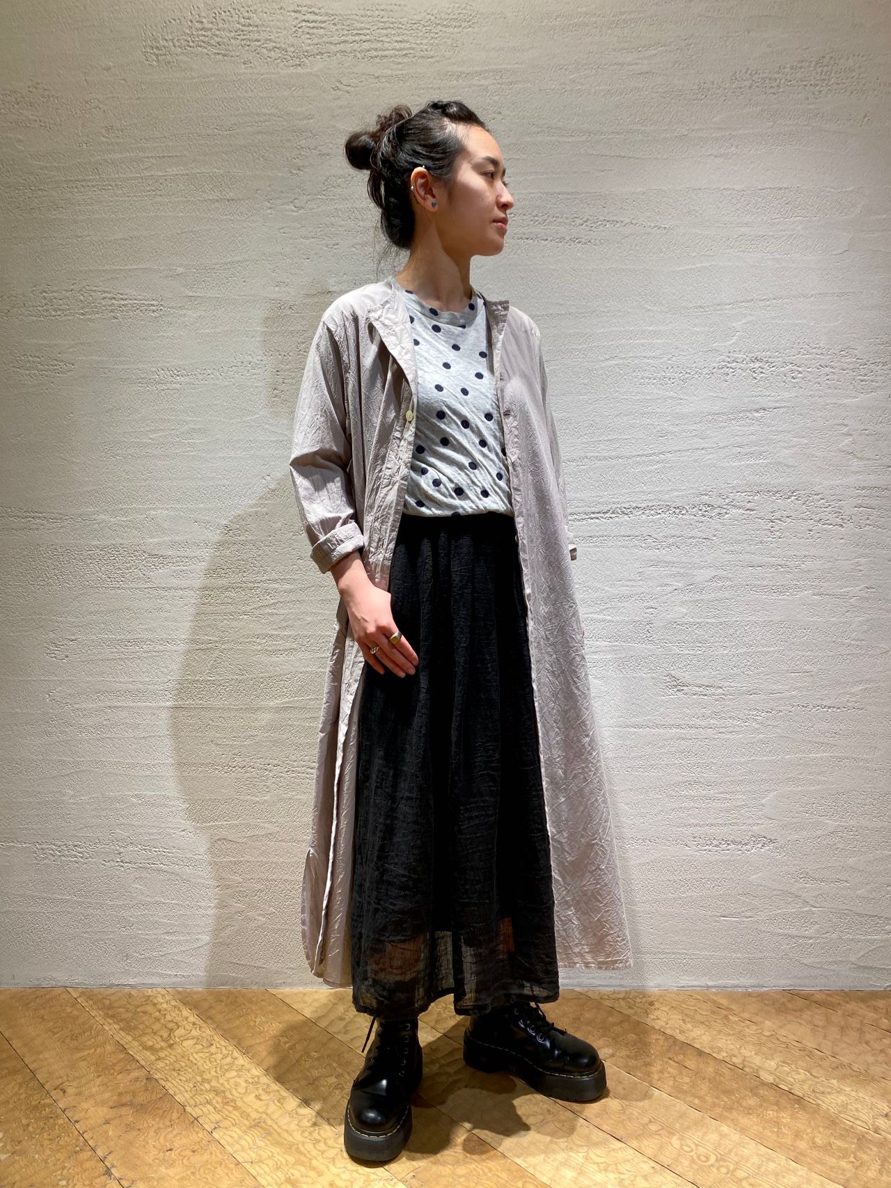 すっきりとしたシンプルなシャツワンピースを羽織にドットのトップスを合わせた着こなし。