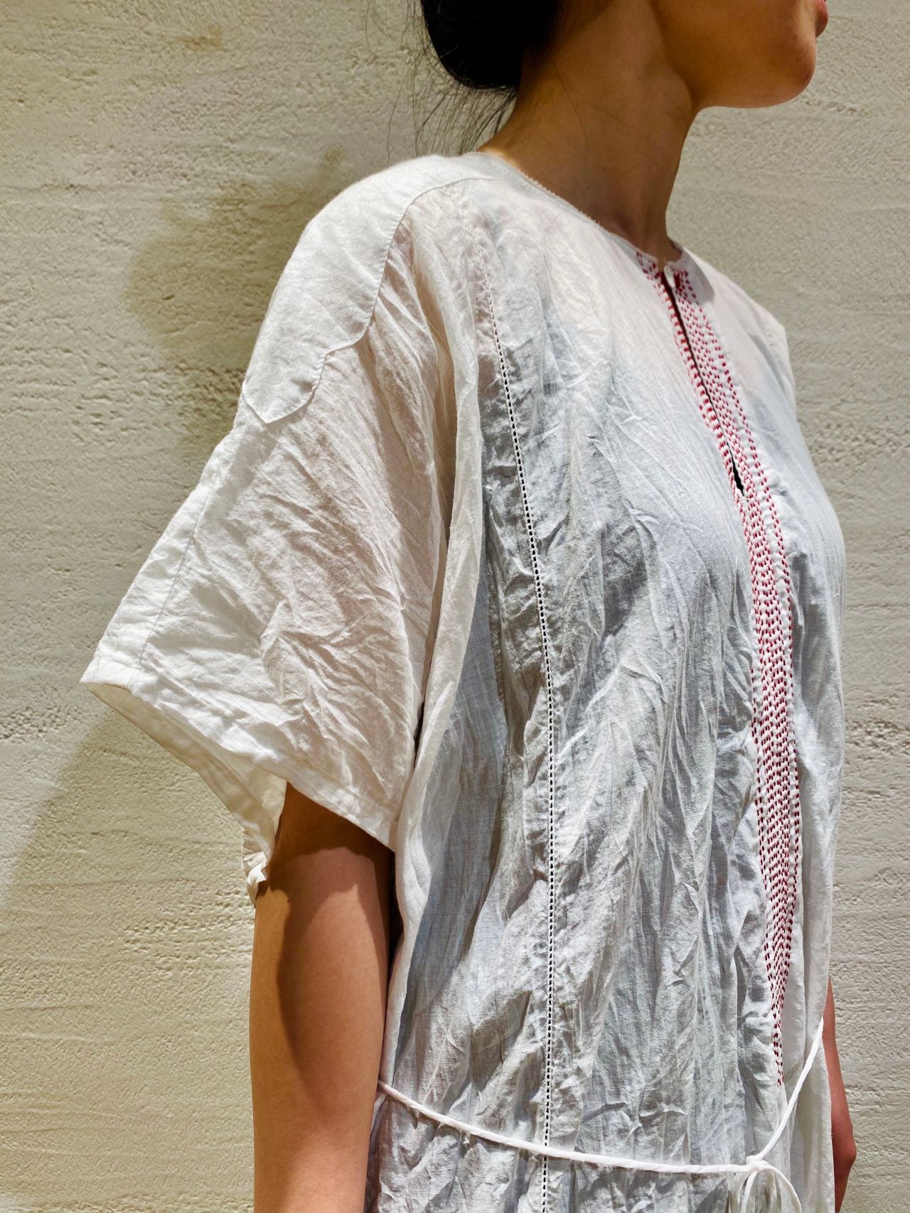 赤いステッチがポイントの透け感のある涼しげなワンピースに