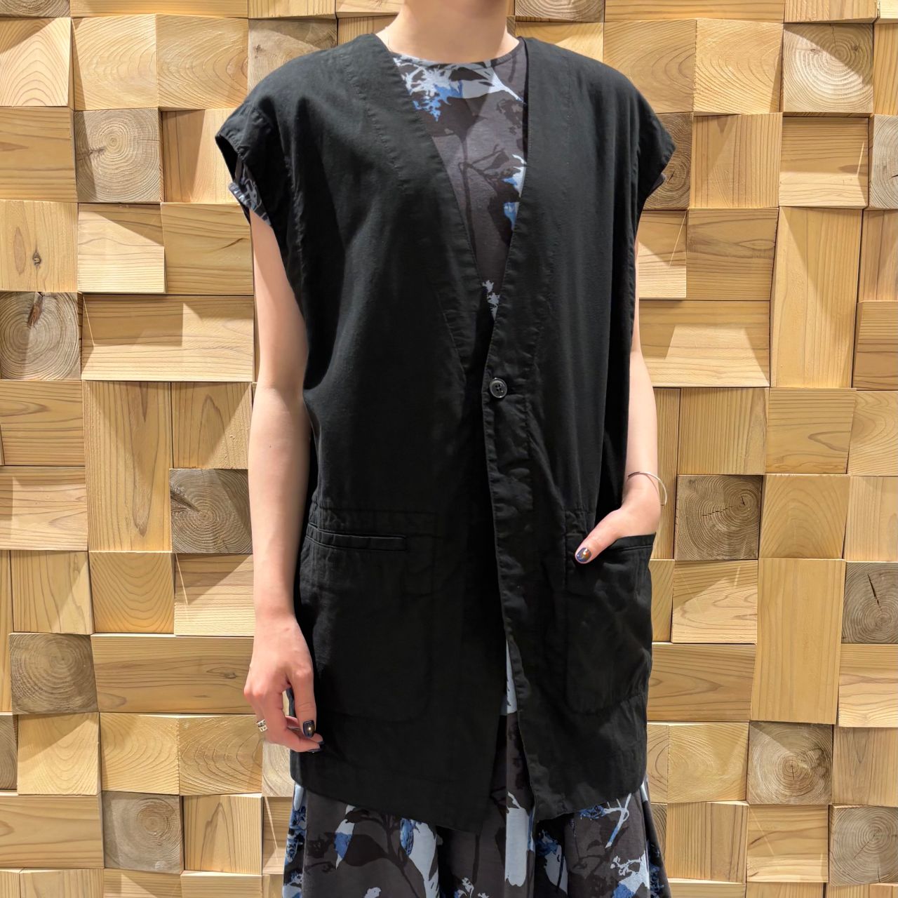 深めのVネック、フロントに2つポケットのカジュアルなジレ。