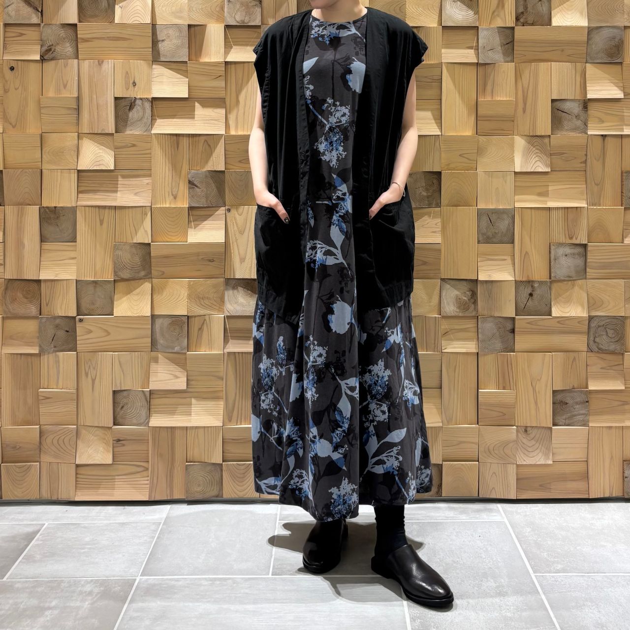 サマーボタニカルプリント柄に合わせ、夏の涼しげな綺麗めスタイルに。