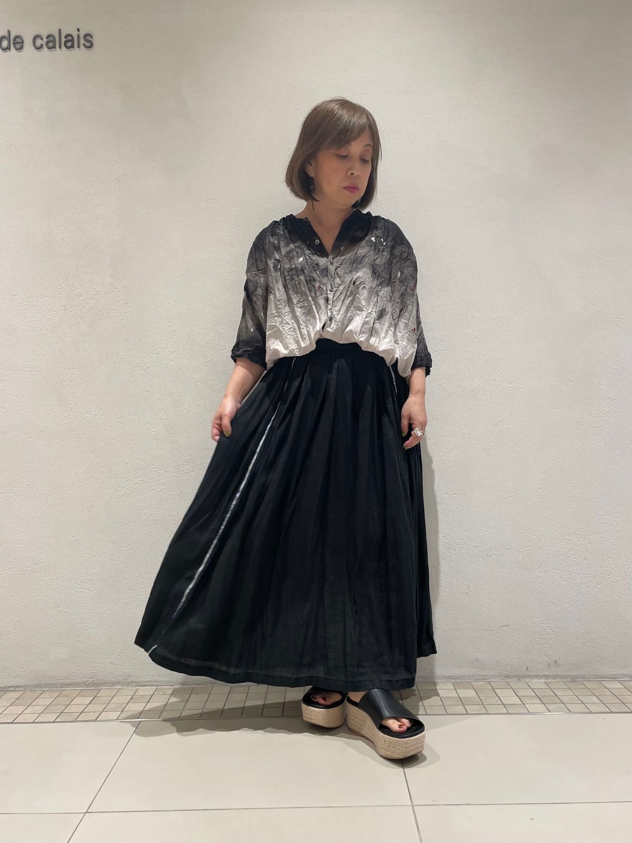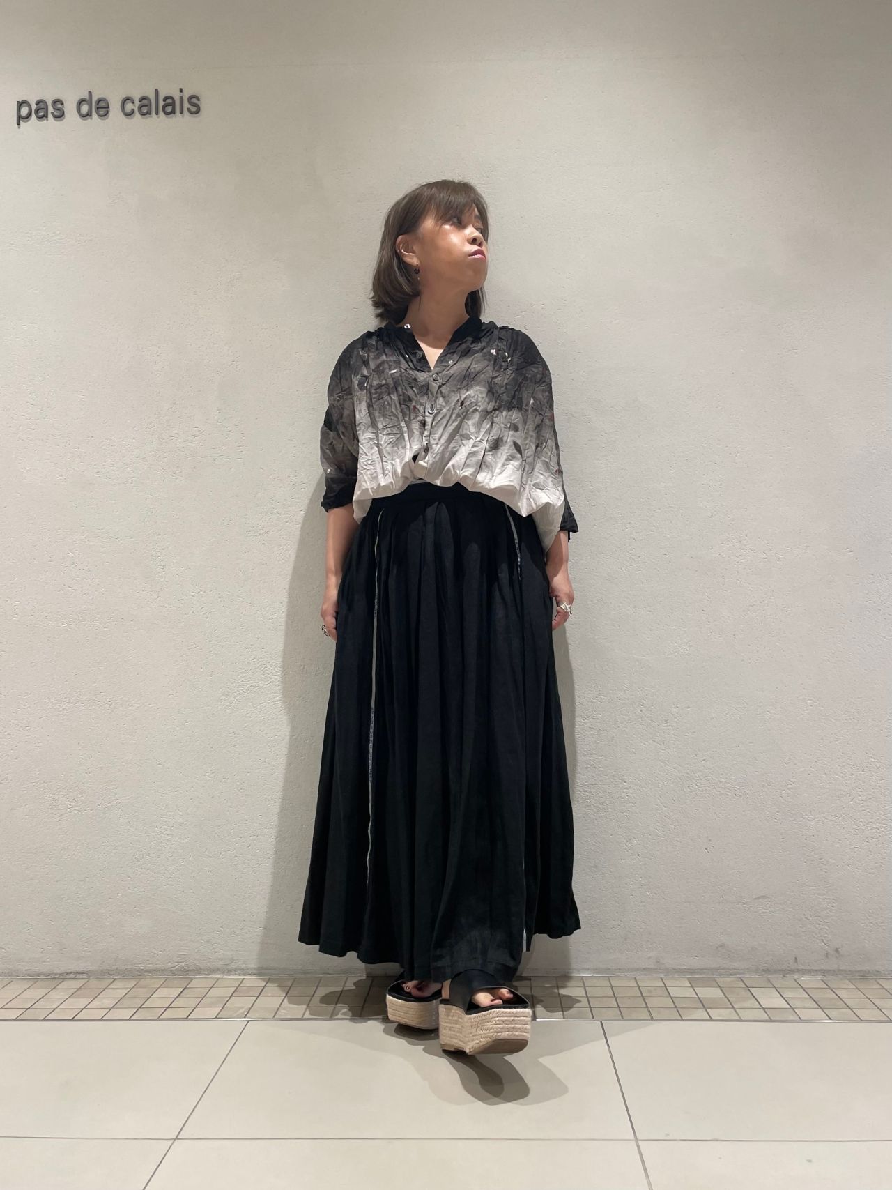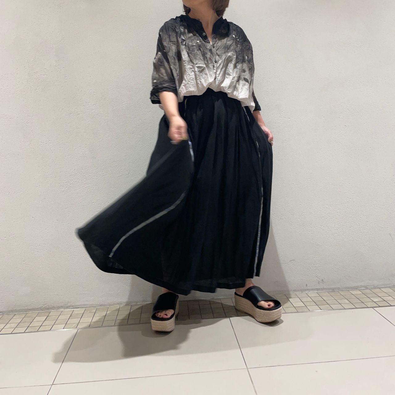 ローン素材の軽やかさとグラデーションで黒を合わせでも涼やかな印象です。