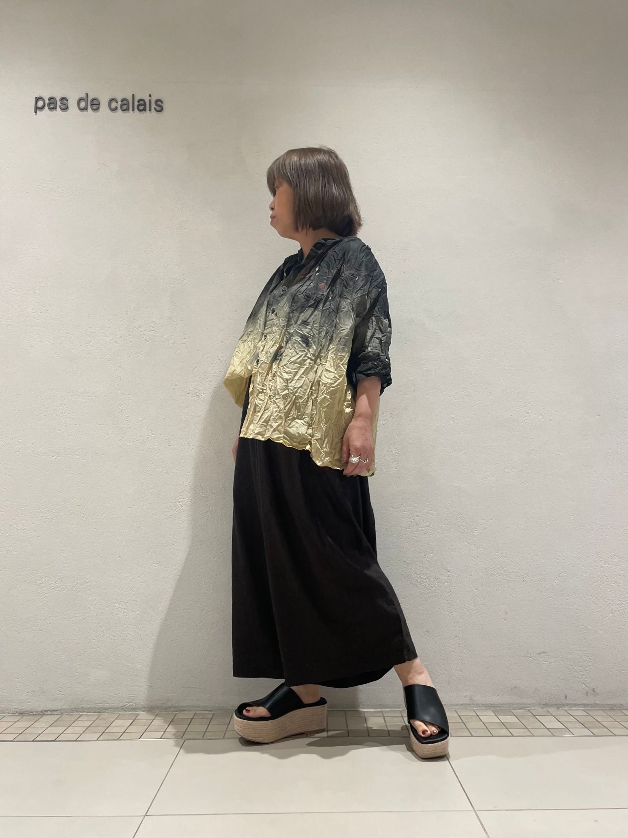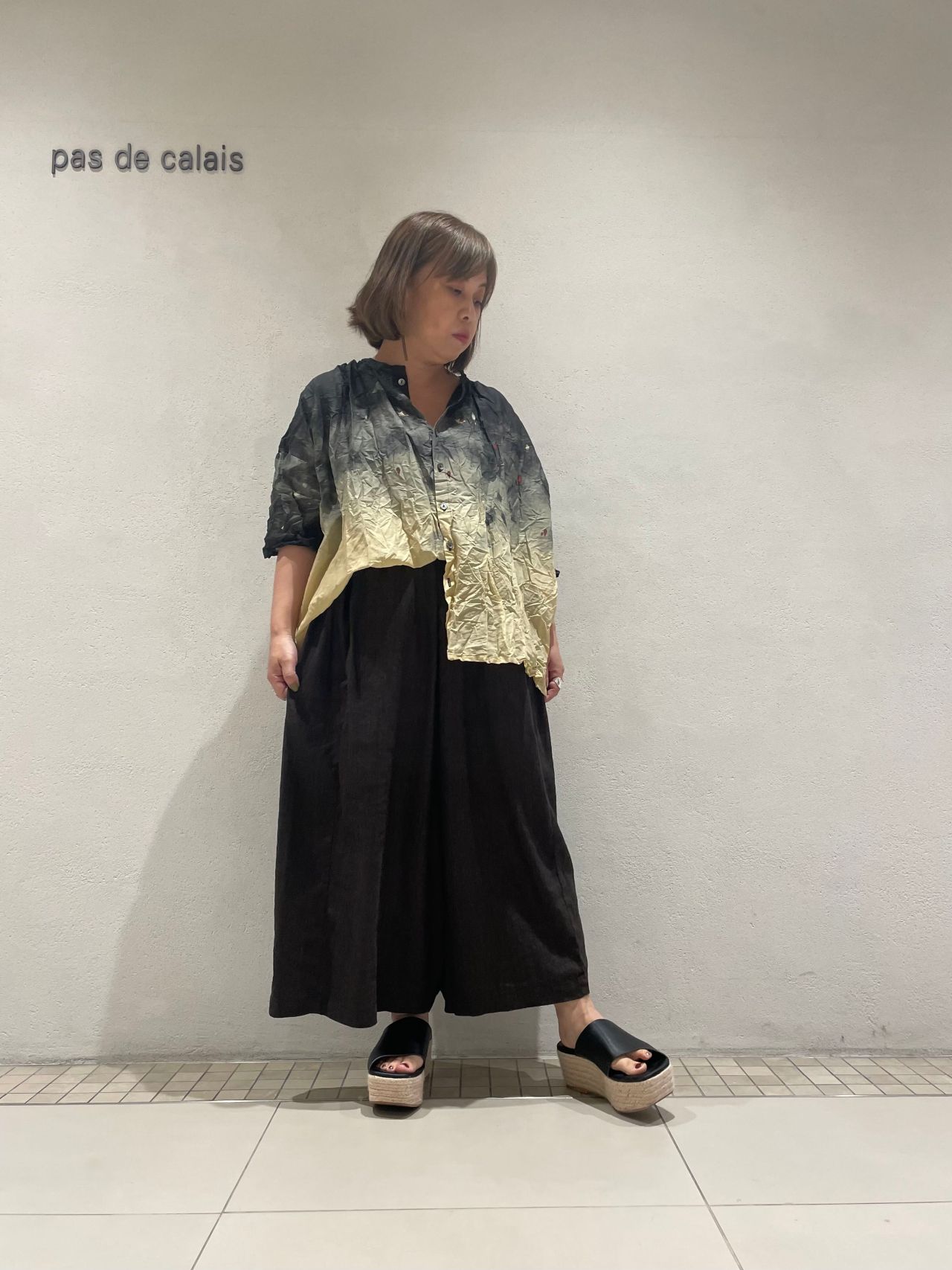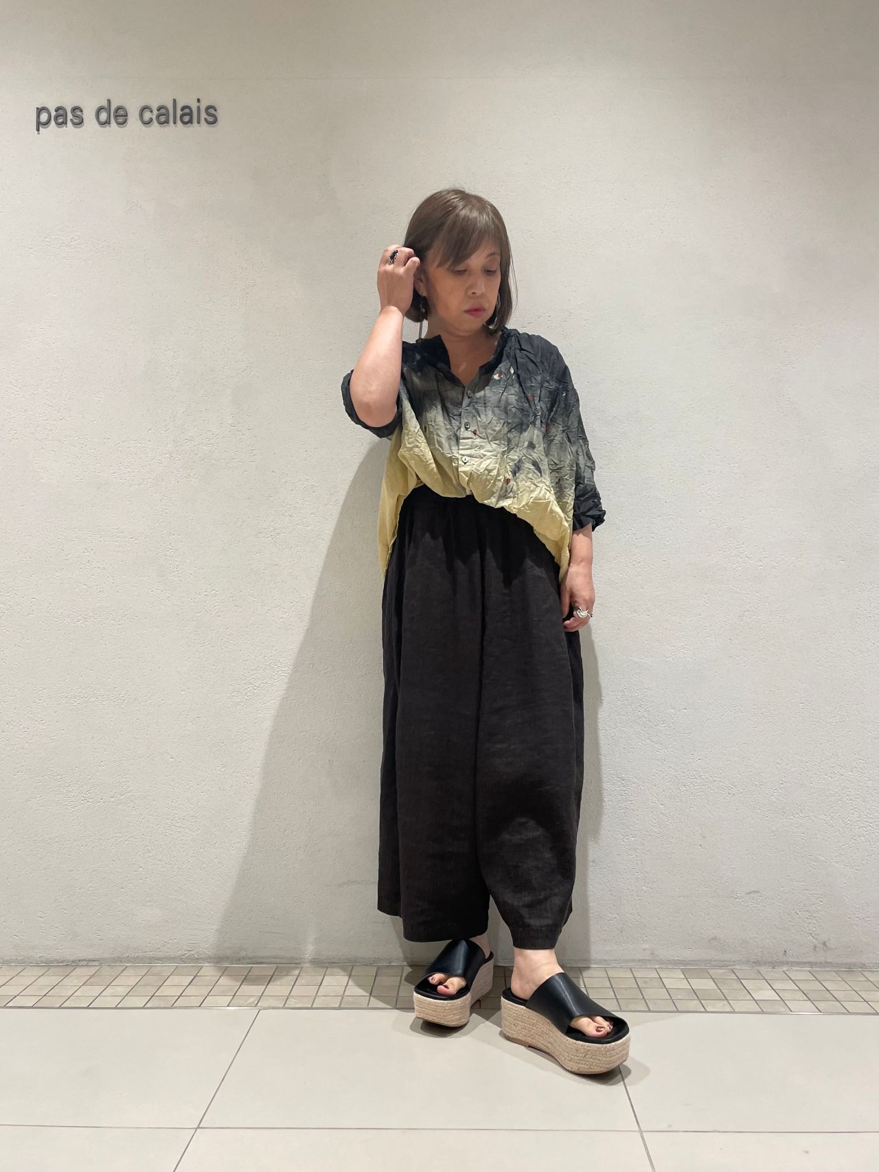 ローン素材の軽やかさとグラデーションで黒を合わせでも涼やかな印象です。