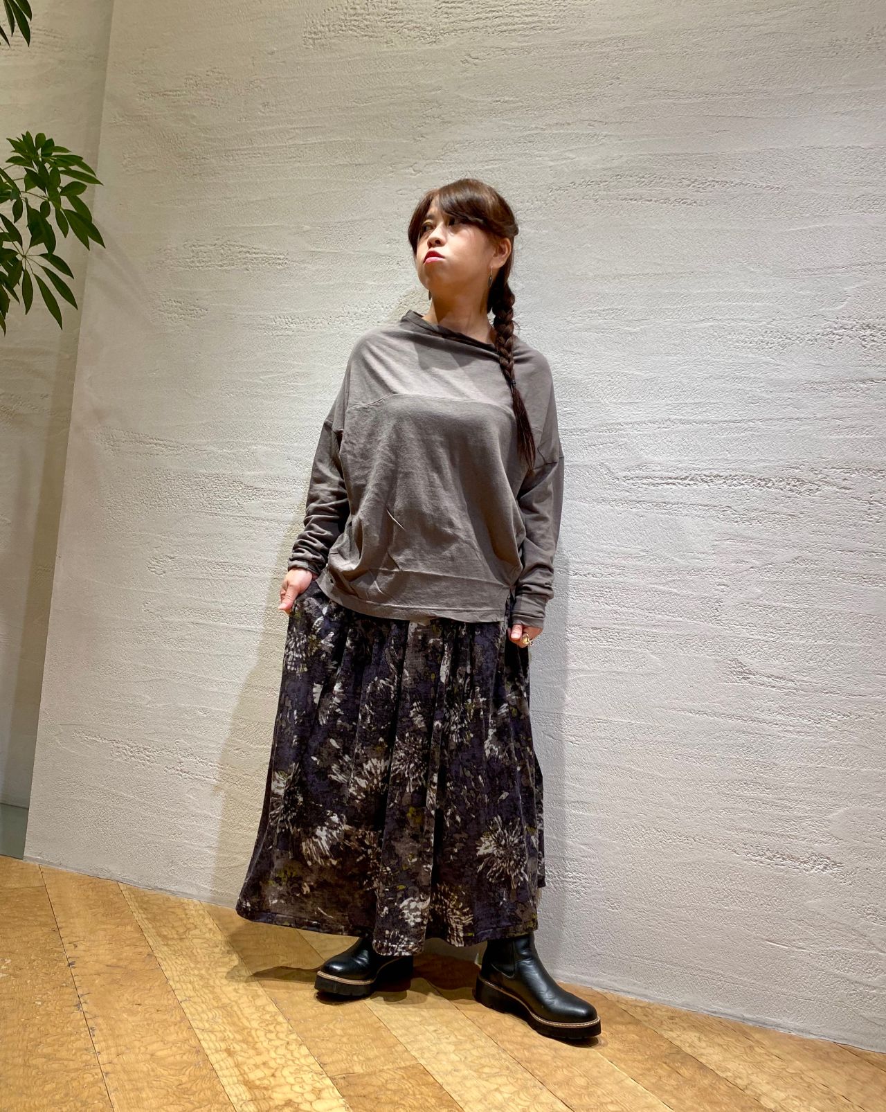 柄のスカートをメインに、秋らしいカラーのカーキ・ブラウンでまとめたコーディネート。