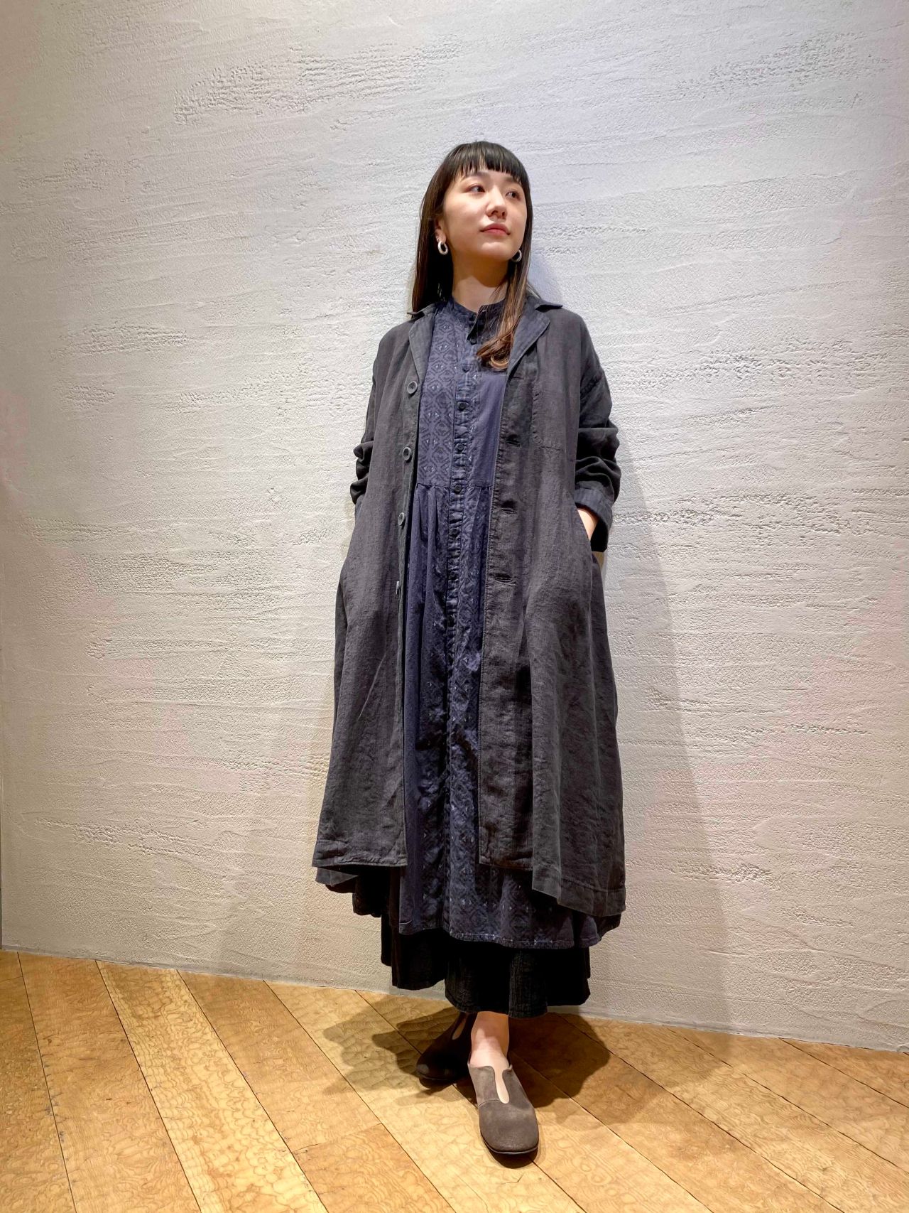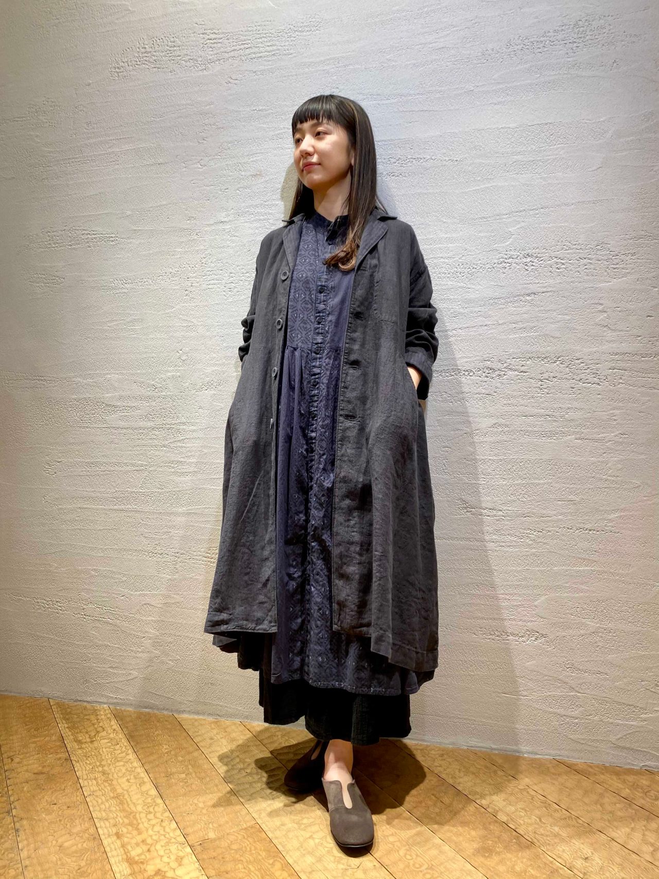 リネンストライプ コート(着用: ブラック)