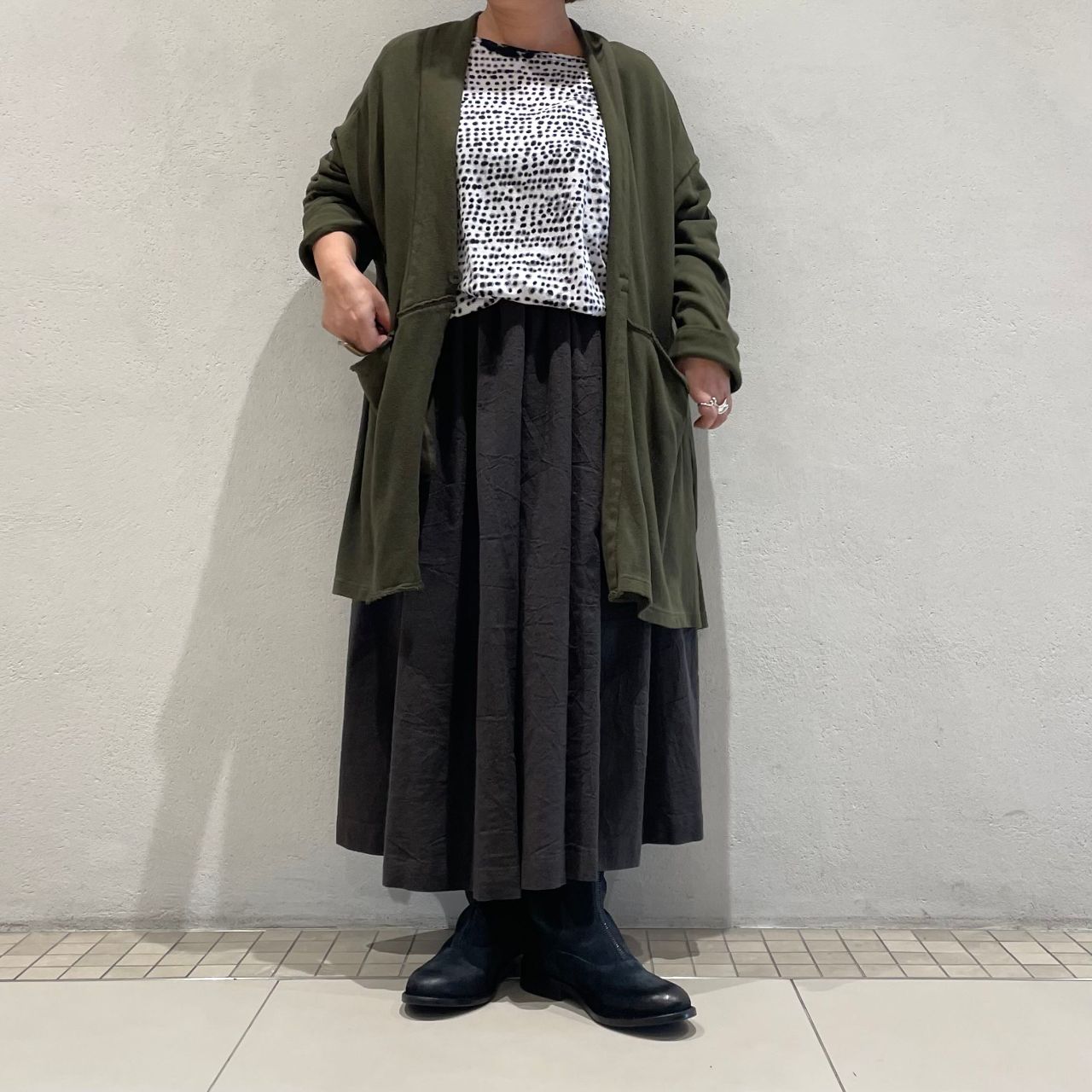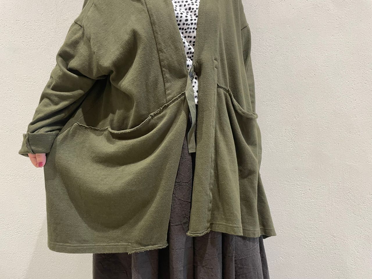 前中心の切り替えと切りっぱなし、大きなポケットがコーディネートのポイントとなり主役になる一枚。