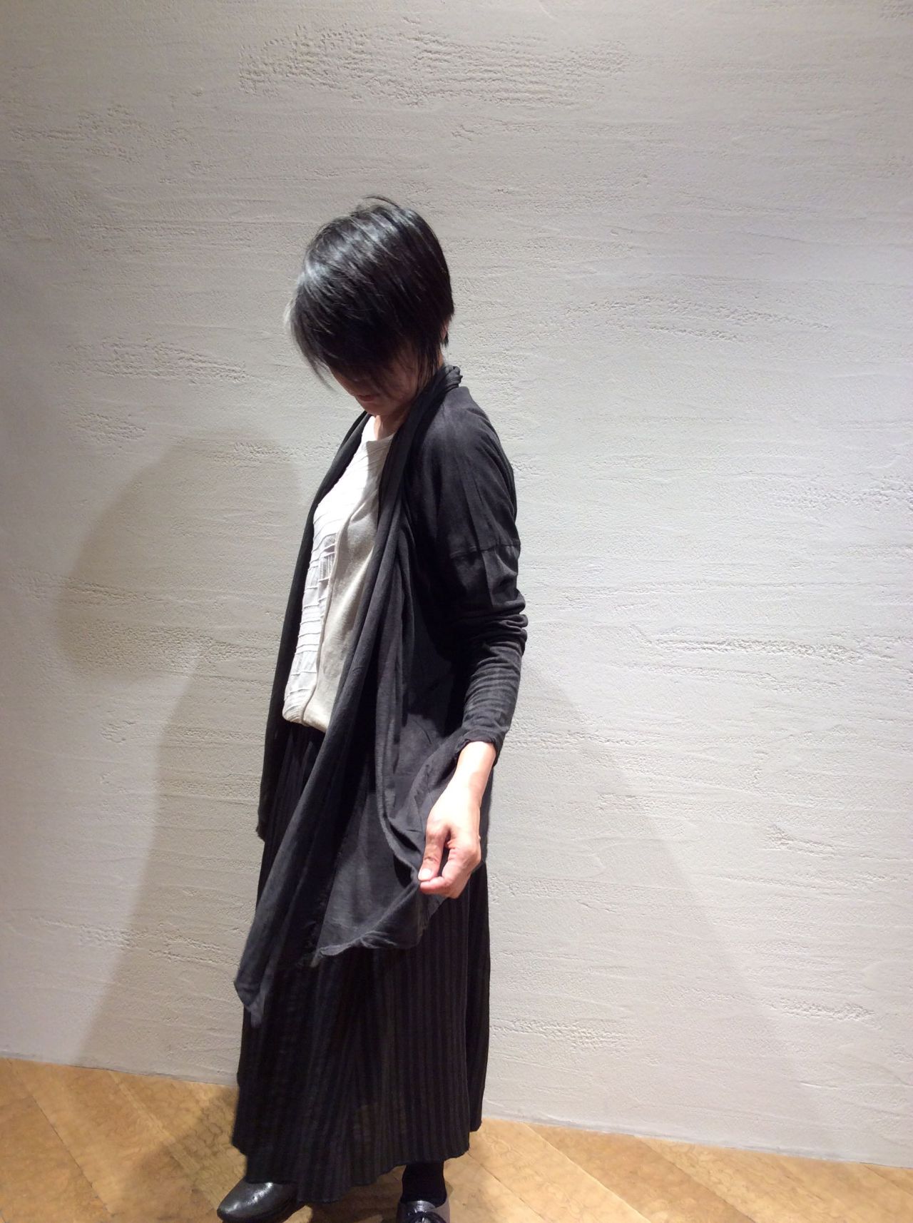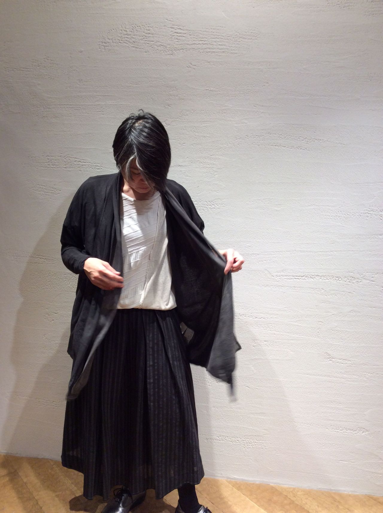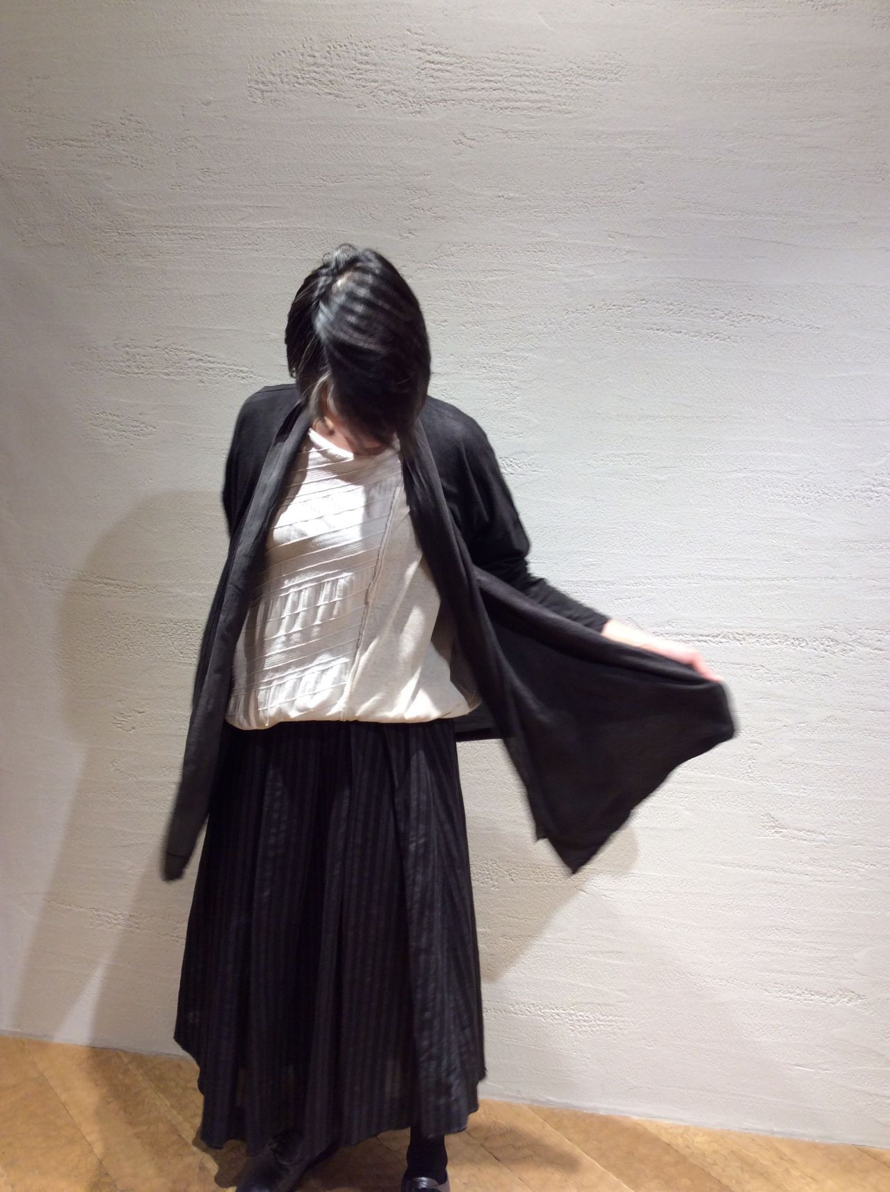 墨をエアブラシで吹き付けて自然なムラ感を出したカーディガンは、気軽に羽織れて柔らかな着心地です。冷房対策や日除けにもなりそう。秋にも活躍する一枚ですよ。
