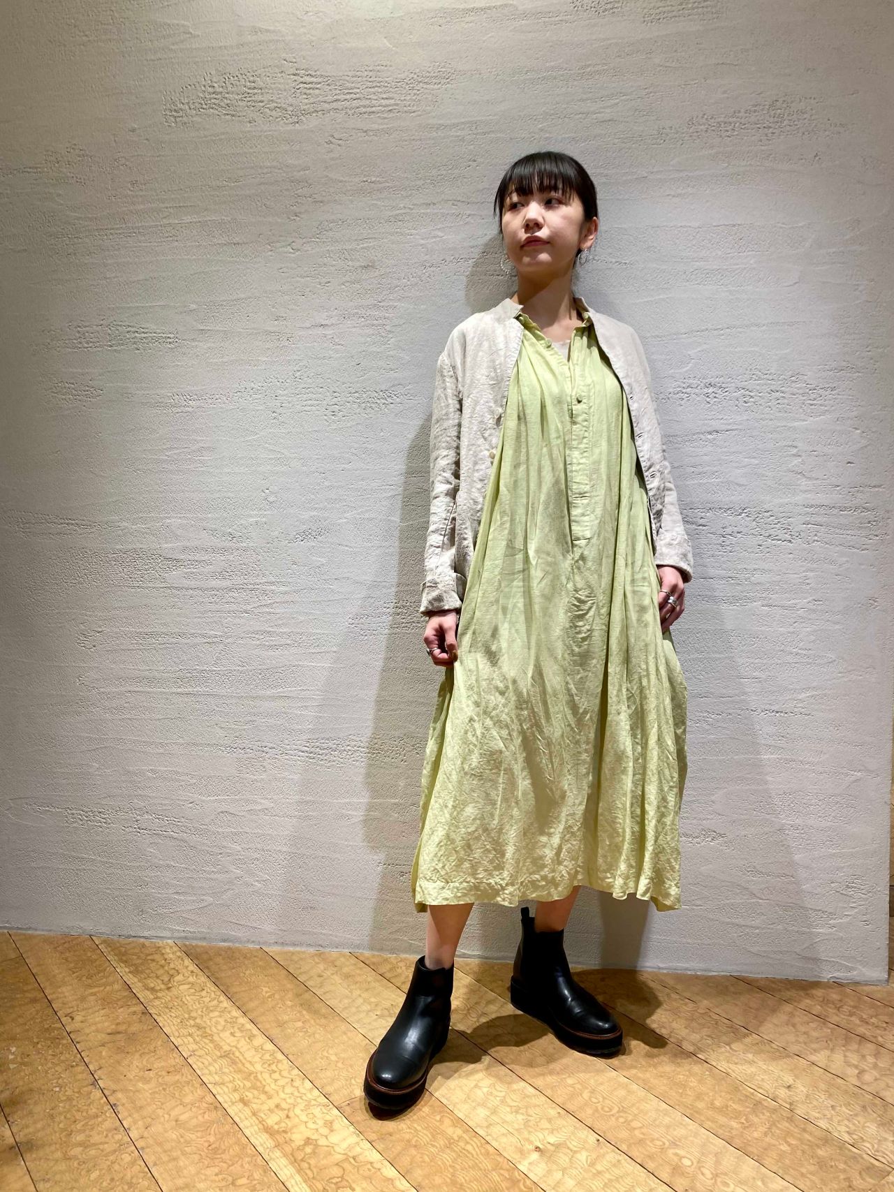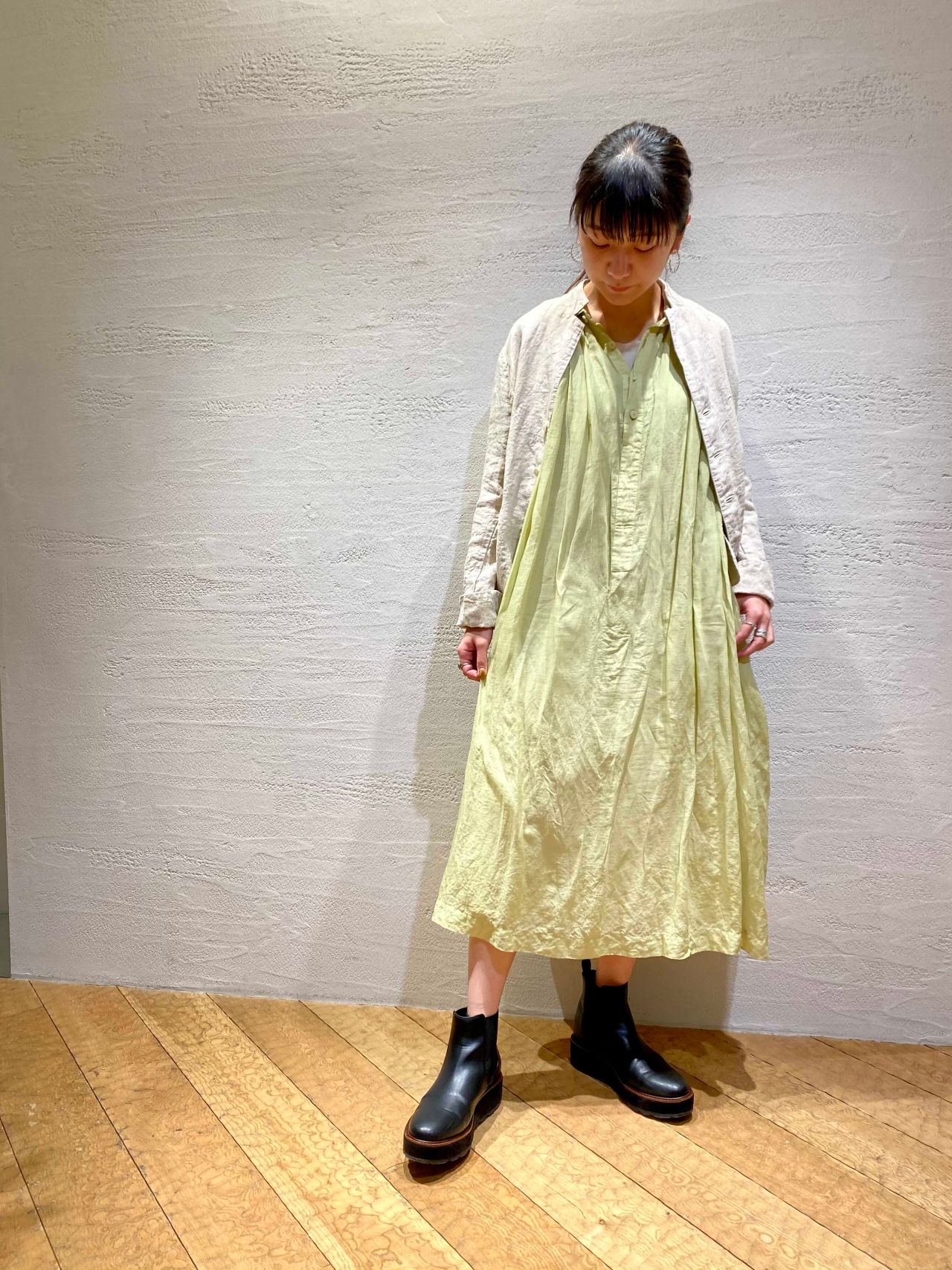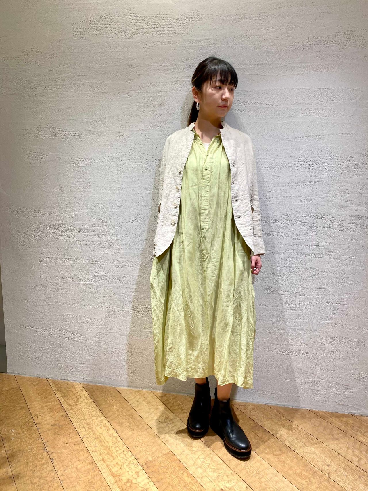 オリーブの枝葉で染めた、初夏の光をイメージしたイエローが目を惹くワンピースに、清涼感のあるリネンツイルのジャケットを合わせたコーディネート。