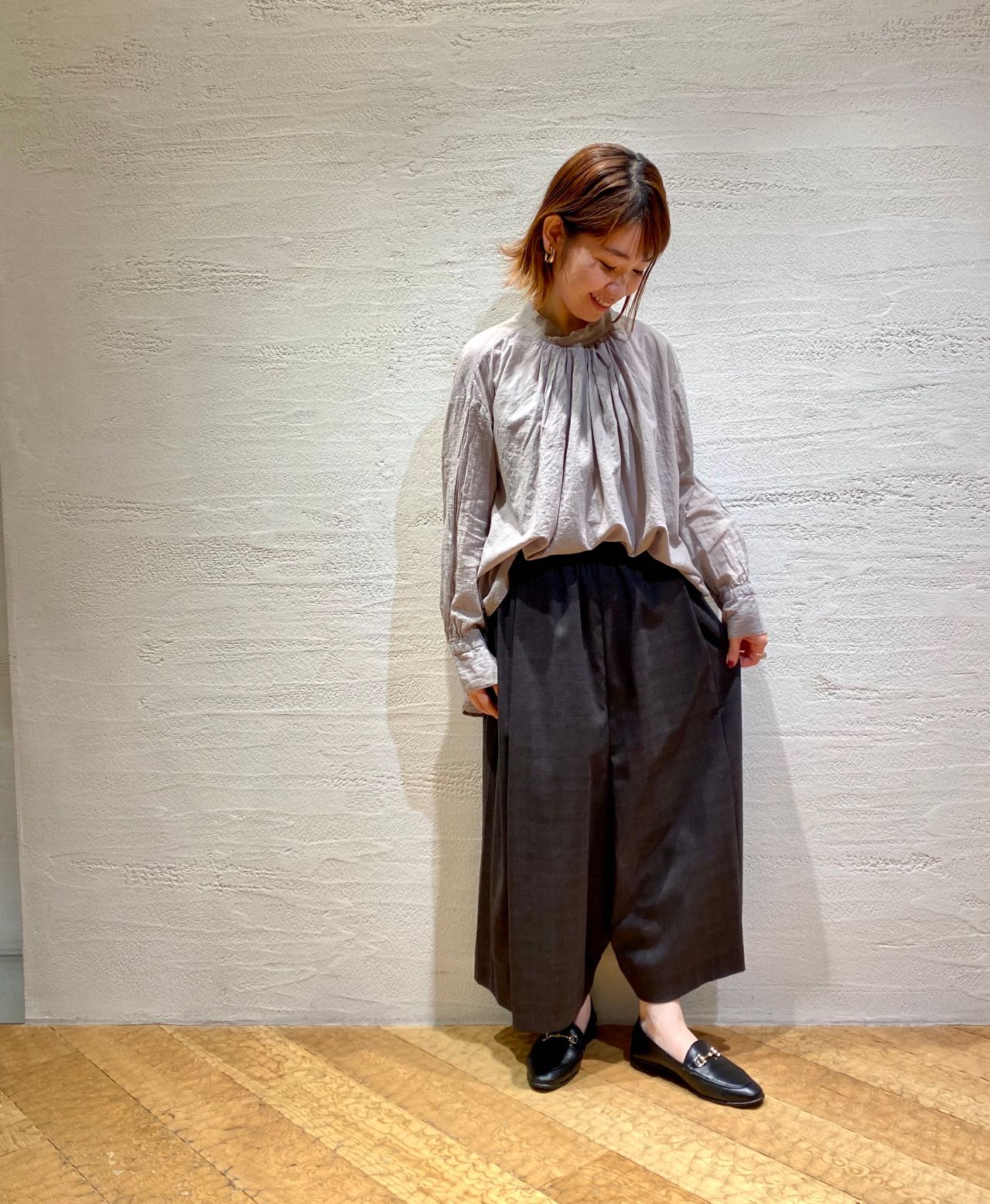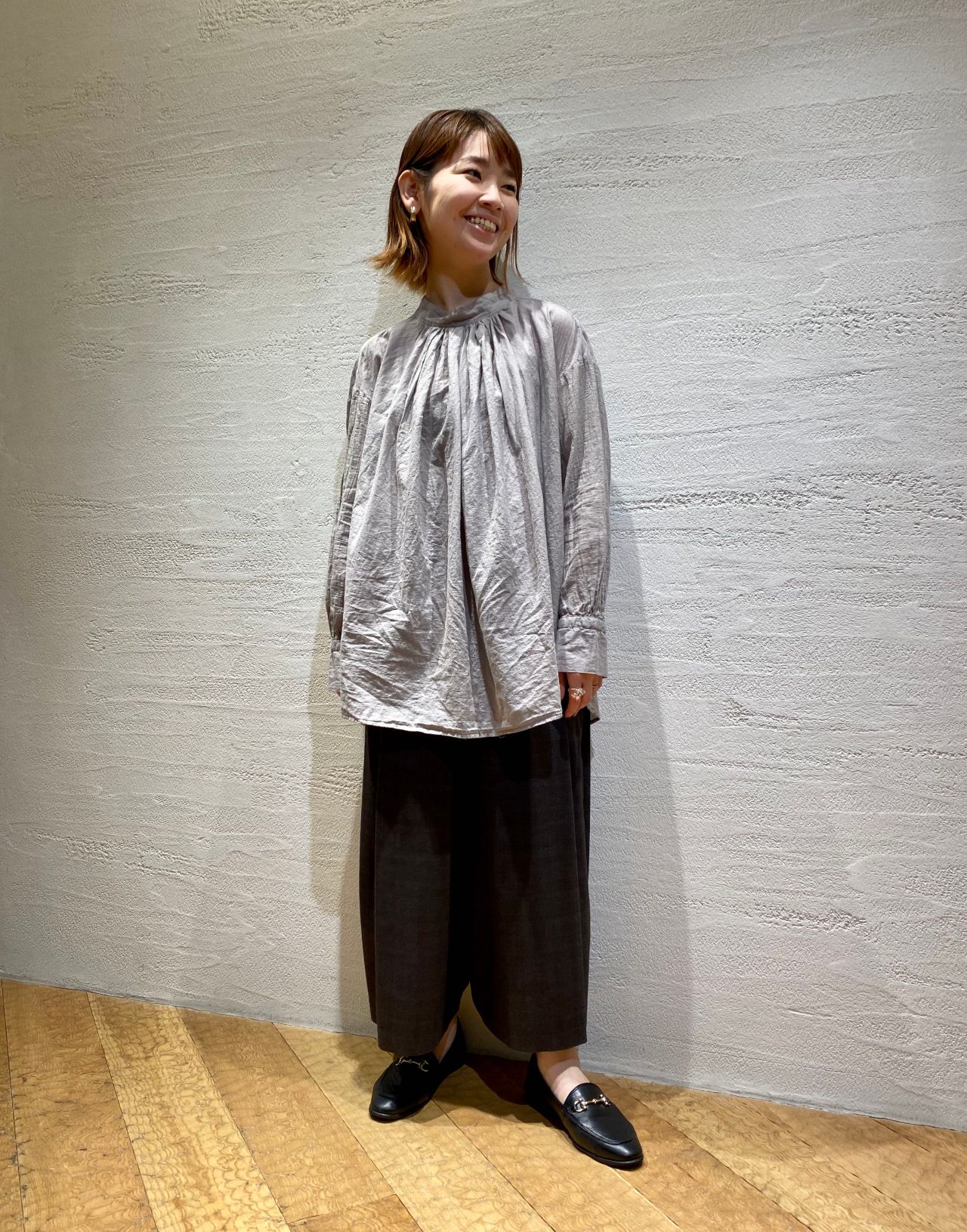 スタンドカラーのブラウスにゆったりとしたパンツを合わせたリラックス感のあるコーディネート。