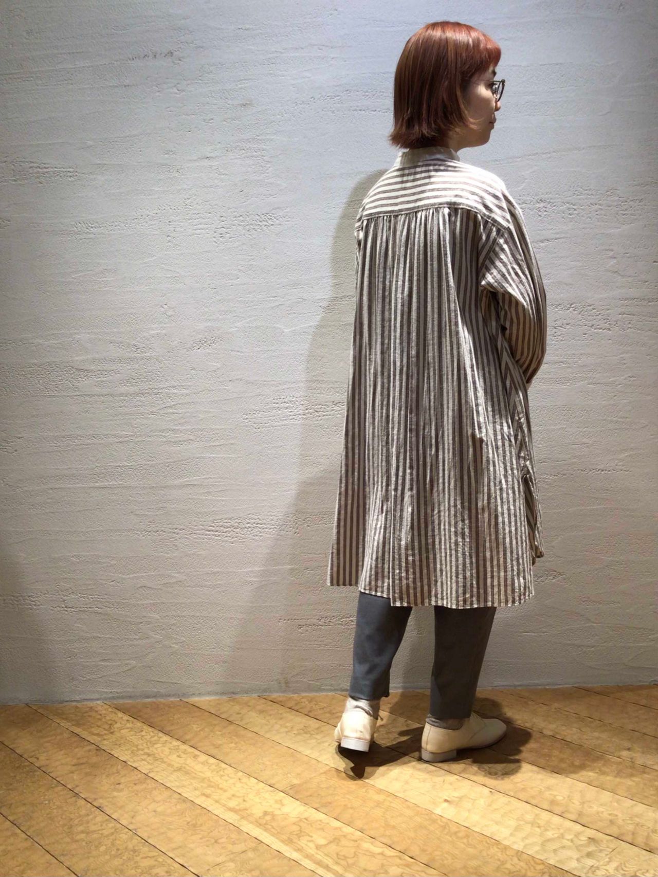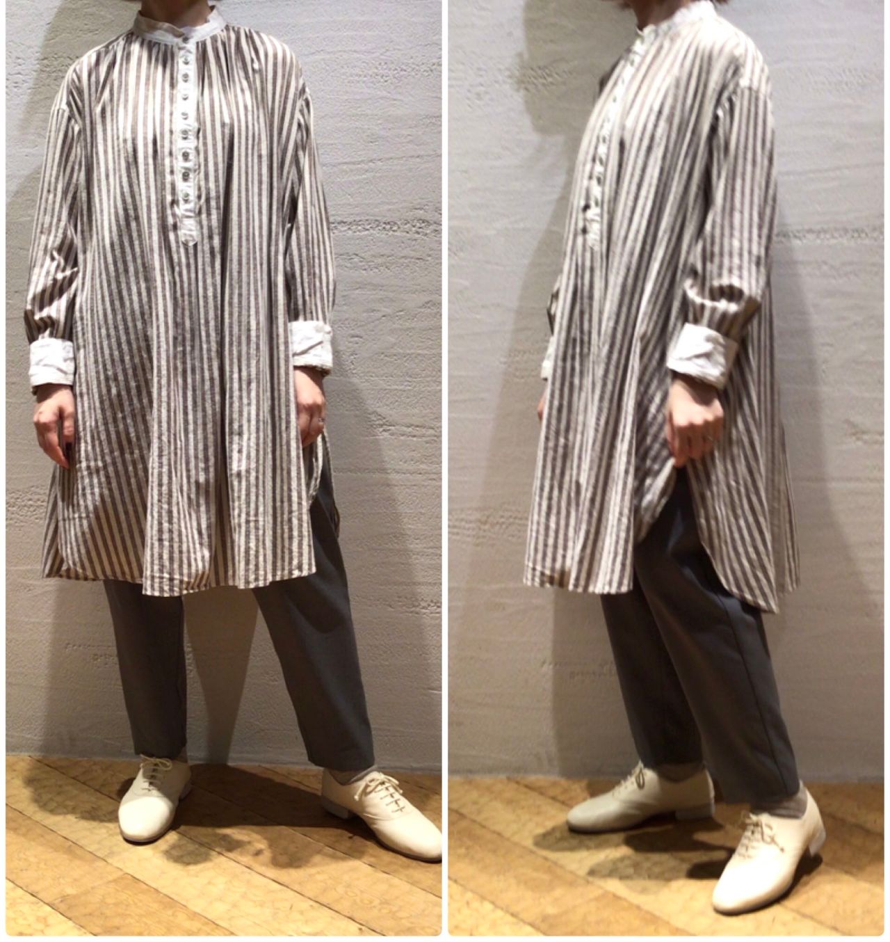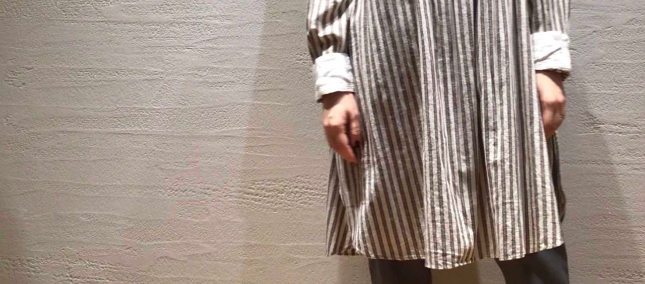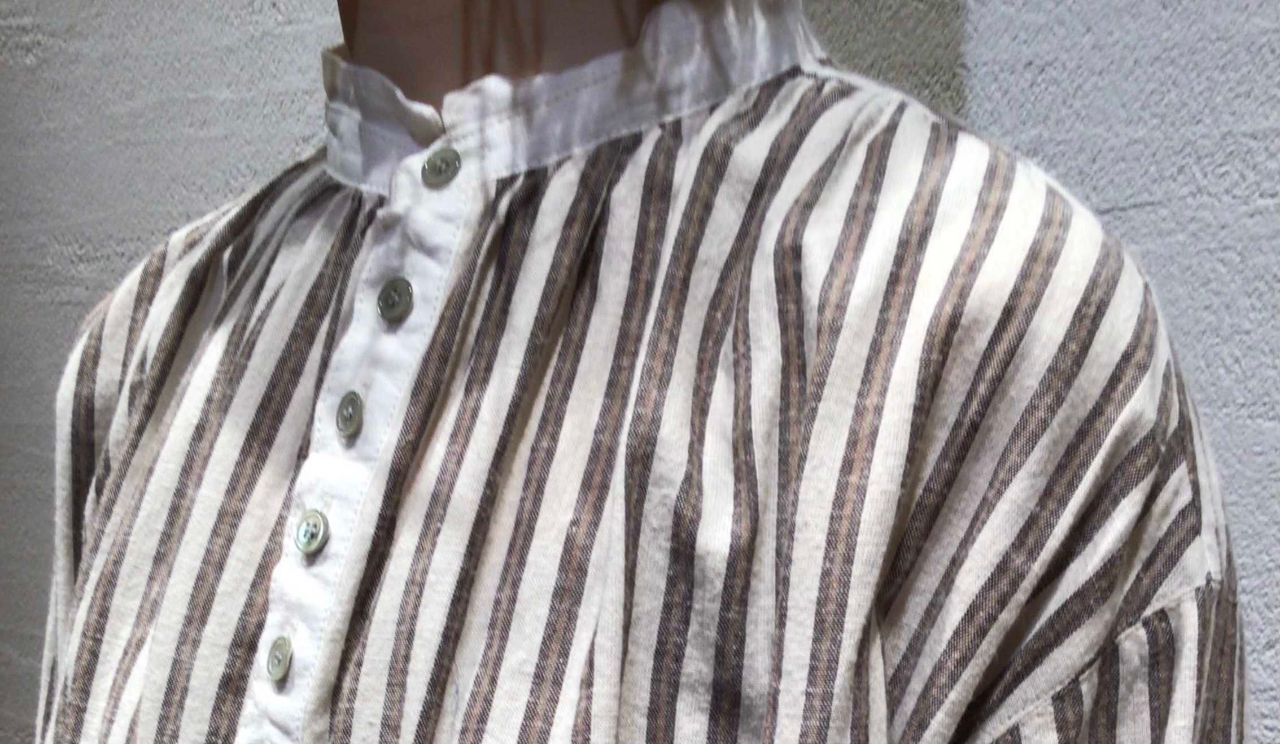 小さい襟とボタン、ステッチワークの効いたクラシックな雰囲気を醸し出したストライプロングブラウス。