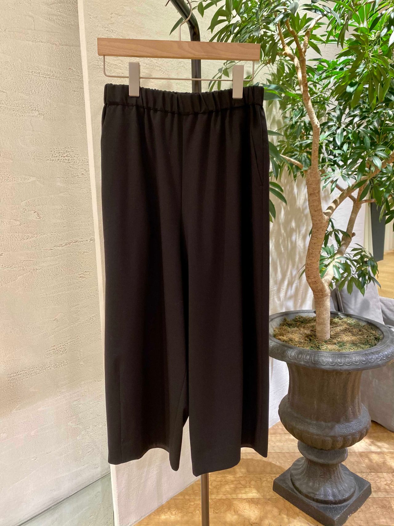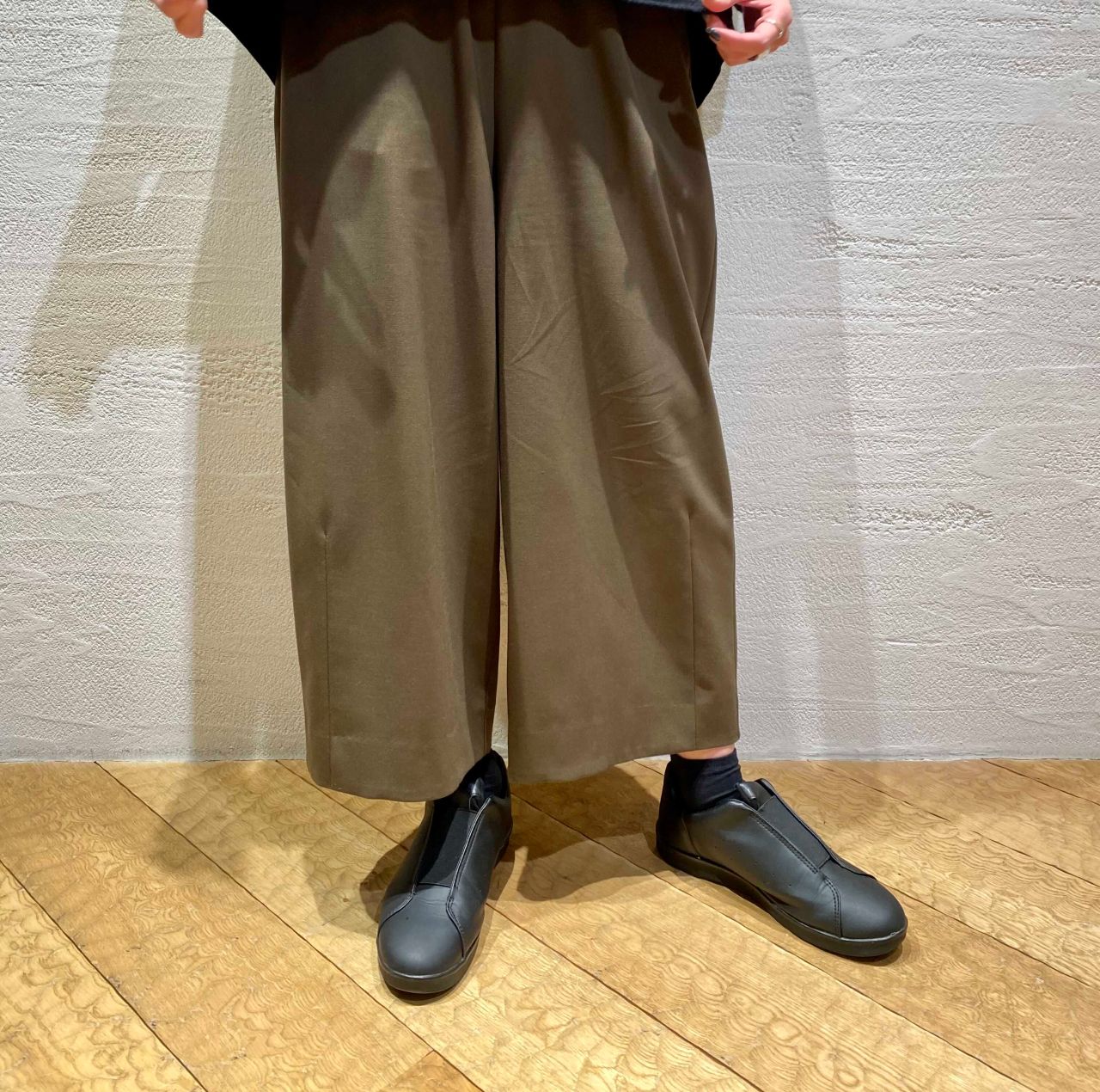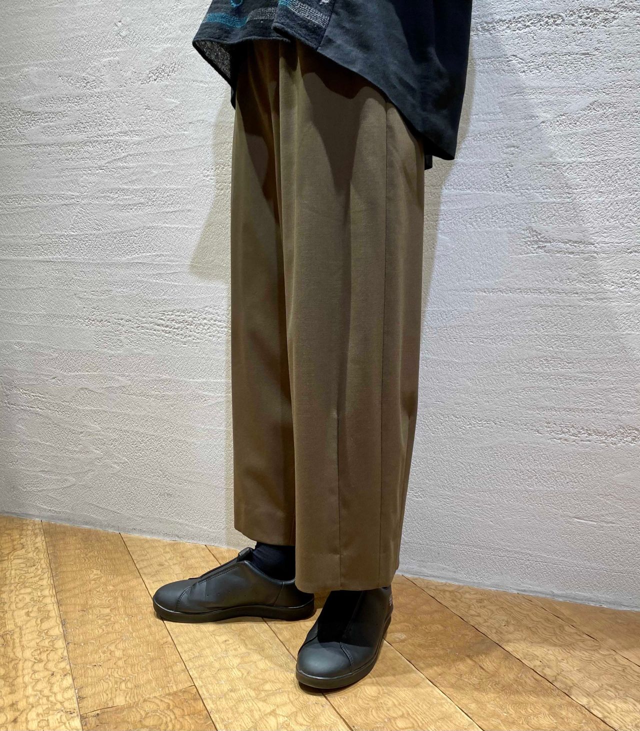 それに合わせた裾にダーツが入ったコクーンシルエットのパンツは、綺麗めにもカジュアルなテイストにも合わせやすい万能パンツ。