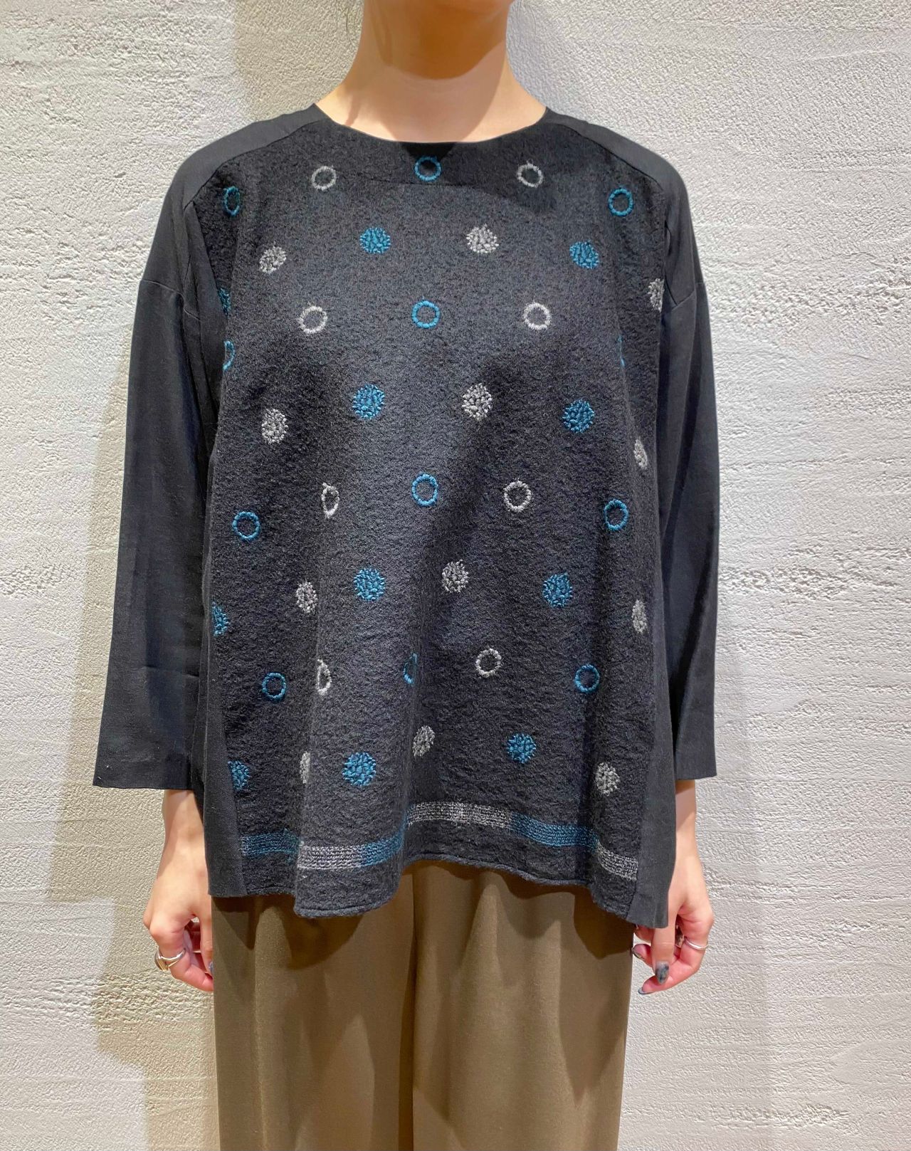 2色のリング刺繍がポイントのスキッパーブラウス。