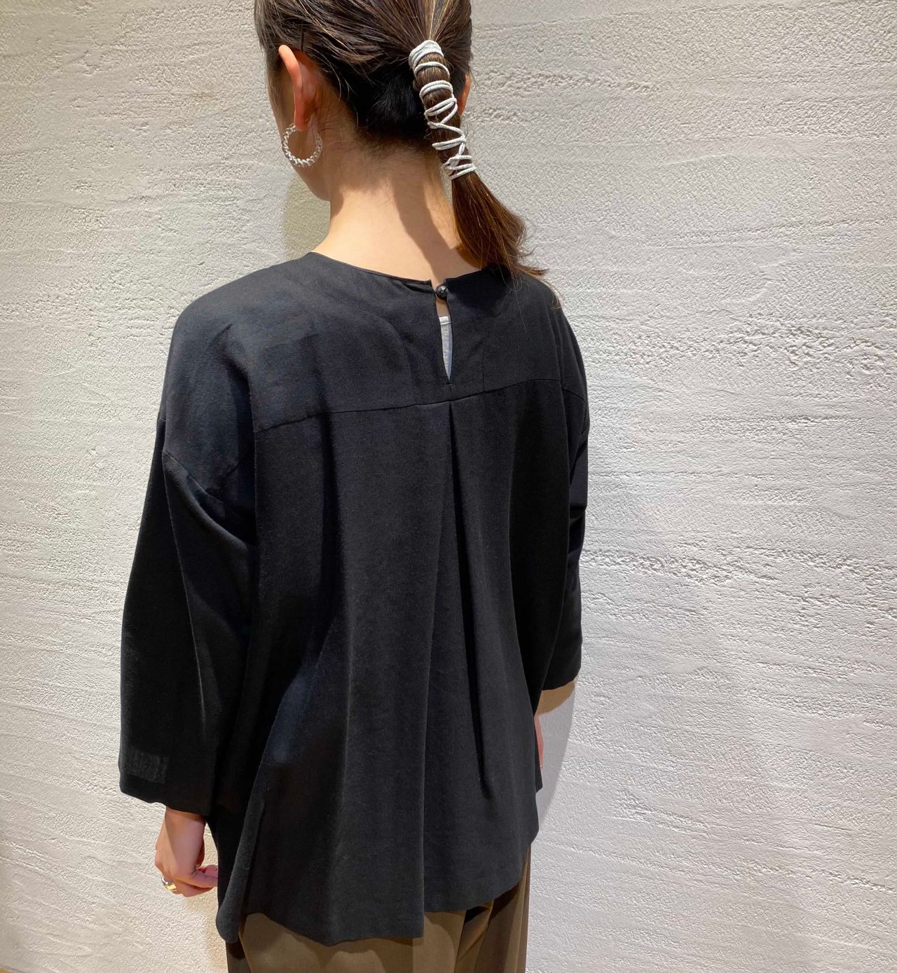 丈を後ろに向かって長くし、背中にタックを入れることでふんわりと広がるシルエットが優しい雰囲気のブラウスです。