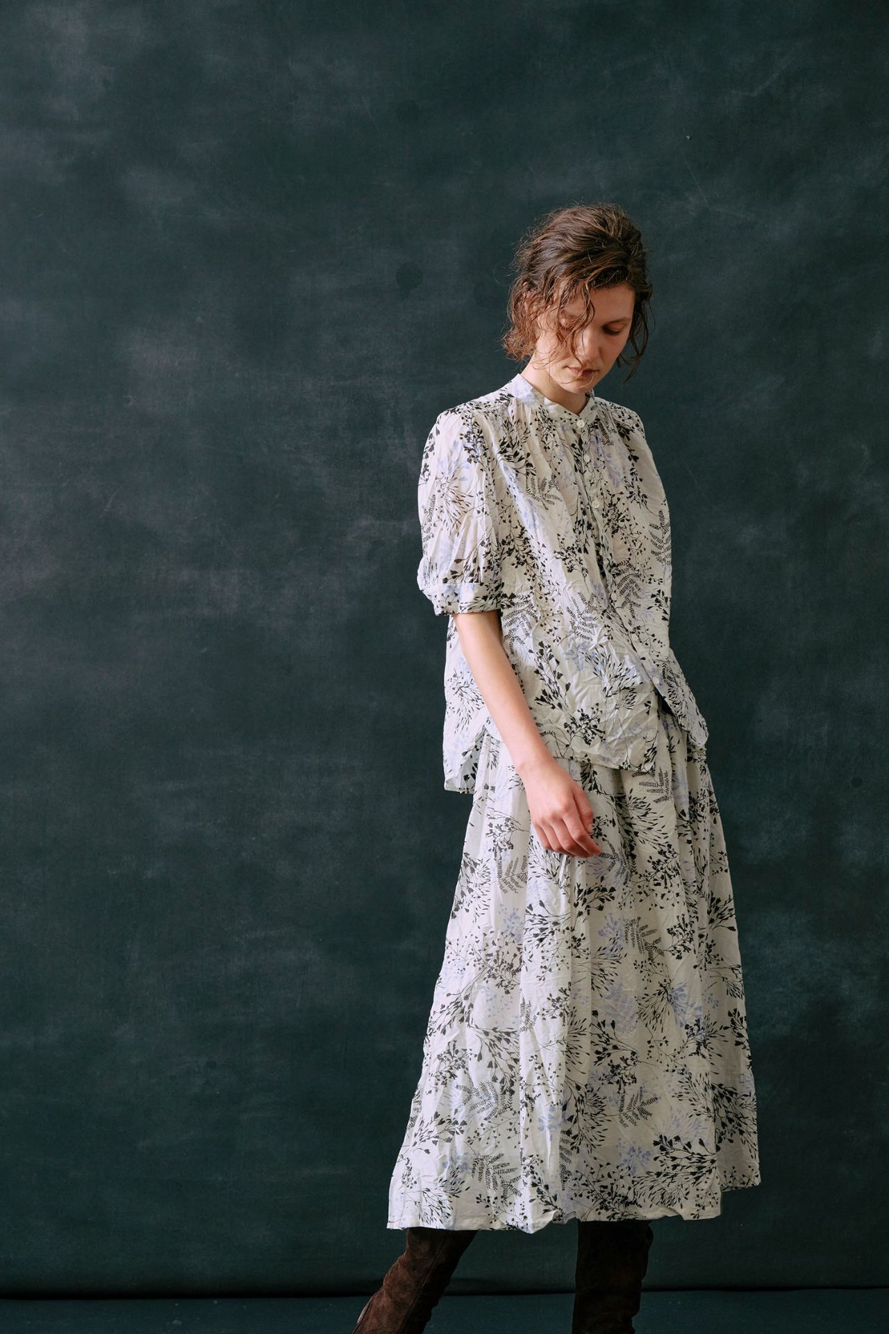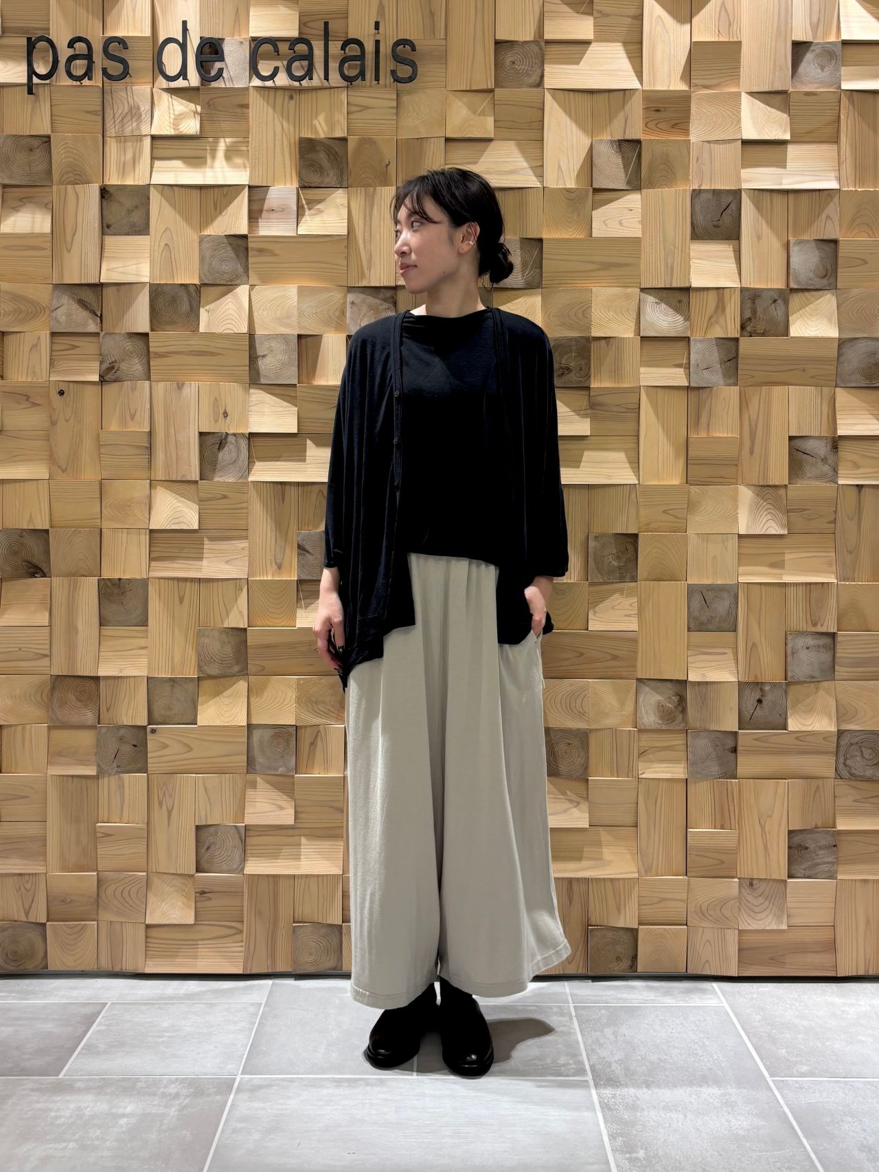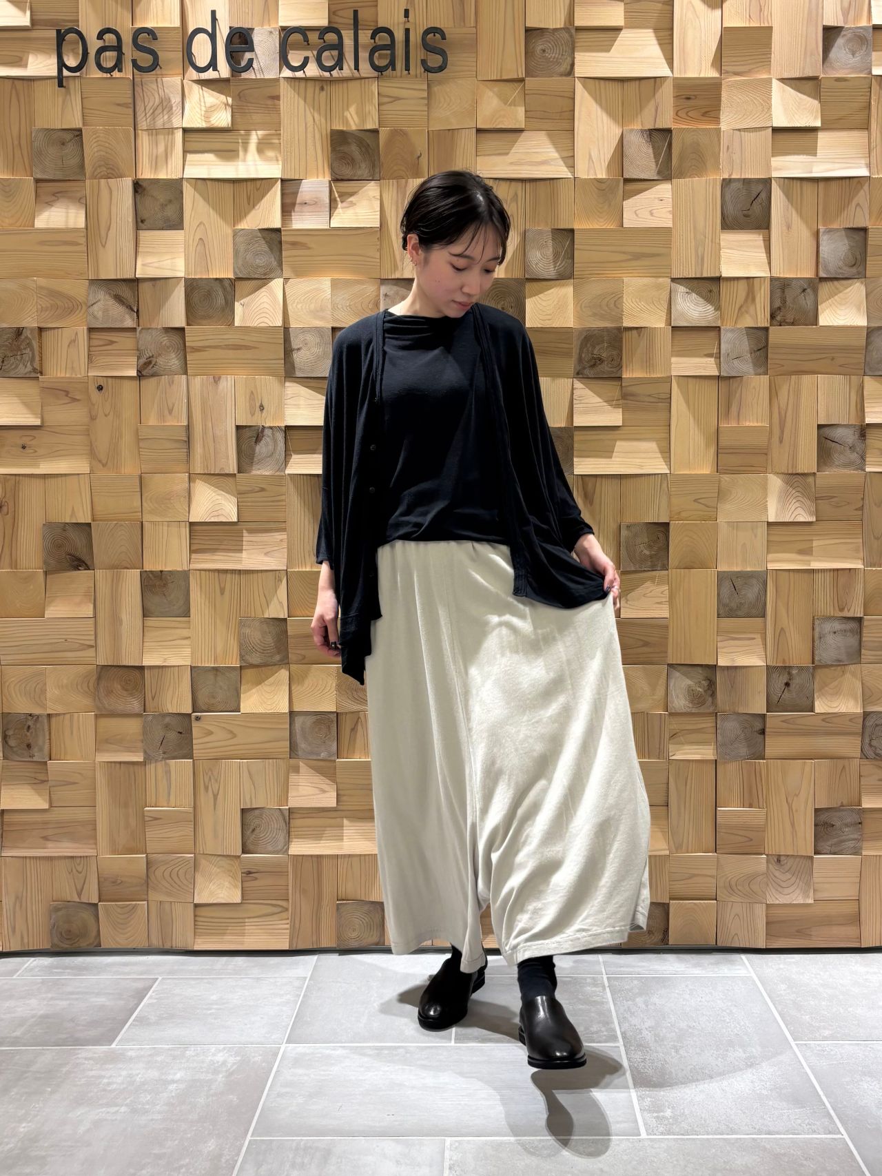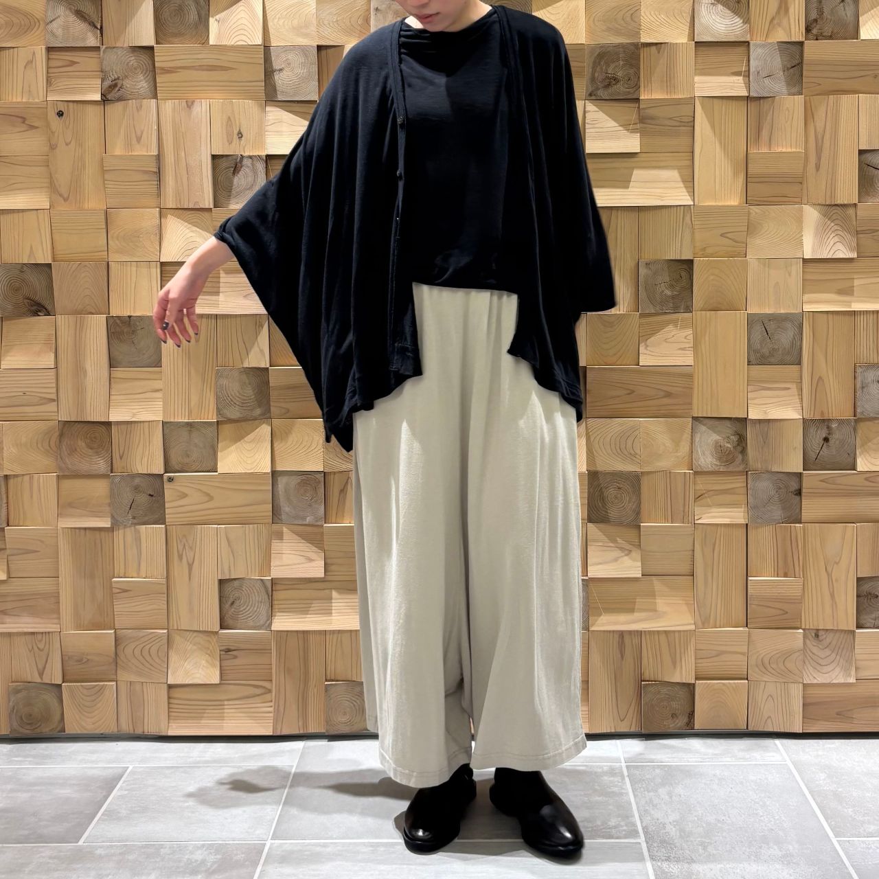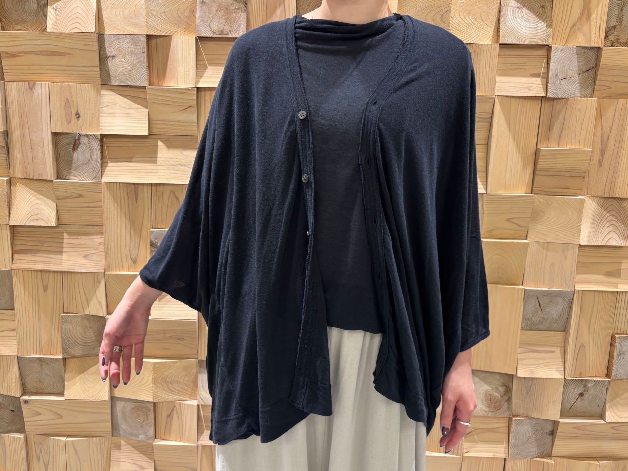 ポンチョのようなたっぷりシルエットのカーディガンと、フレンチスリーブのアンサンブルコーディネート。