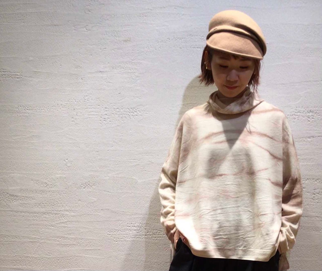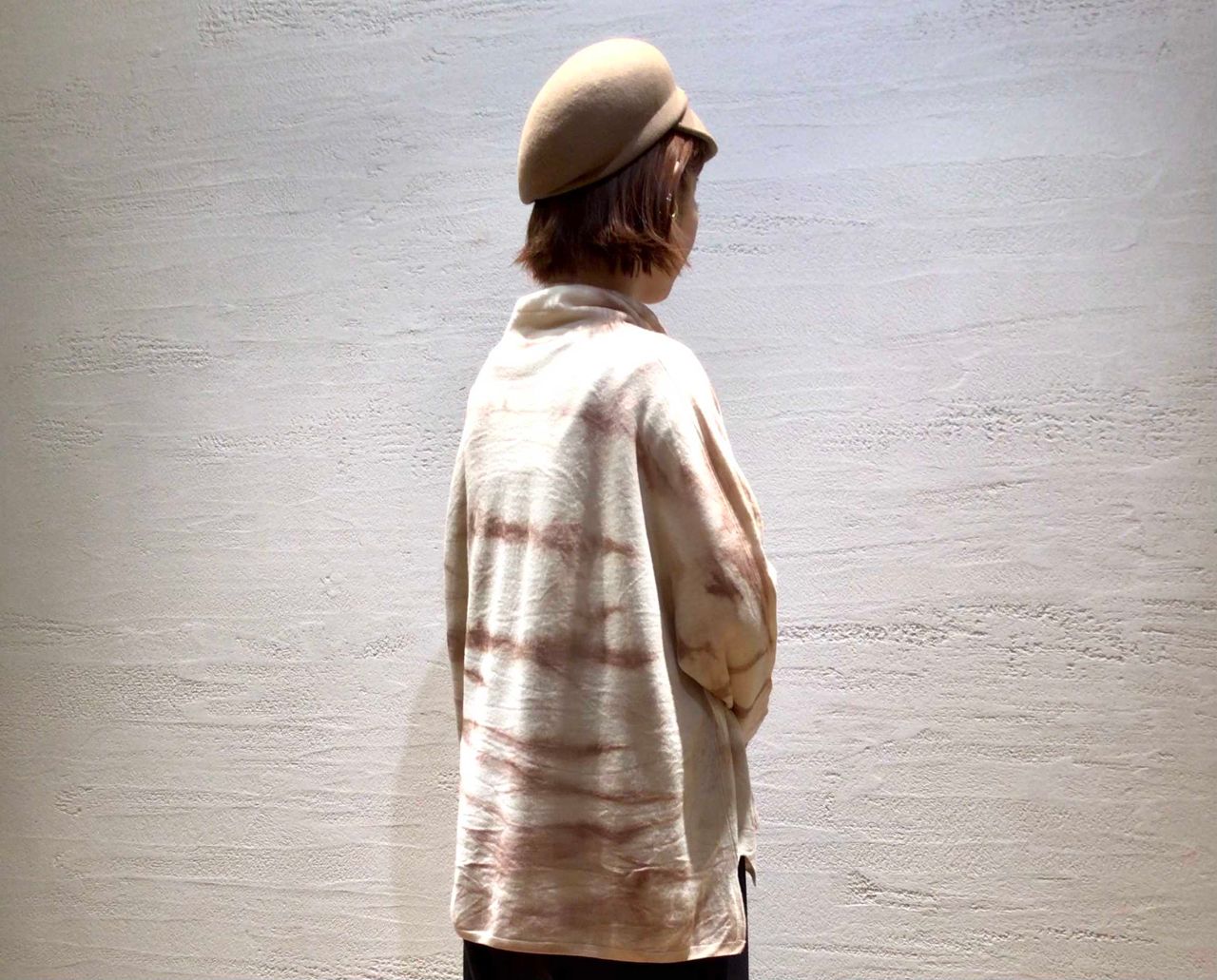 独特なムラ染めがポイントのゆったりとしたハイネックプルオーバーです。