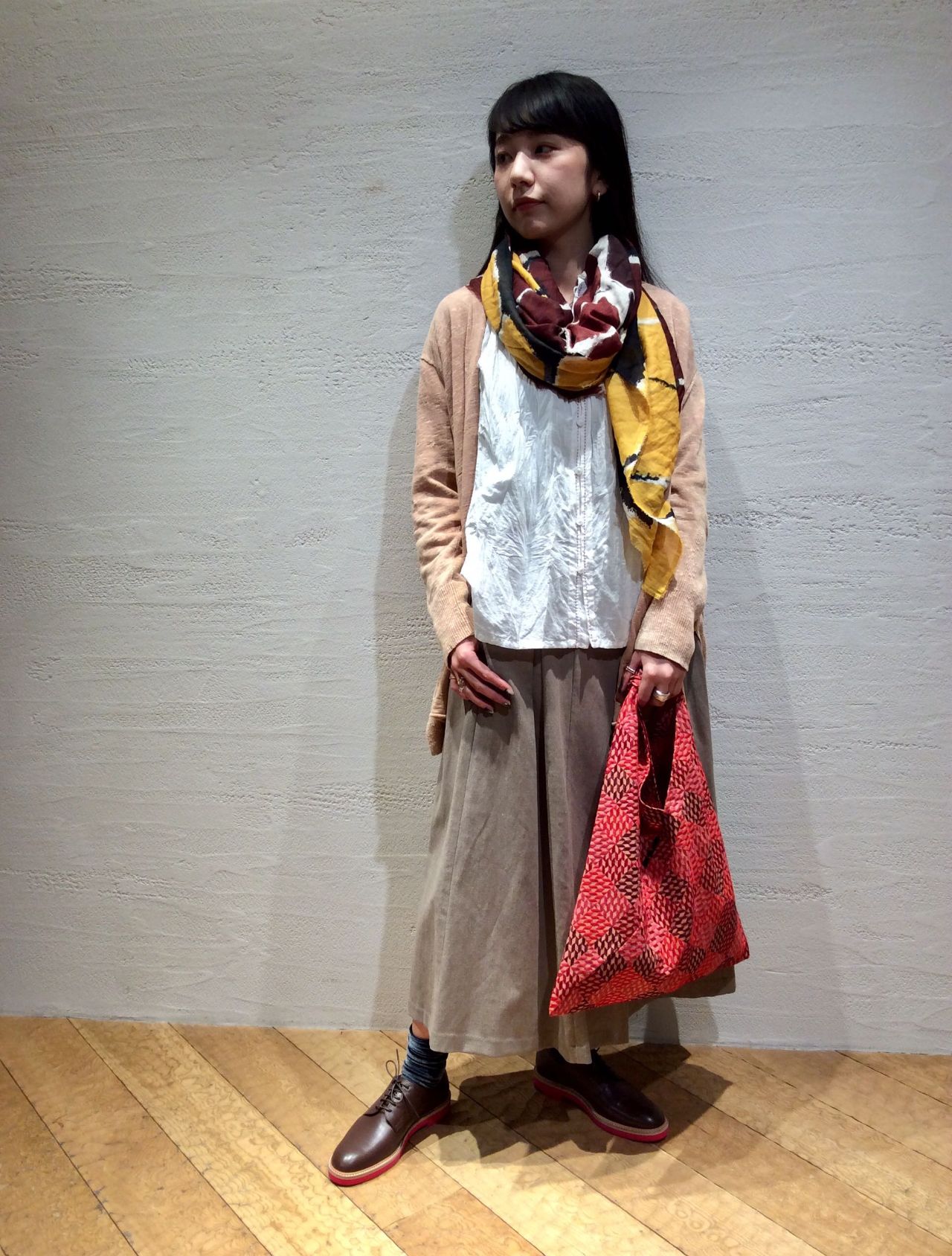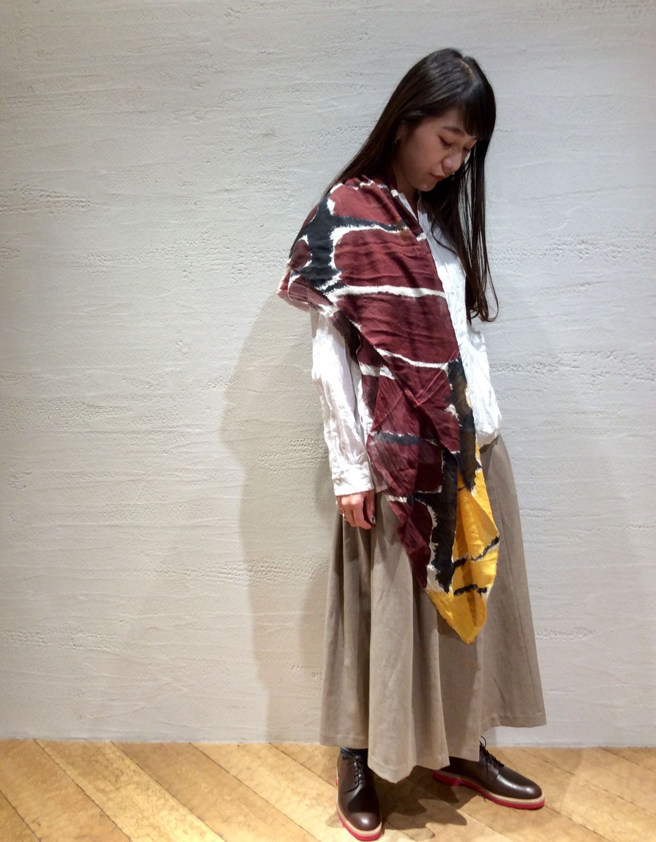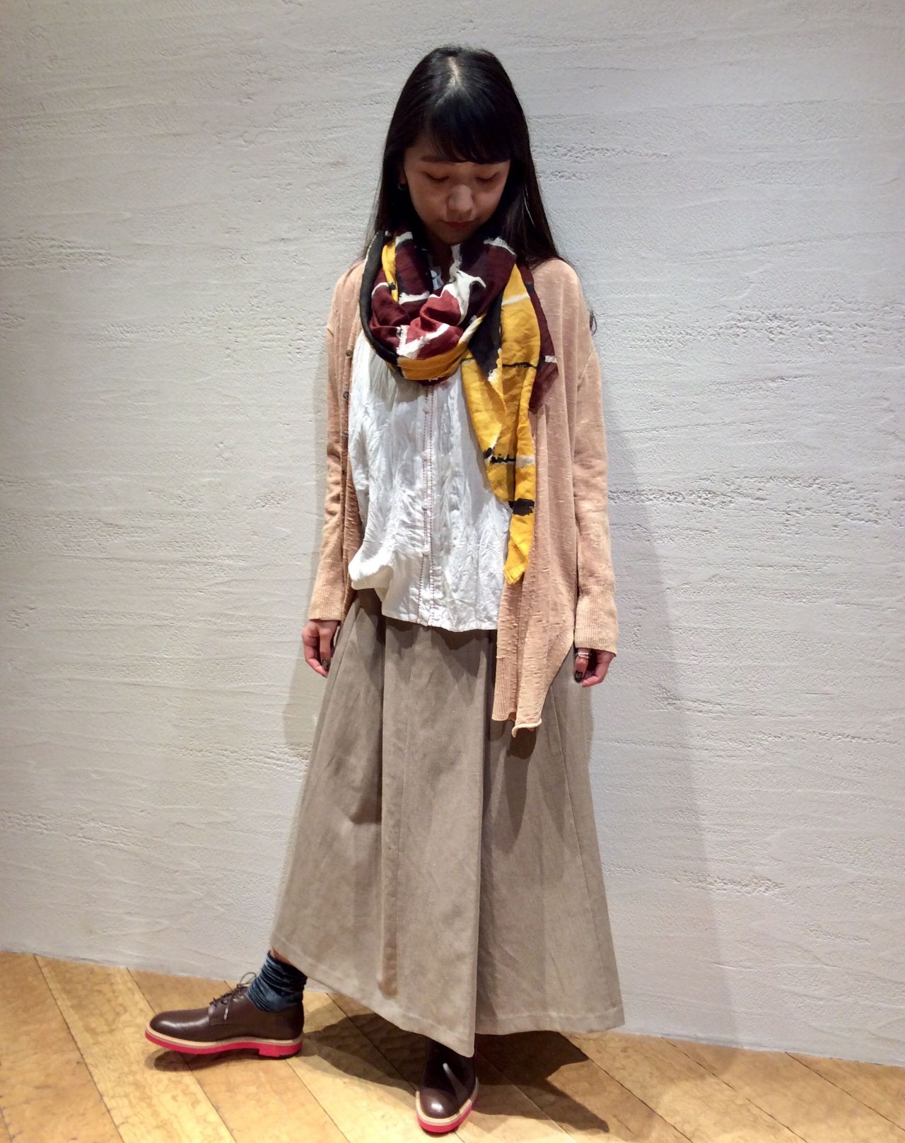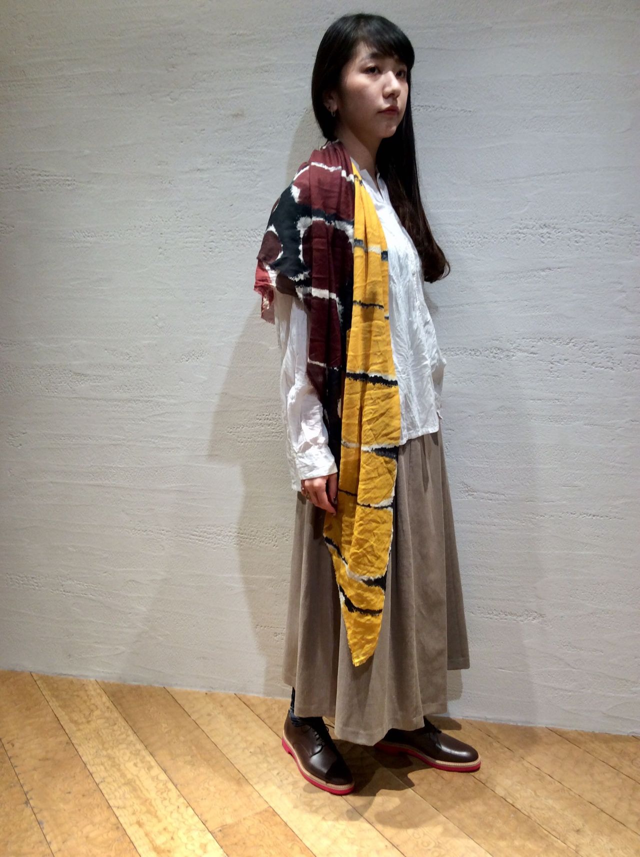 合わせたスカートは前重ね、裾が広がったシルエット。
